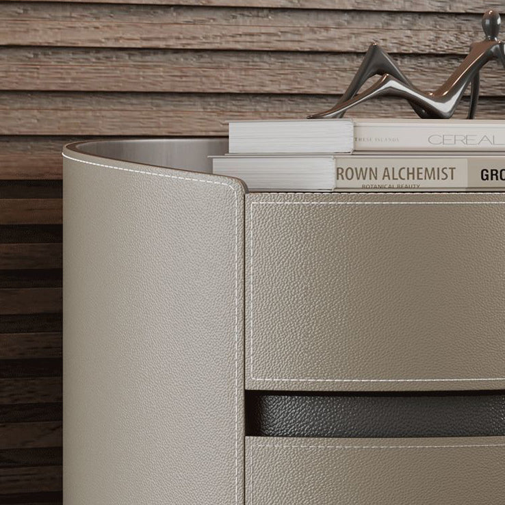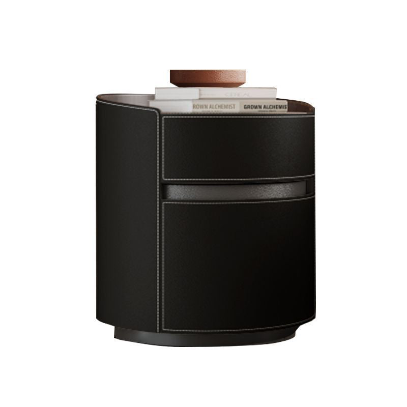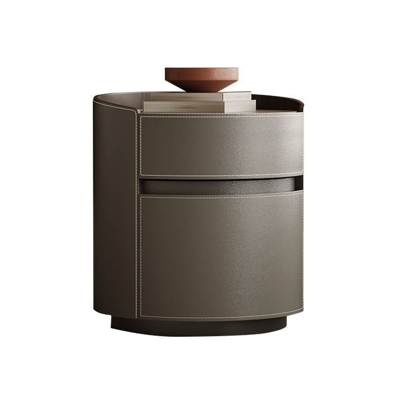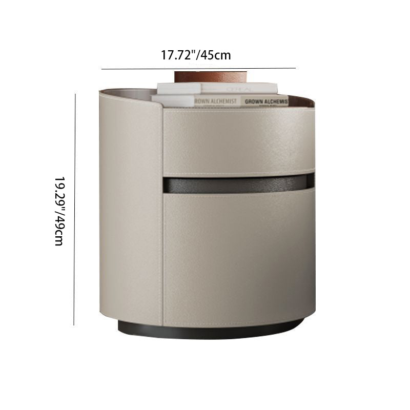Crafted from premium saddle leather and solid wood, this traditional vintage round cylinder nightstand offers two spacious drawers with smooth soft-close glides. Available in taupe, beige, dark gray, and black, it combines large-capacity storage with waterproof, dustproof, and stain-resistant durability for a timeless bedroom upgrade.