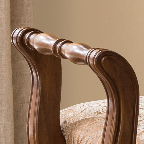 This vintage-style solid wood vanity stool features a square padded seat with elegant patterned fabric upholstery in brown. Designed with a low backrest for added comfort, it is perfect for bedrooms and versatile enough for use as a dressing stool, piano bench, or shoe-changing seat.