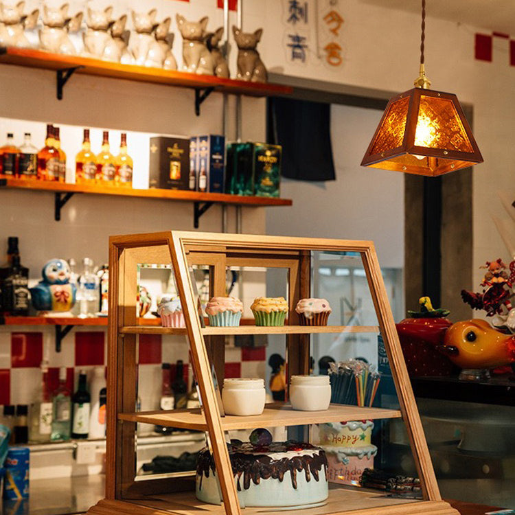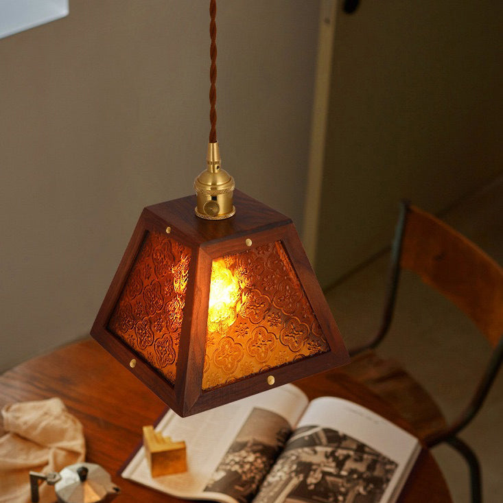 Traditional Vintage Solid Wood Flower Patterned Begonia Glass Shade 1-Light Pendant Light For Living Room