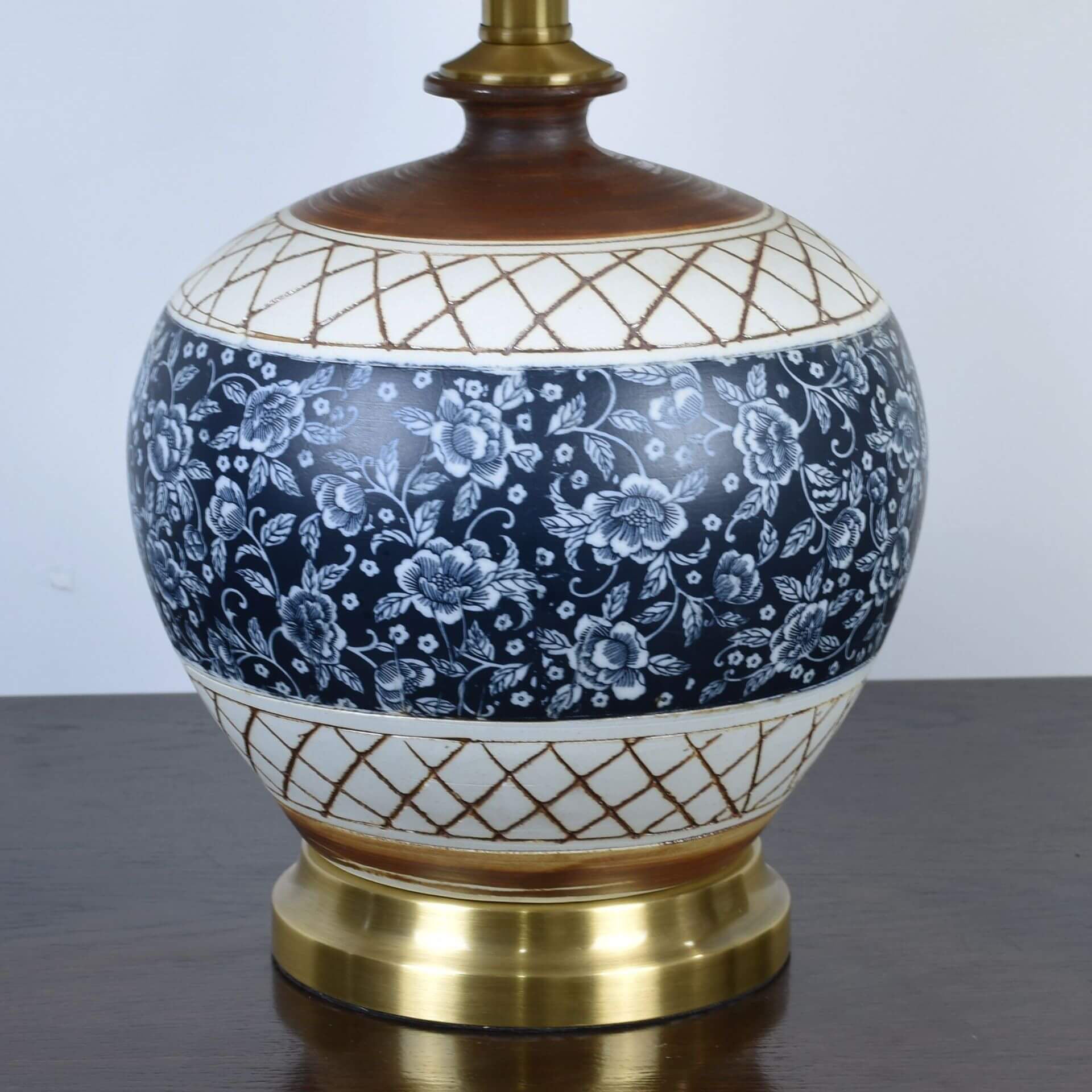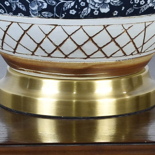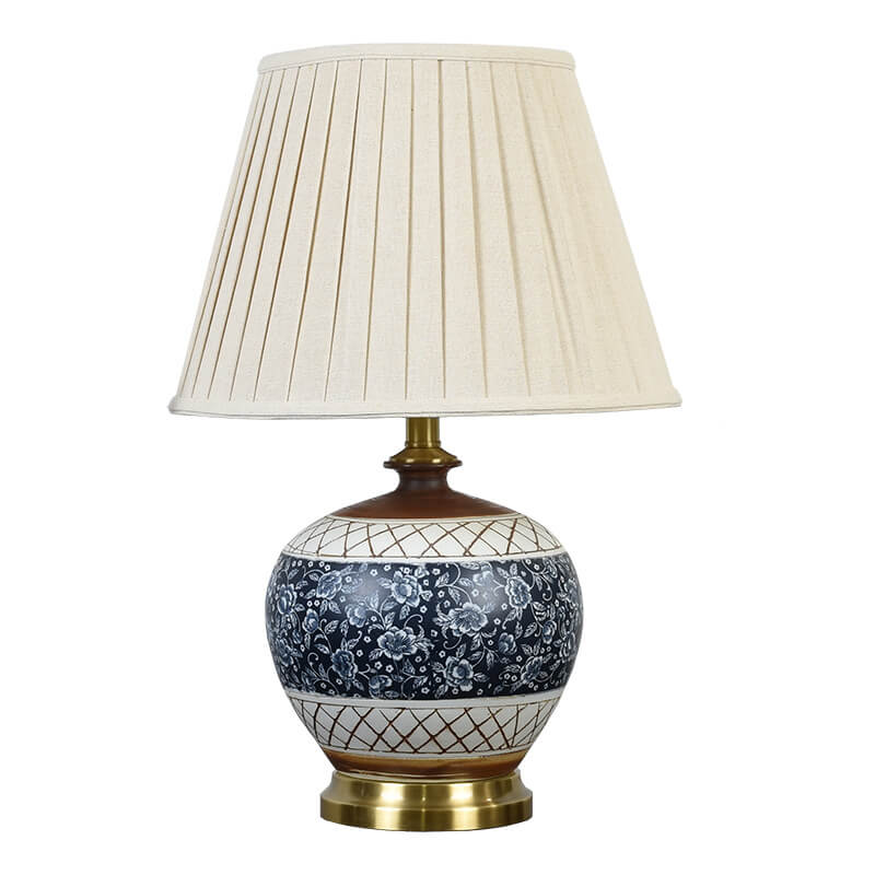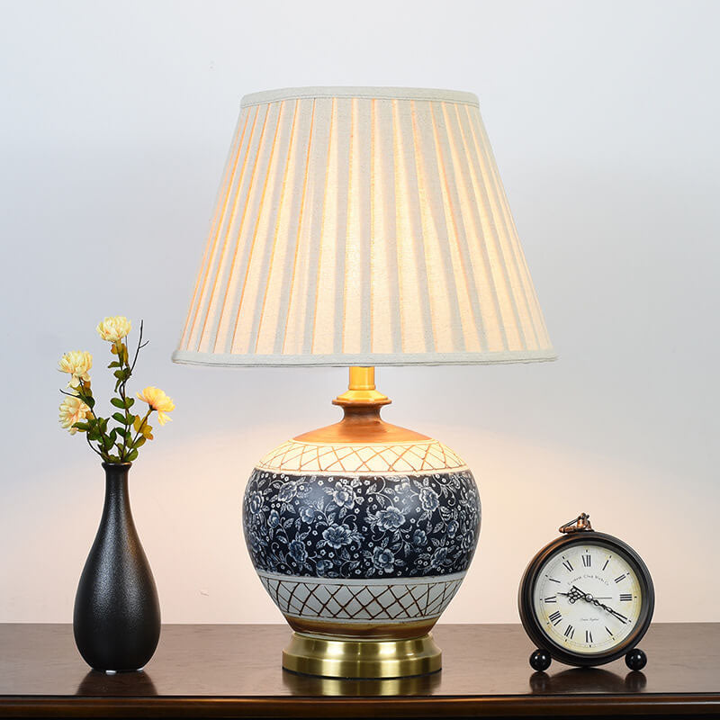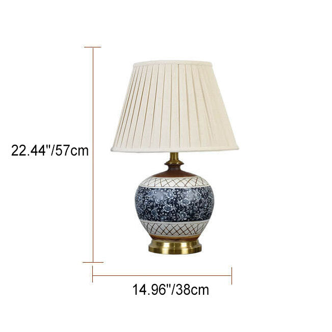 Vintage Chinese Round Ceramic Print Pleated Lampshade 1-Light Table Lamp
