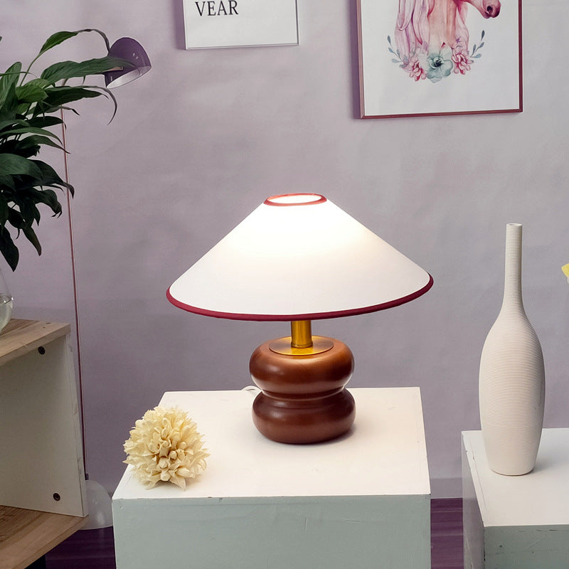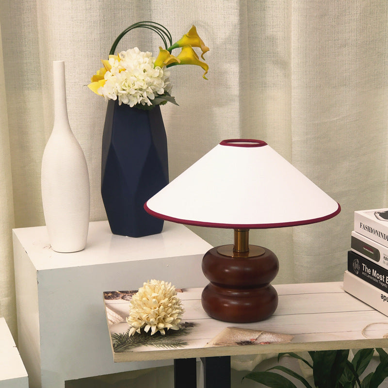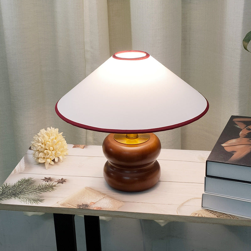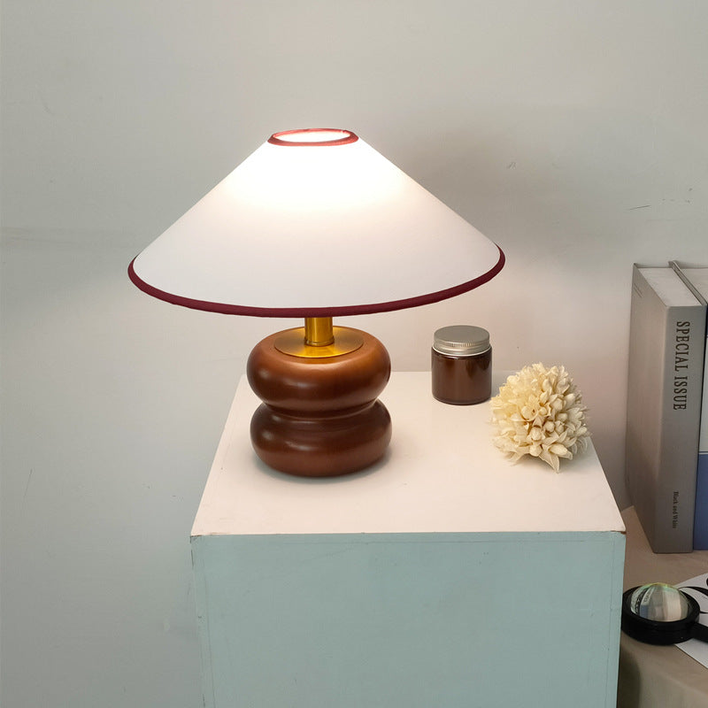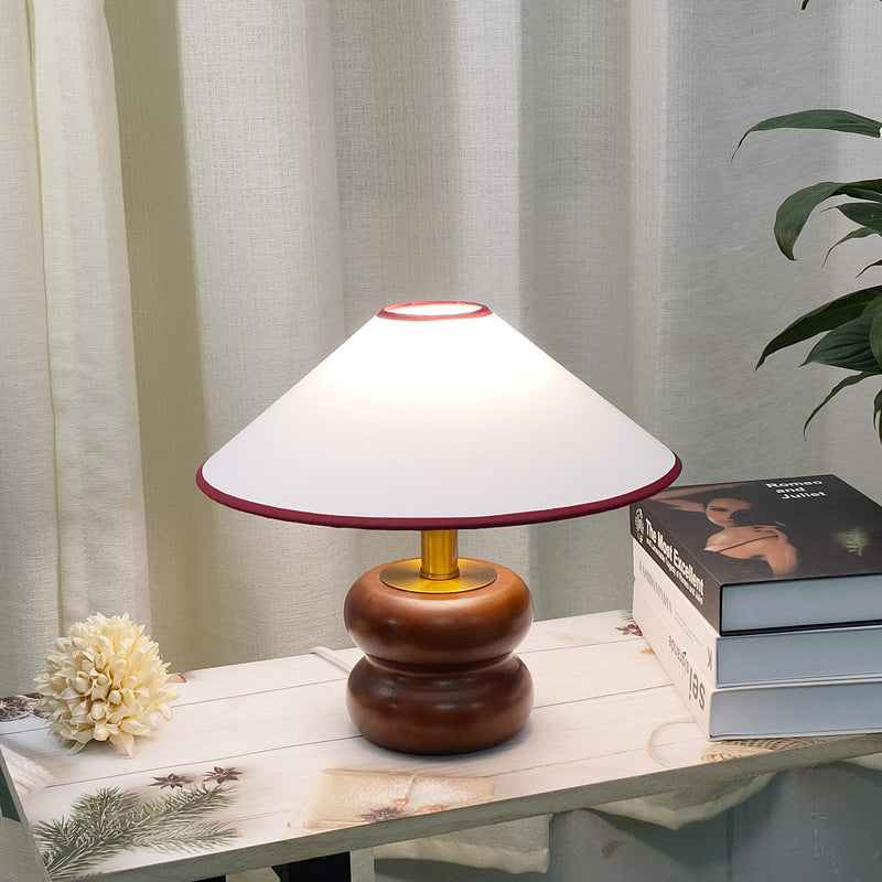 Vintage Fabric Cone Solid Walnut Round Base 1-Light Table Lamp