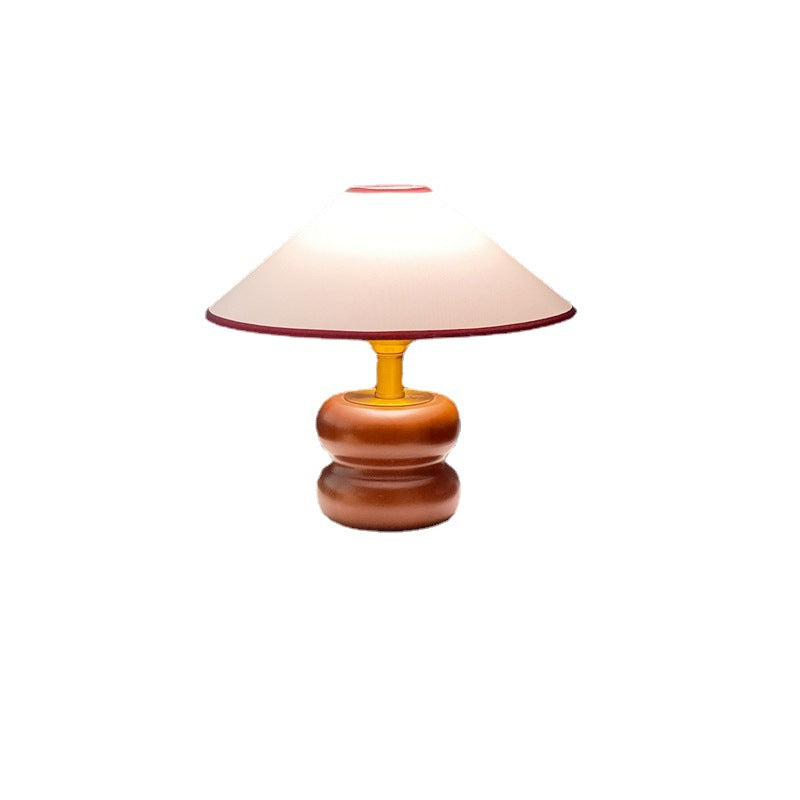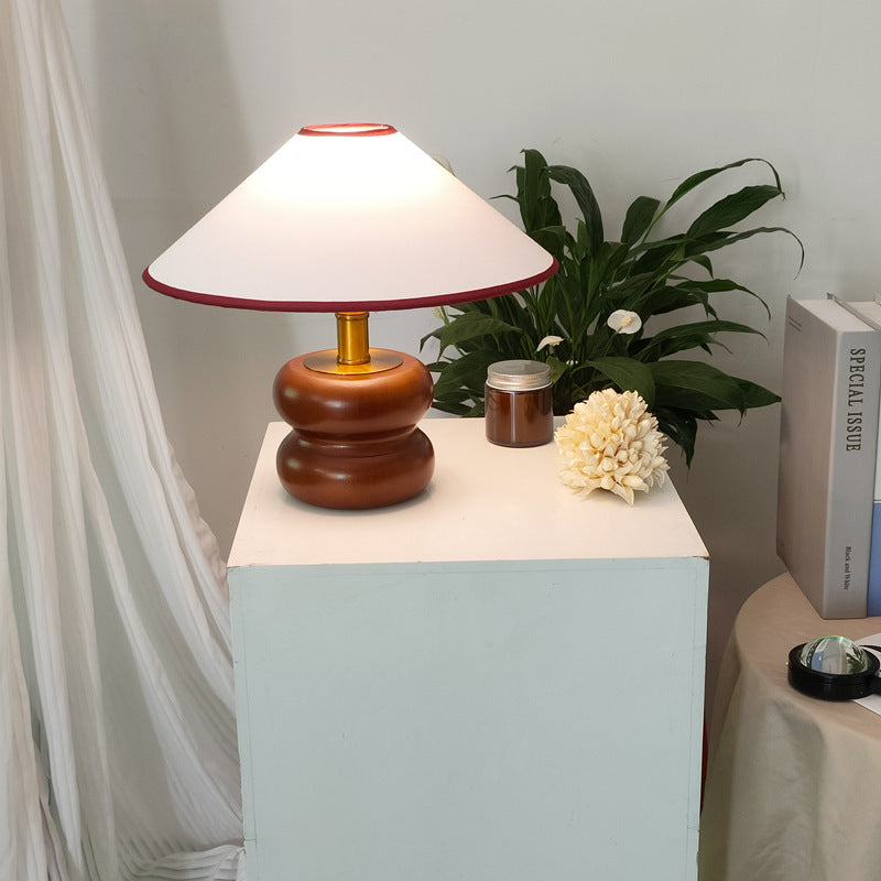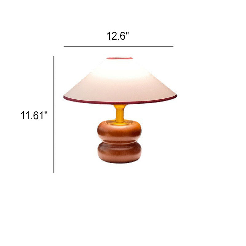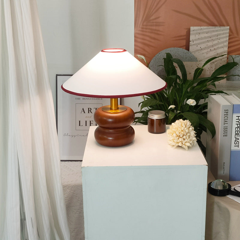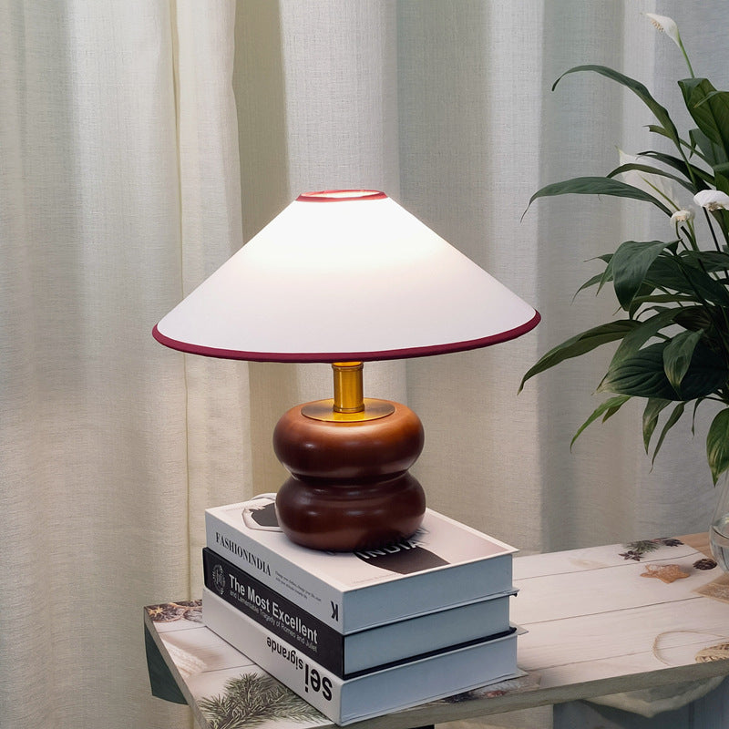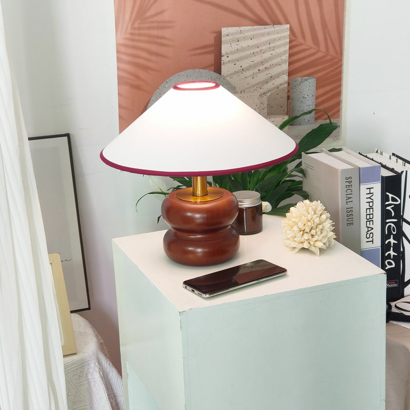 Vintage Fabric Cone Solid Walnut Round Base 1-Light Table Lamp
