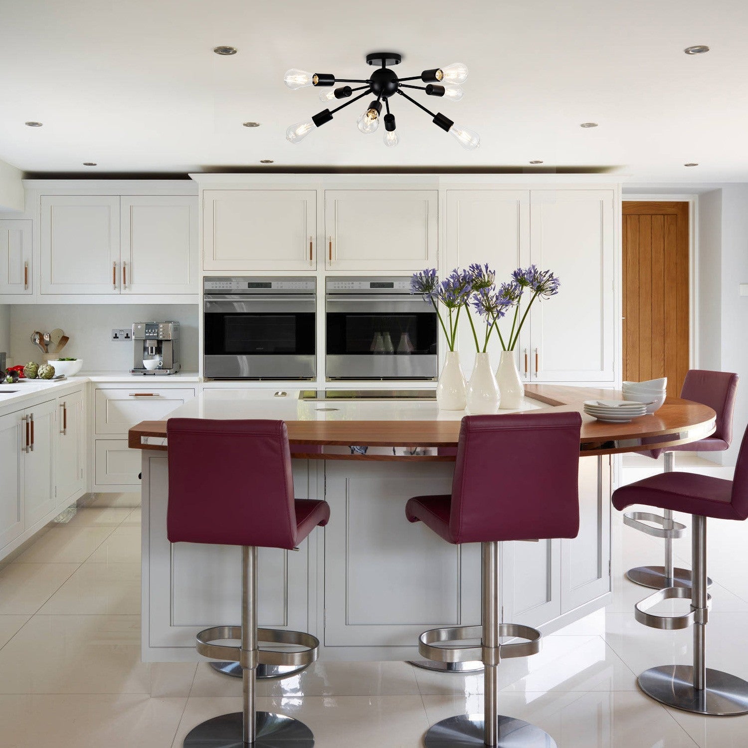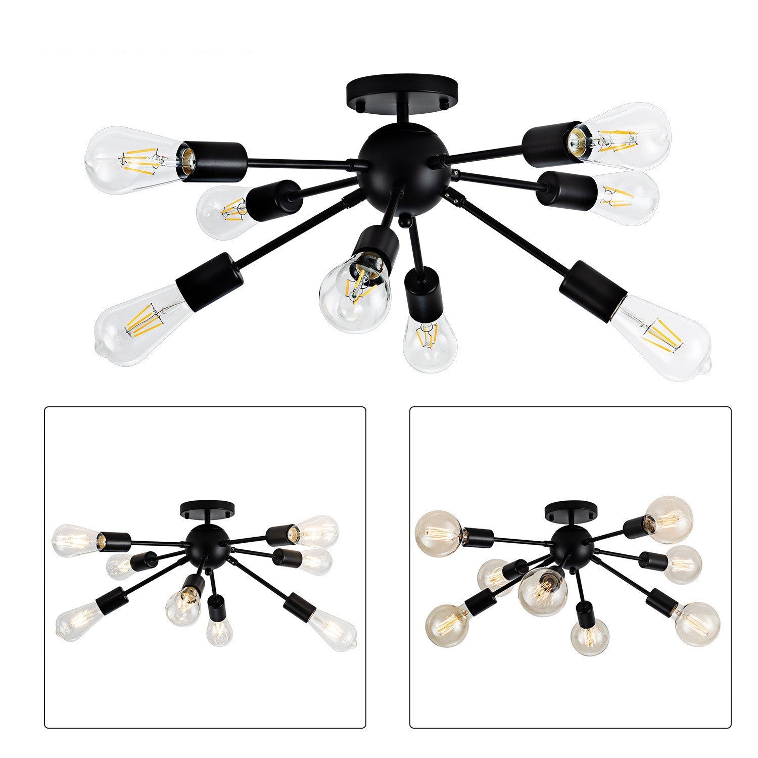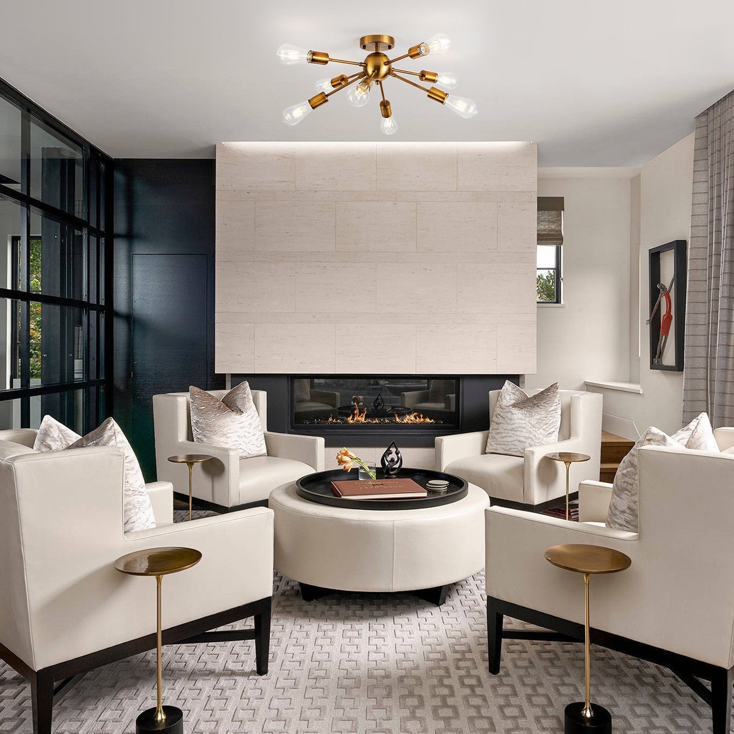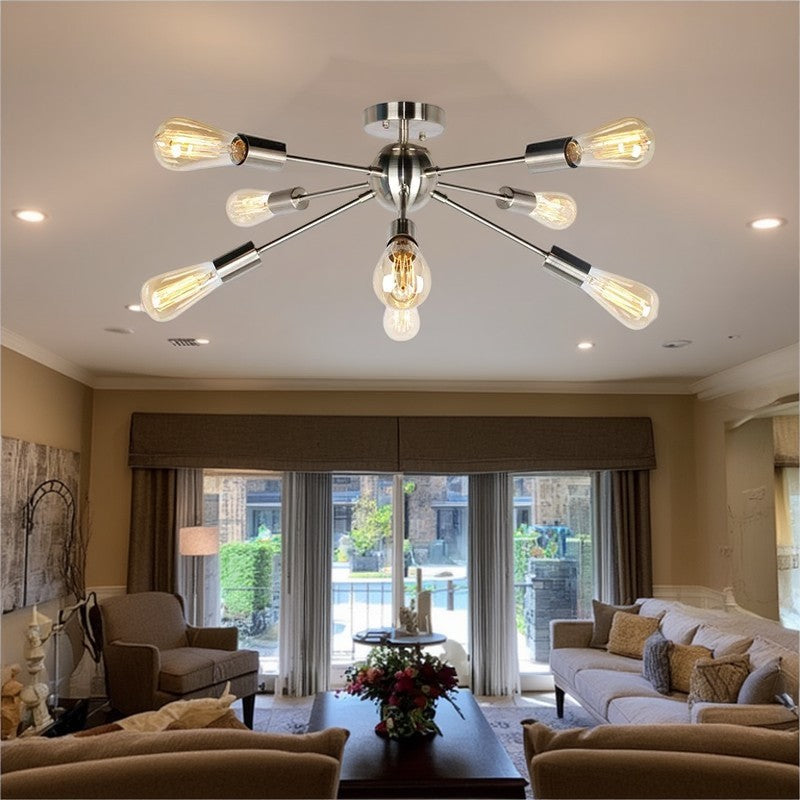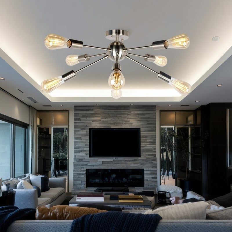 Elevate your living room with this unique contemporary industrial semi-flush mount ceiling light. Featuring a striking branch-satellite design, this fixture comes in black, gold, or chrome finishes and provides ample illumination with its 8-light setup. A perfect blend of style and function for modern spaces.