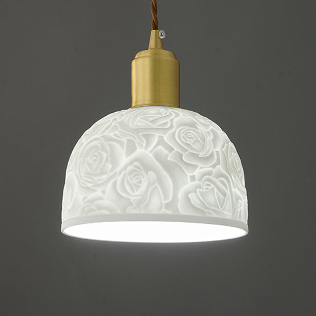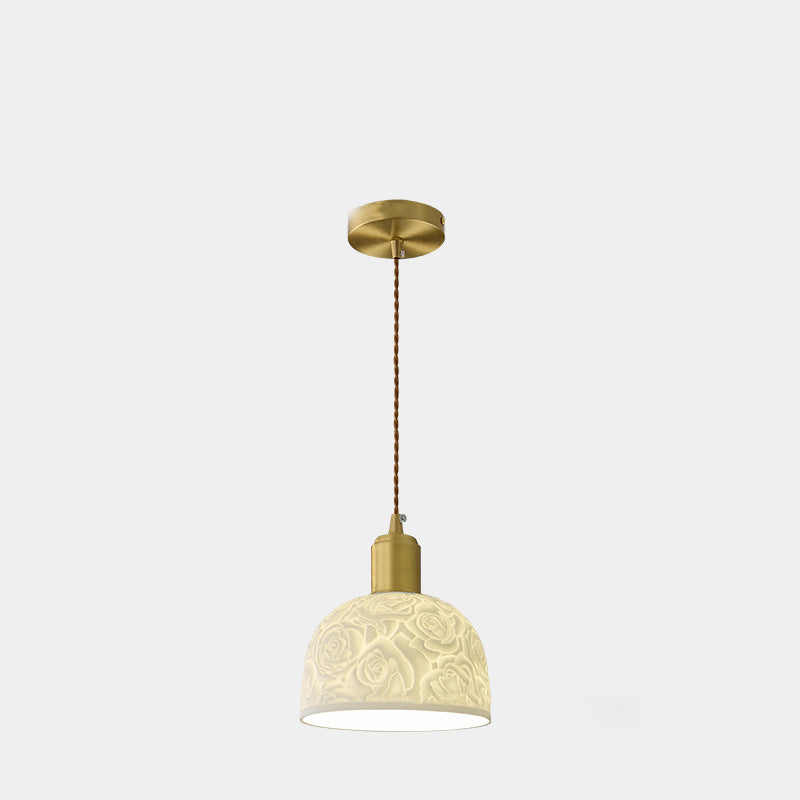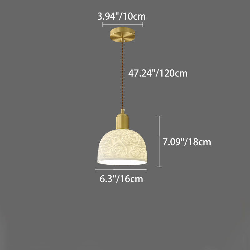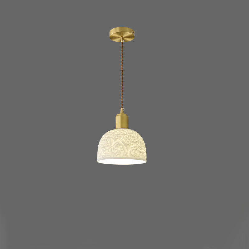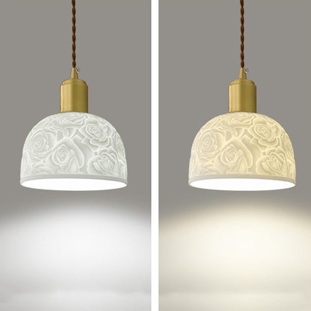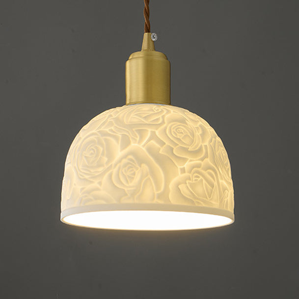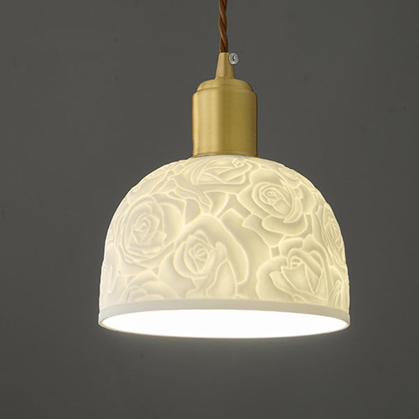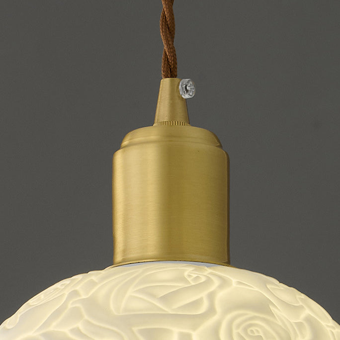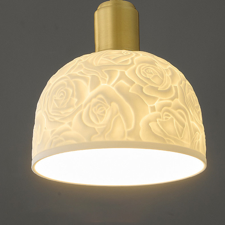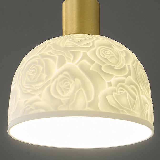 Contemporary Nordic Rose Pattern Ceramic Shade Brass 1-Light Pendant Light For Living Room