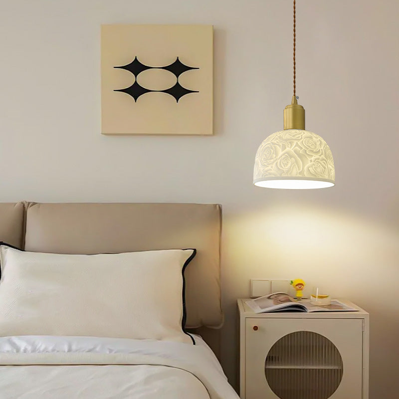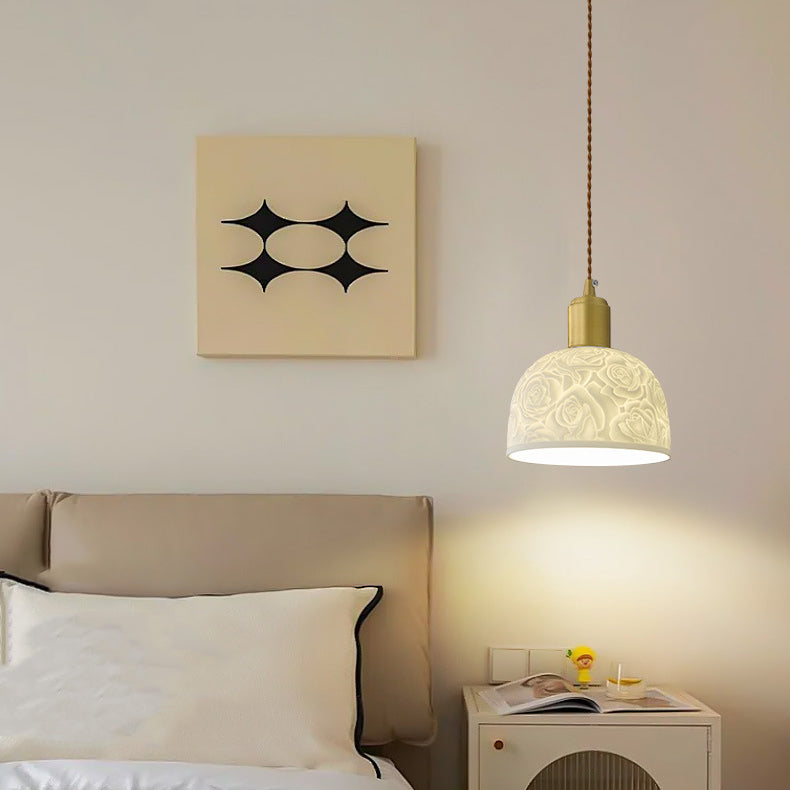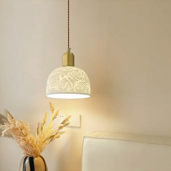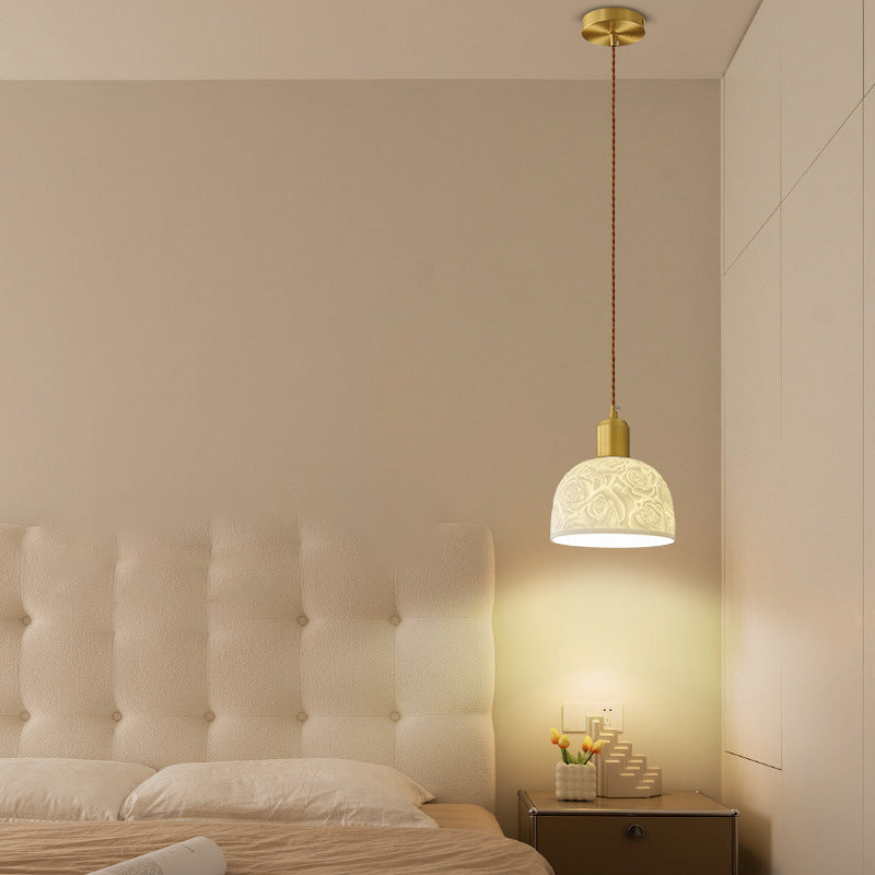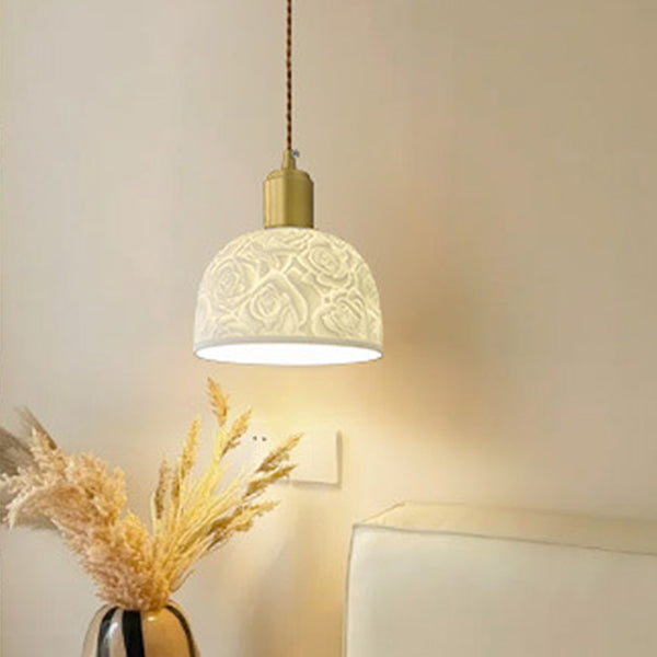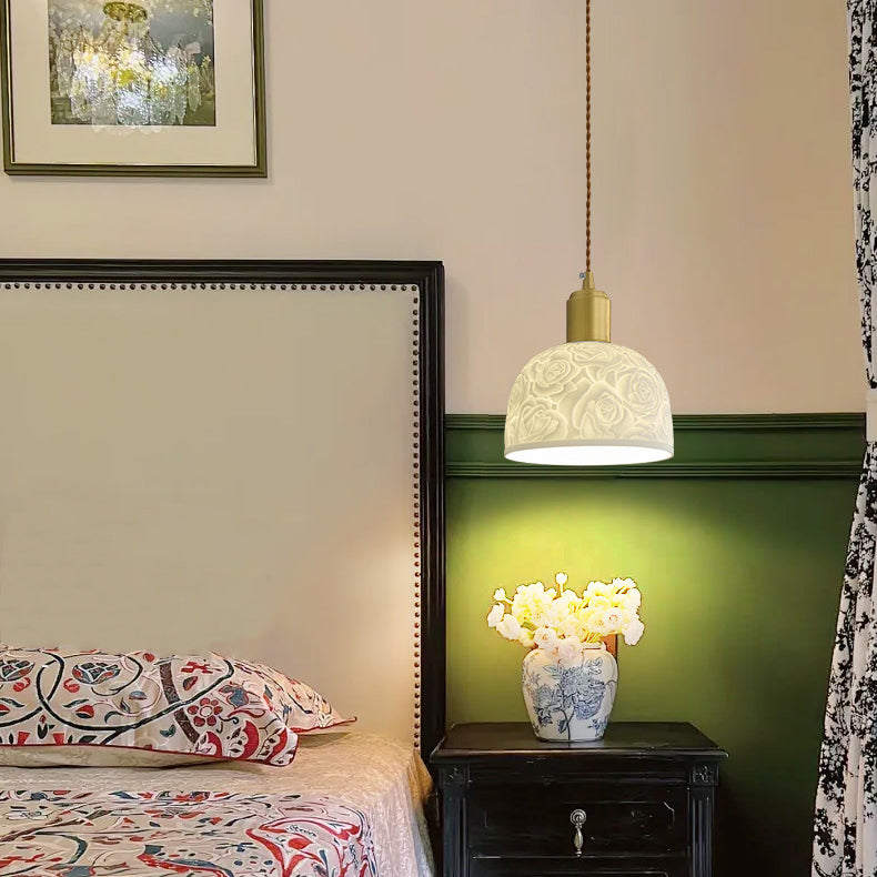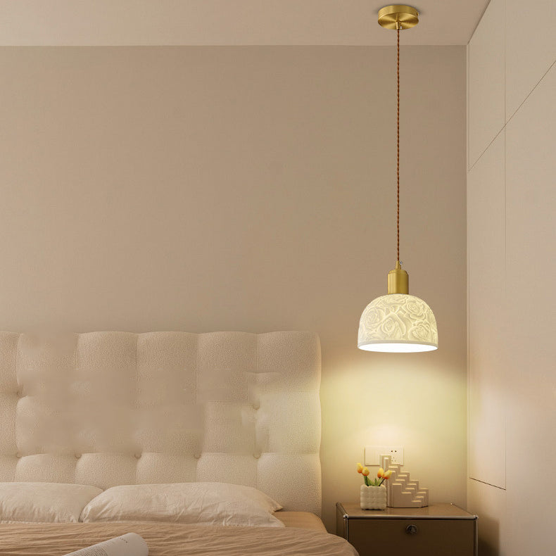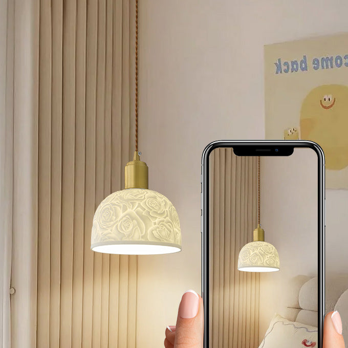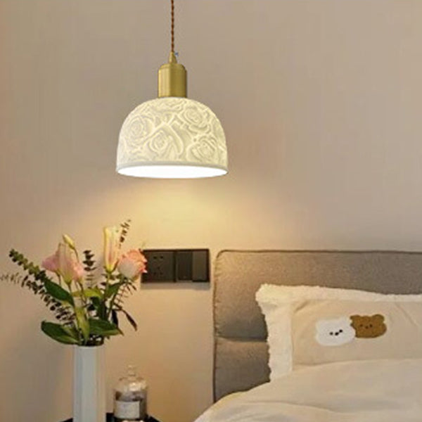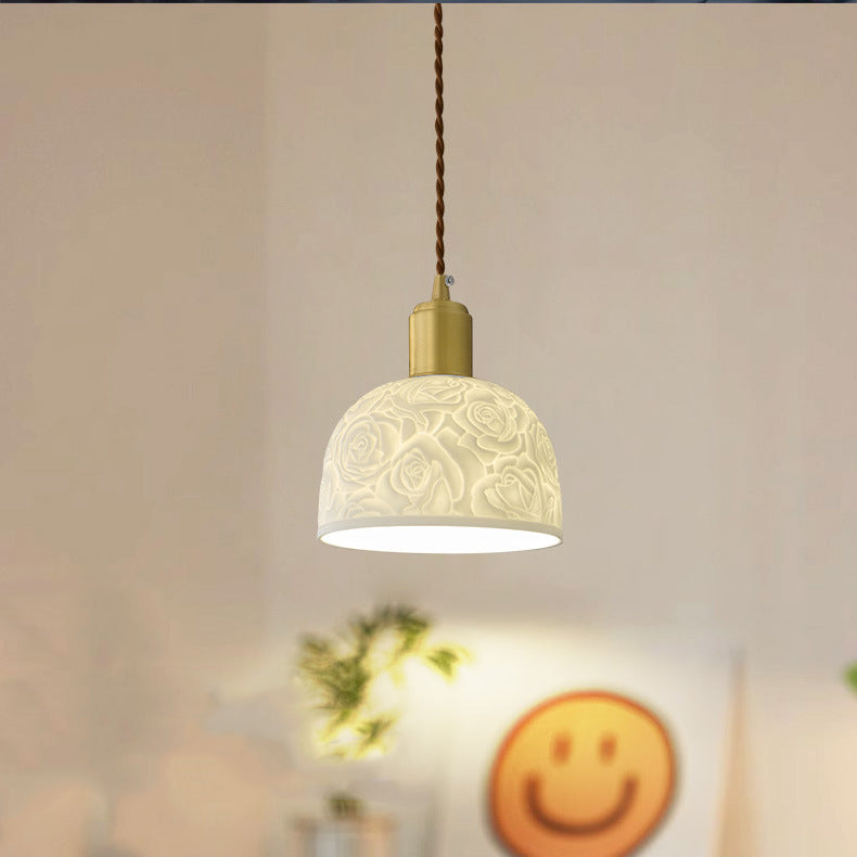 Contemporary Nordic Rose Pattern Ceramic Shade Brass 1-Light Pendant Light For Living Room