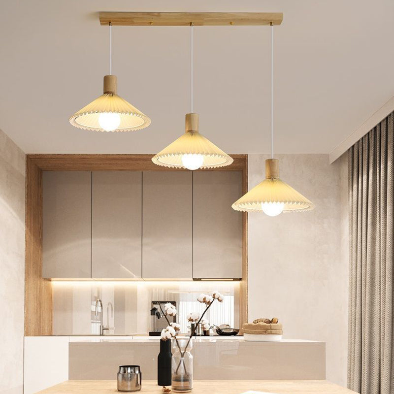 Contemporary Nordic Round Long Plate Conical Pleated Fabric Wood 3-Light Chandeliers For Living Room