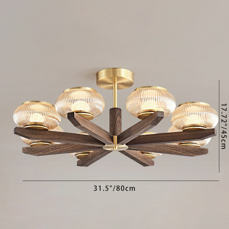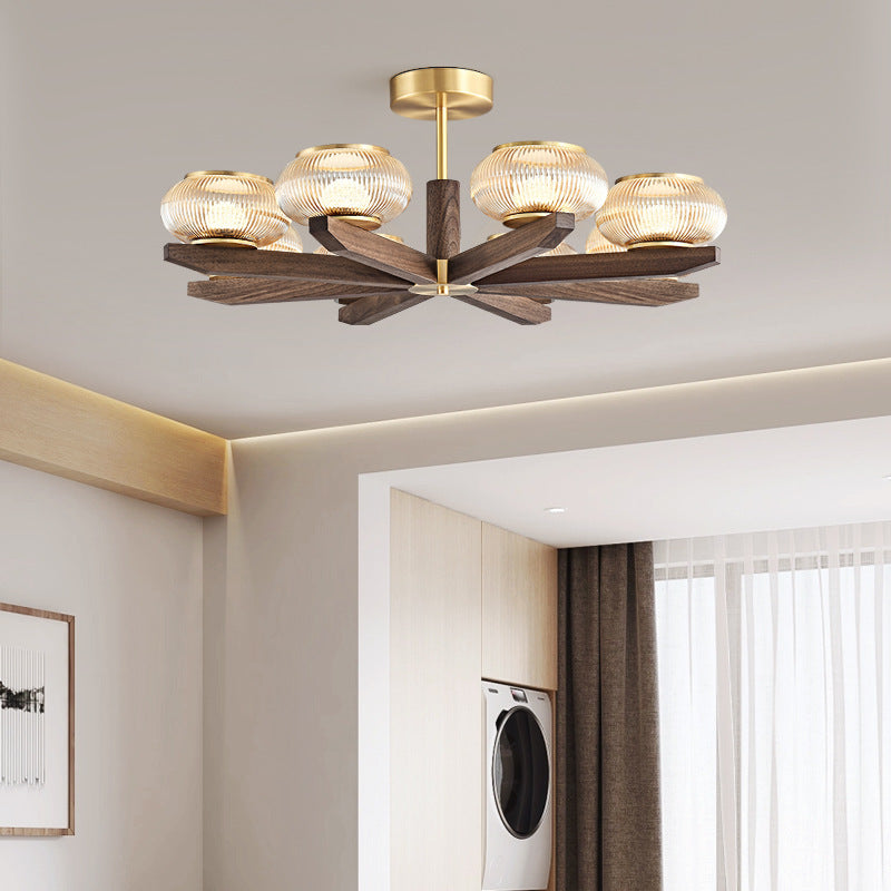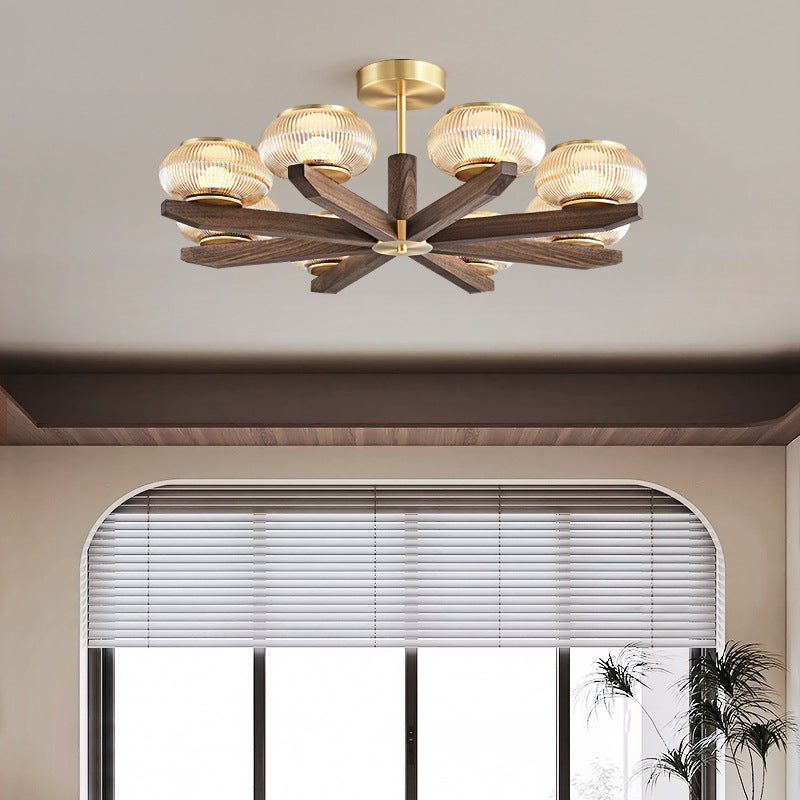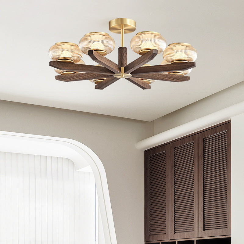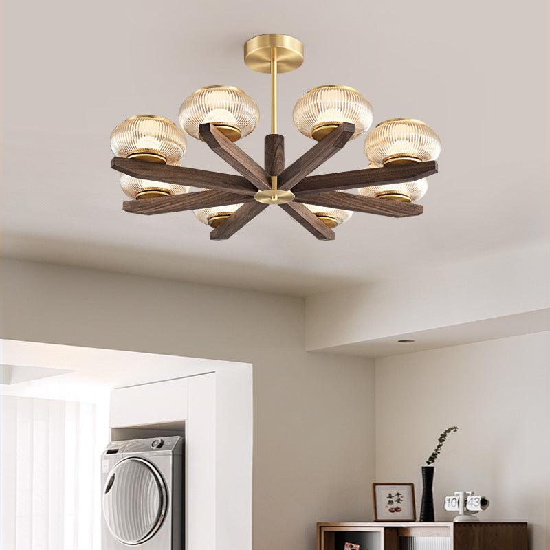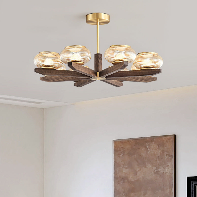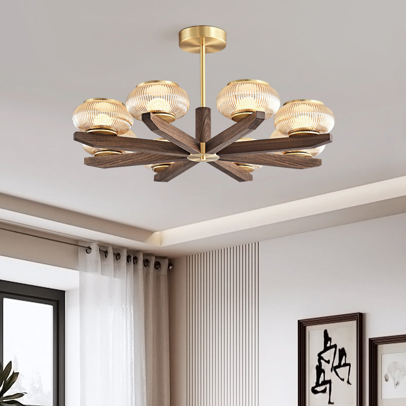 Contemporary Retro Dome Solid Wood Glass Lampshade Iron LED Chandelier For Living Room