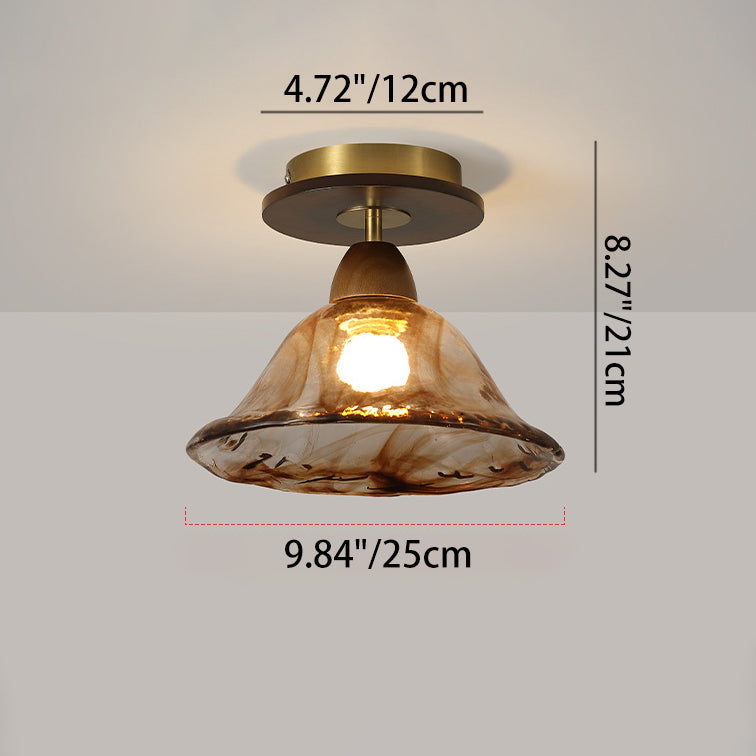 Contemporary Retro Metal Rubber Wood & Glass Bell Skirt 1-Light Semi-Flush Mount Ceiling Light For Hallway