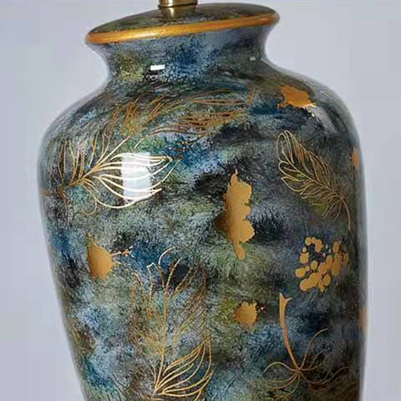 This handcrafted porcelain table lamp features a deep enamel-inspired glaze with delicate gold motifs—evoking the poetry of East Asian artistry. The gently pleated fabric shade softens the light, casting a warm and calming glow over your space.