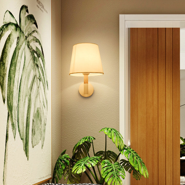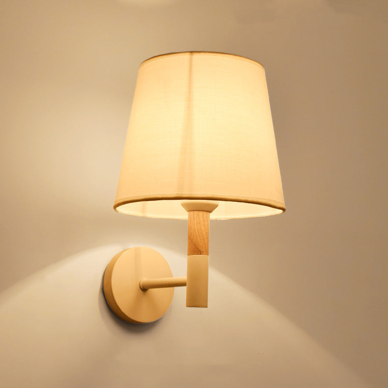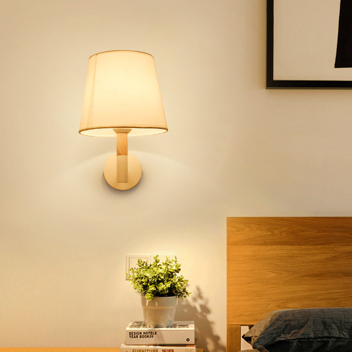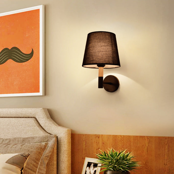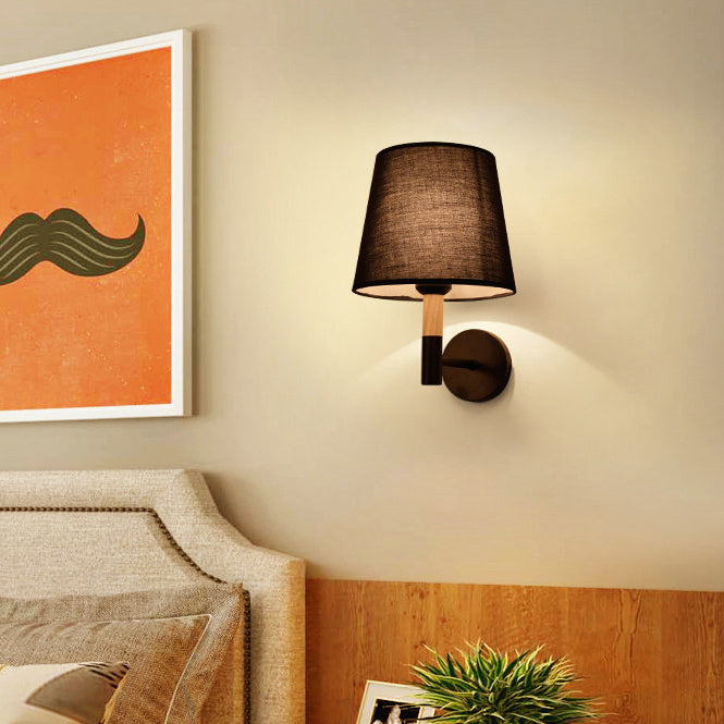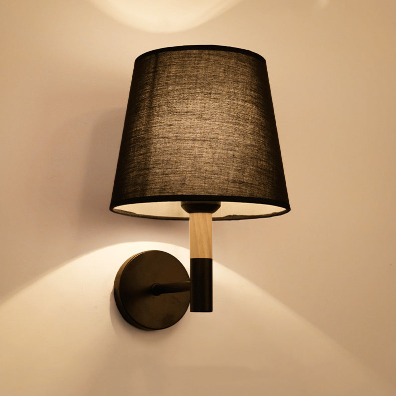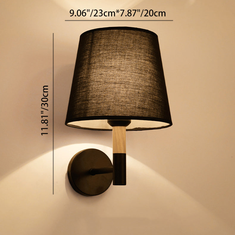 Modern Minimalist Iron Wood Fabric Round 1-Light Wall Sconce Lamp For Bedroom