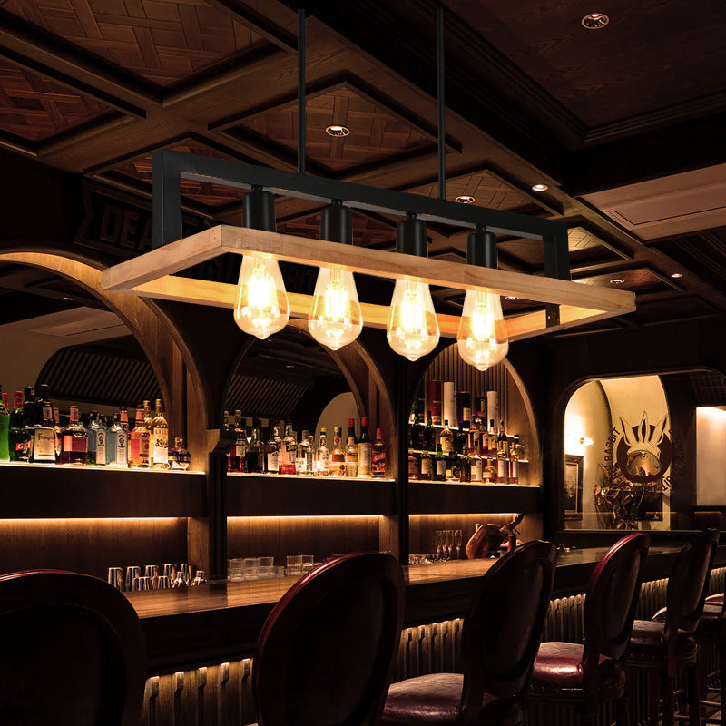 Modern Minimalist Rectangle Wood Iron 4-Light Island Light Chandelier For Dining Room