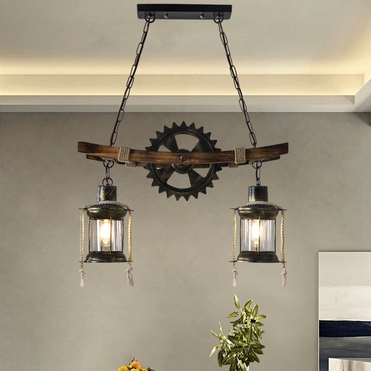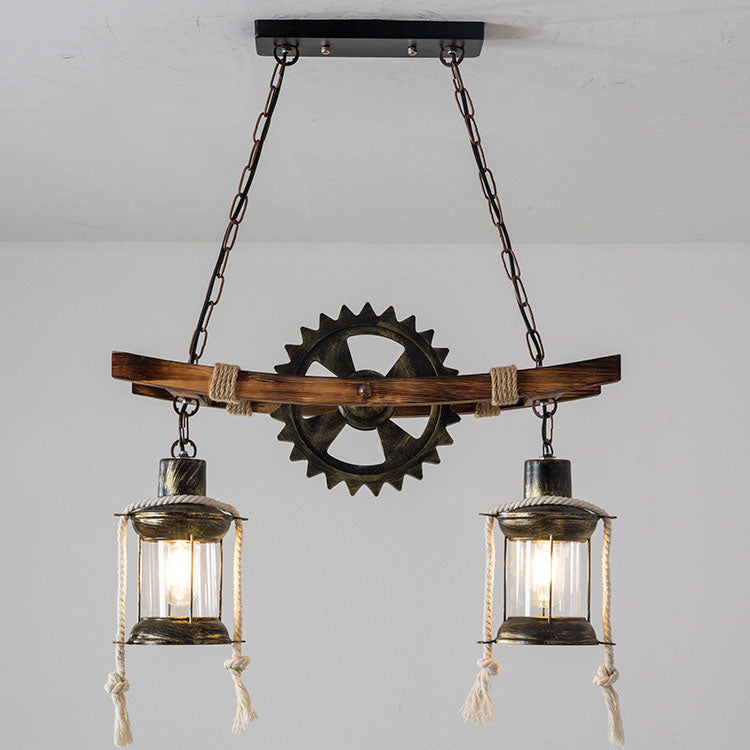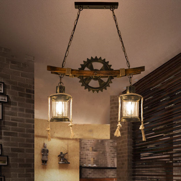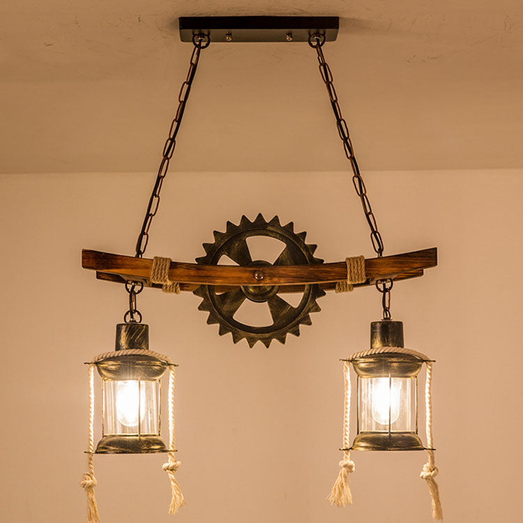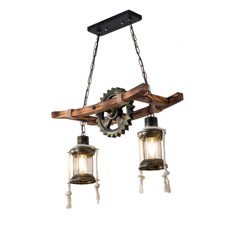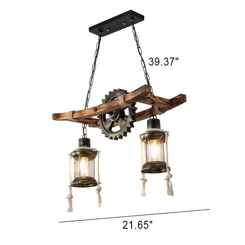 Retro Industrial Gear Iron Wooden Twine 2-Light Island Light Chandelier