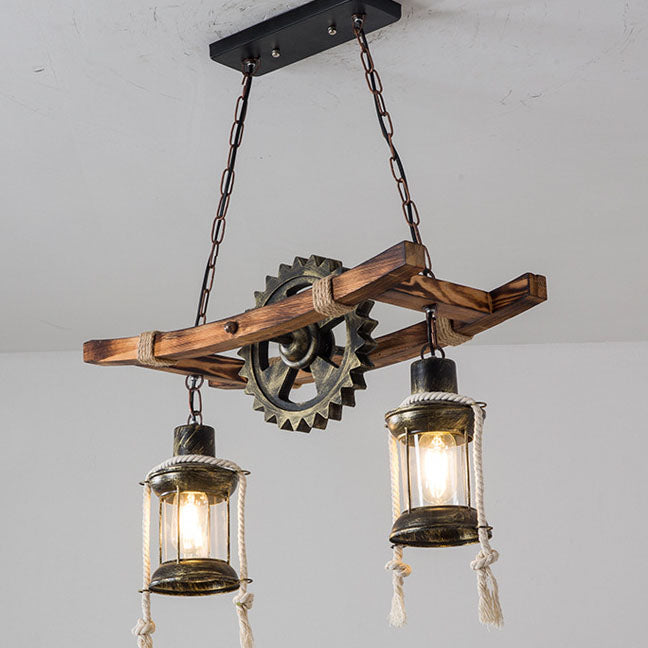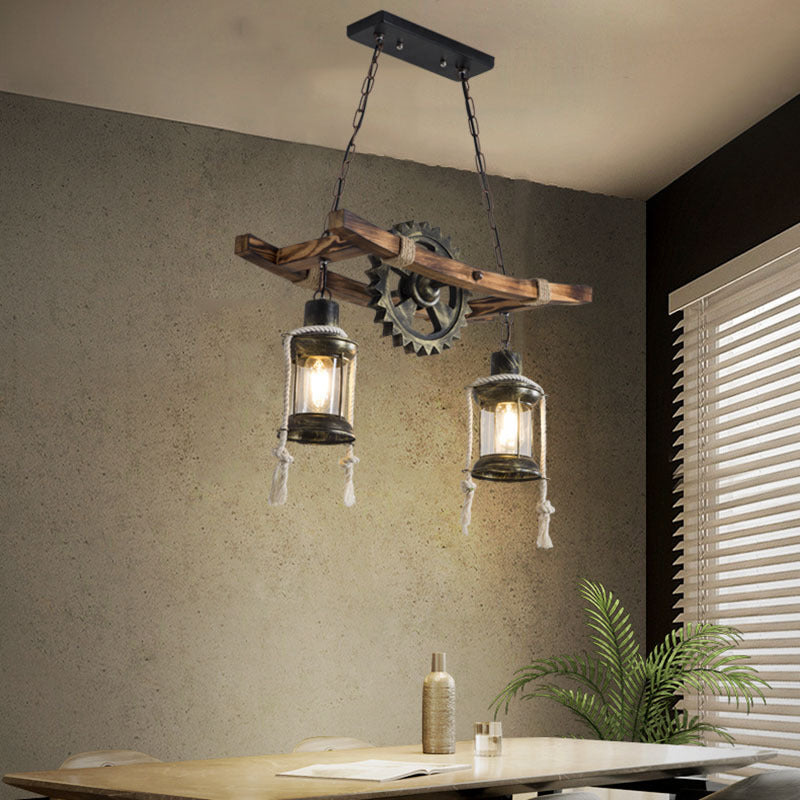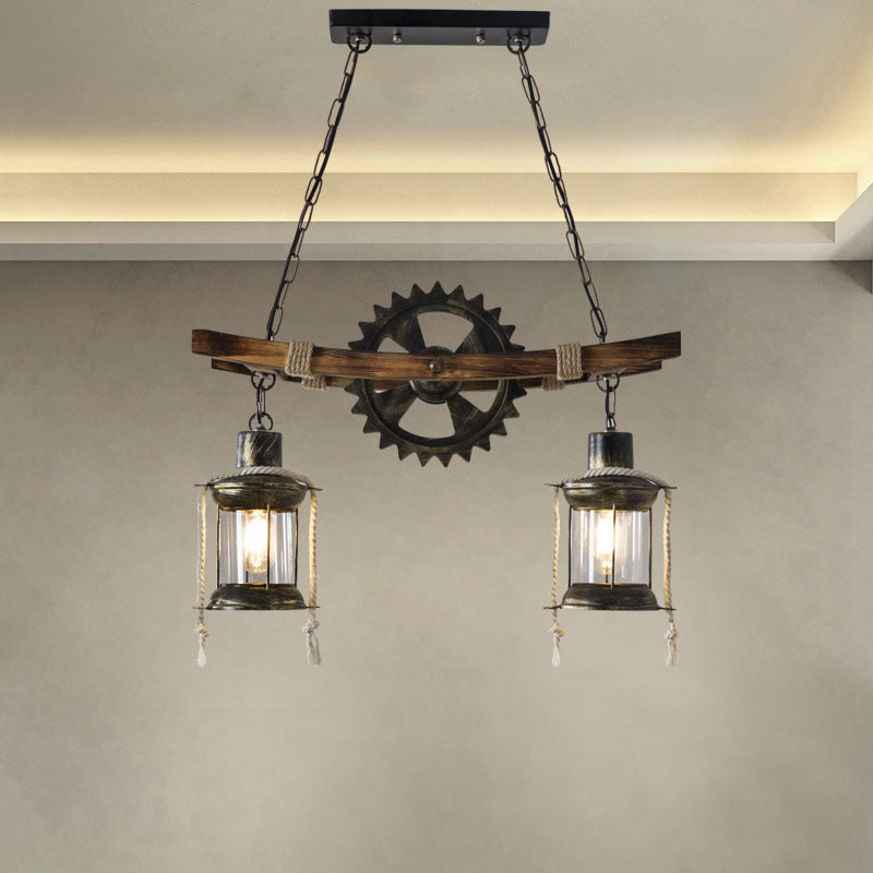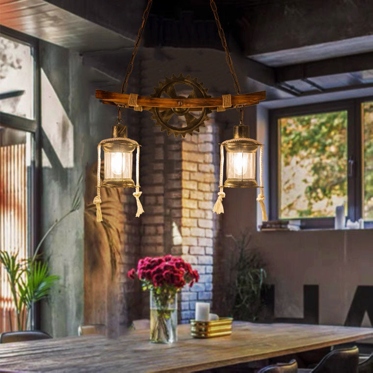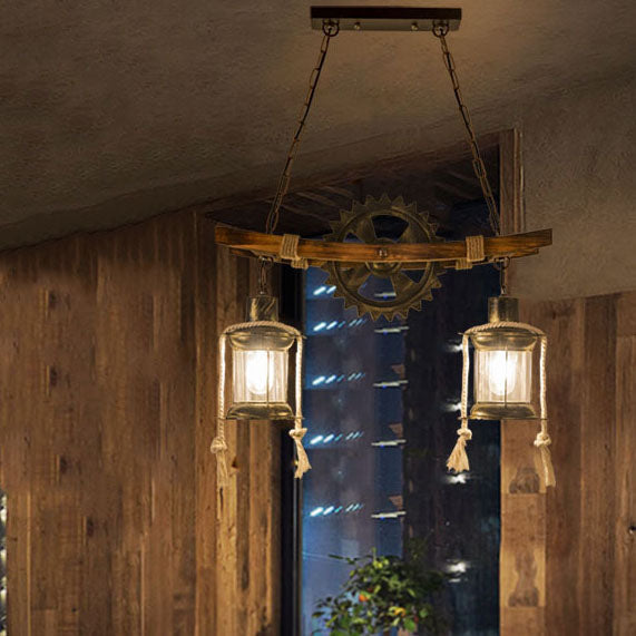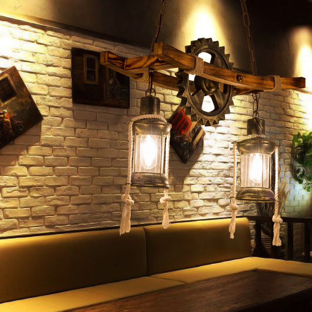 Retro Industrial Gear Iron Wooden Twine 2-Light Island Light Chandelier