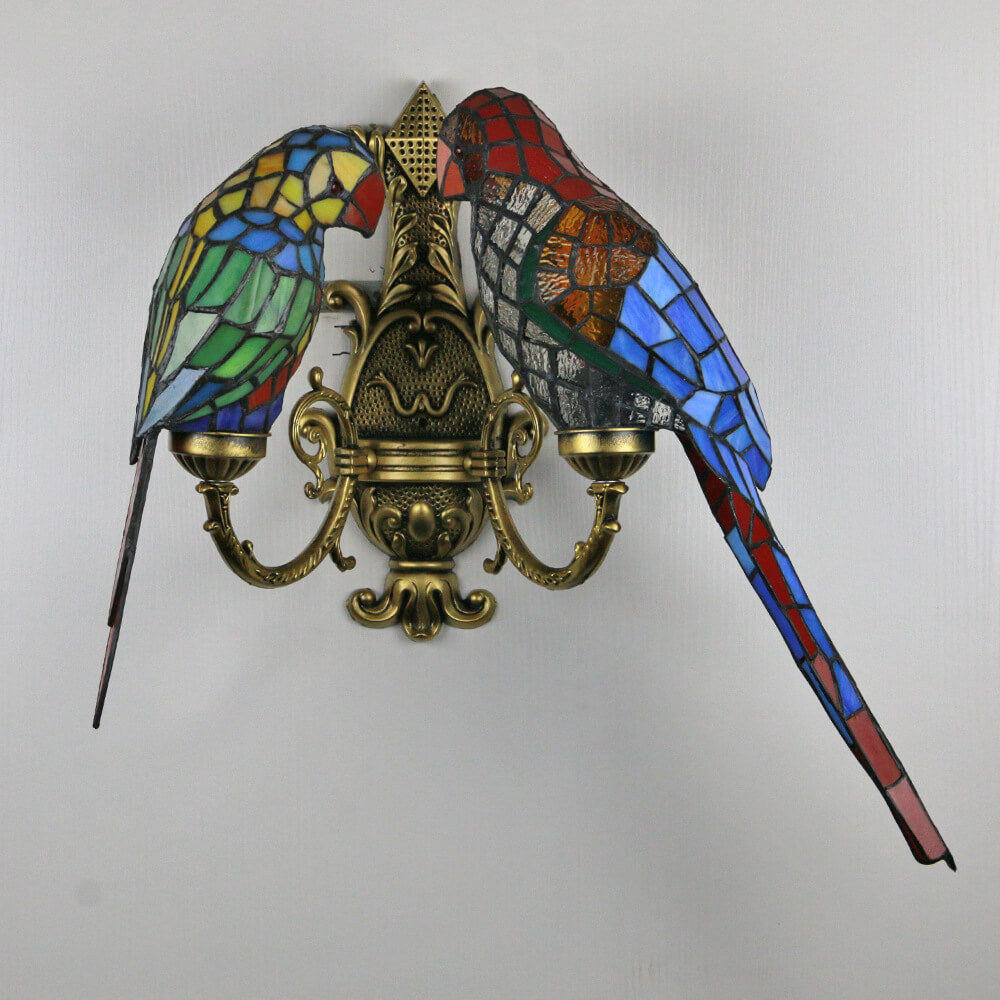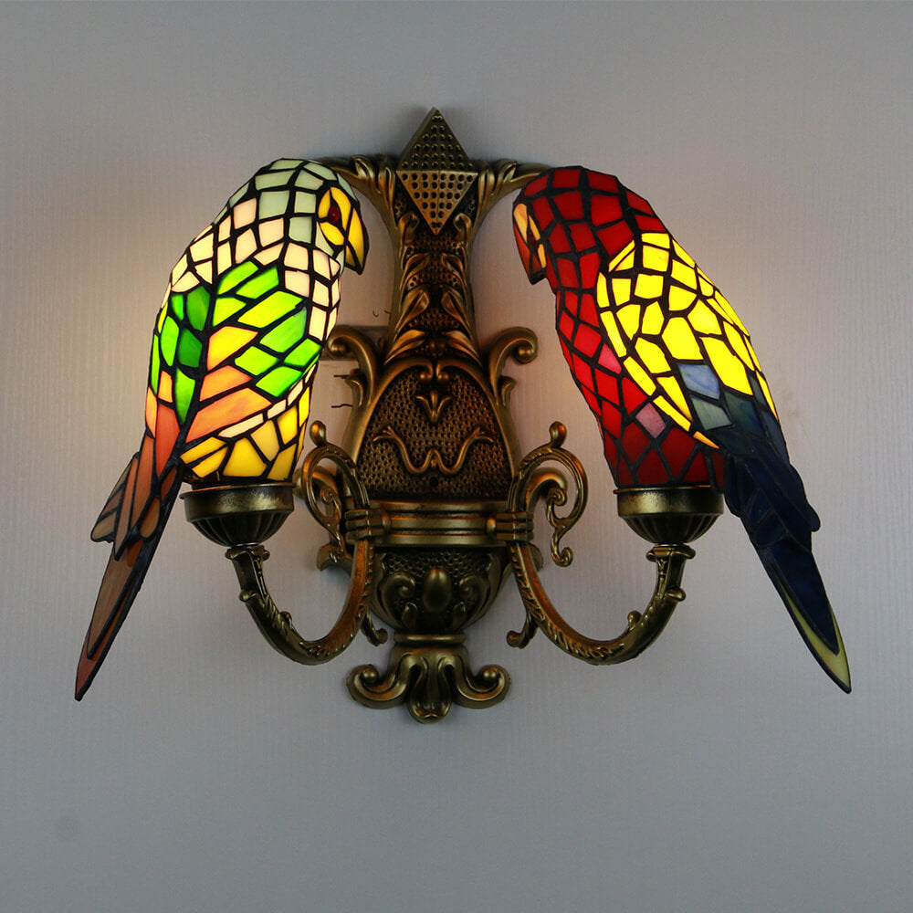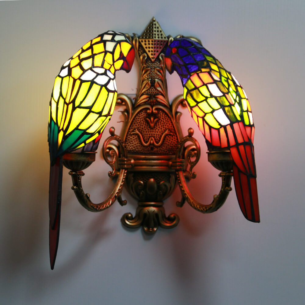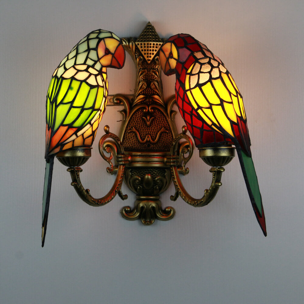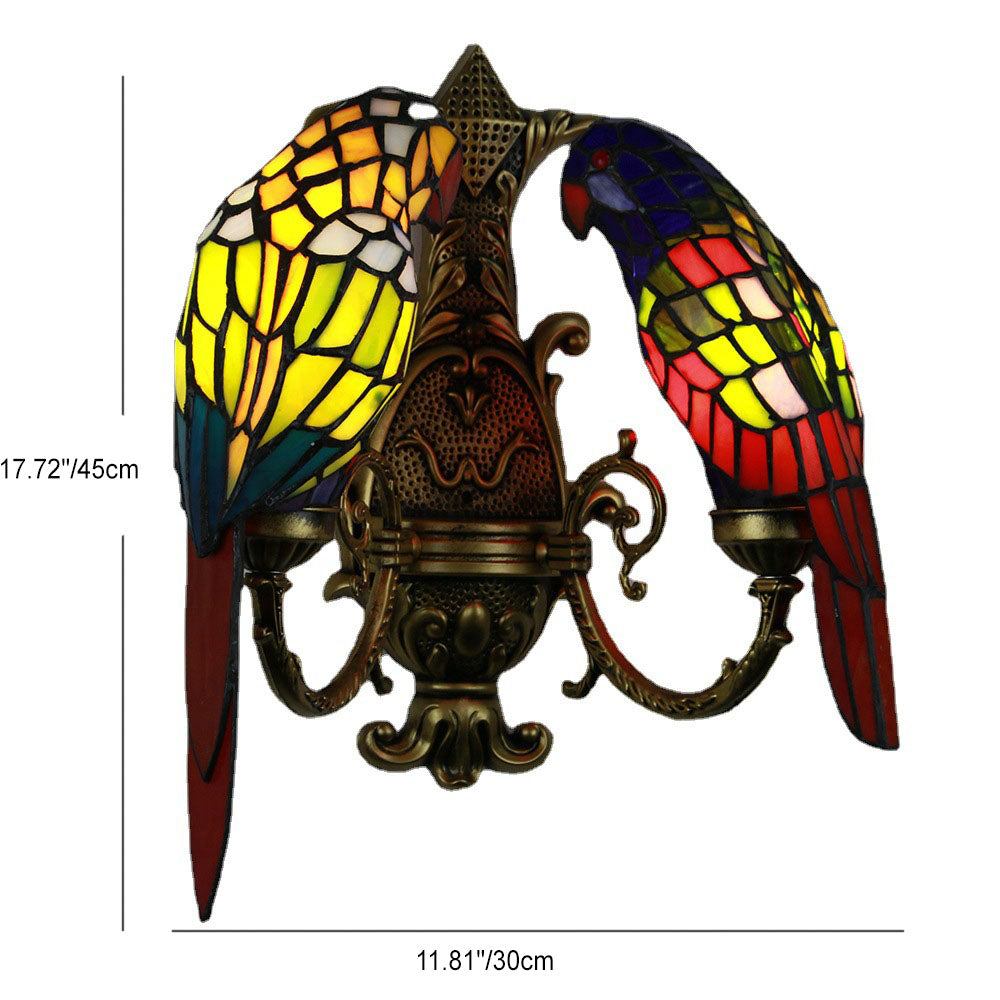 Tiffany Pastoral Double-Headed Parrot Stained Glass 2-Light Wall Sconce Lamp