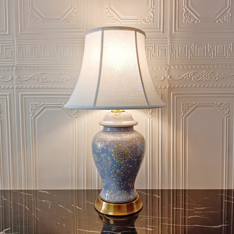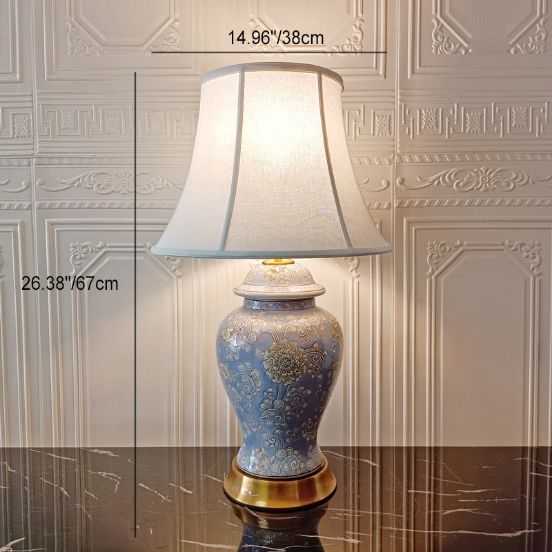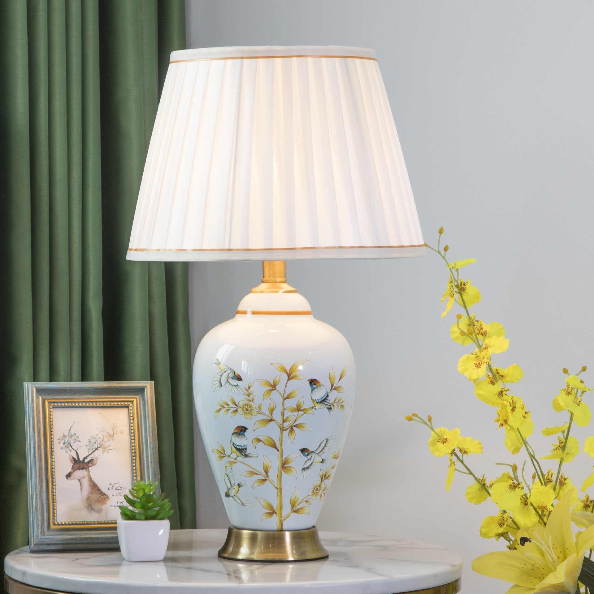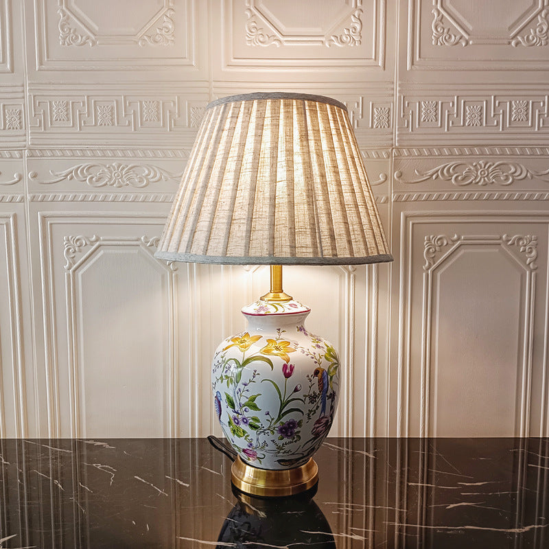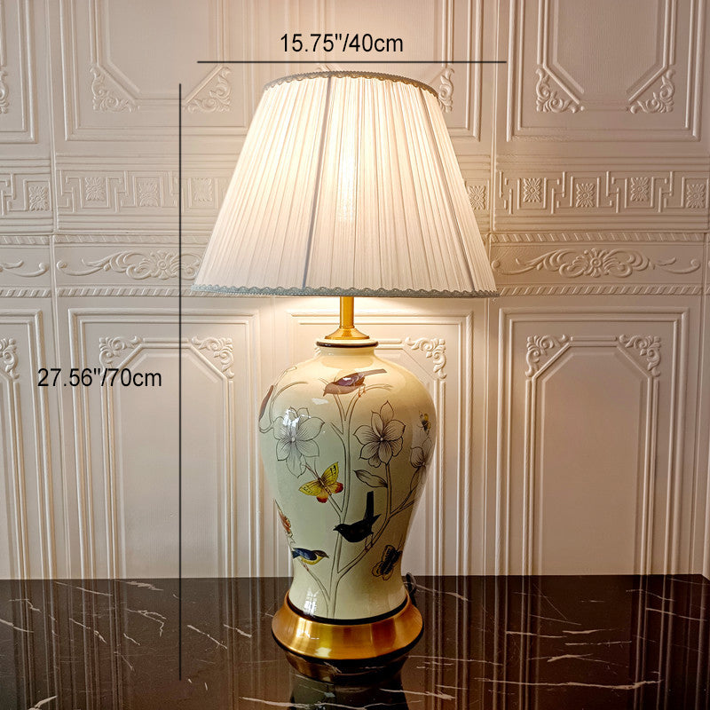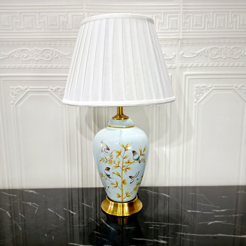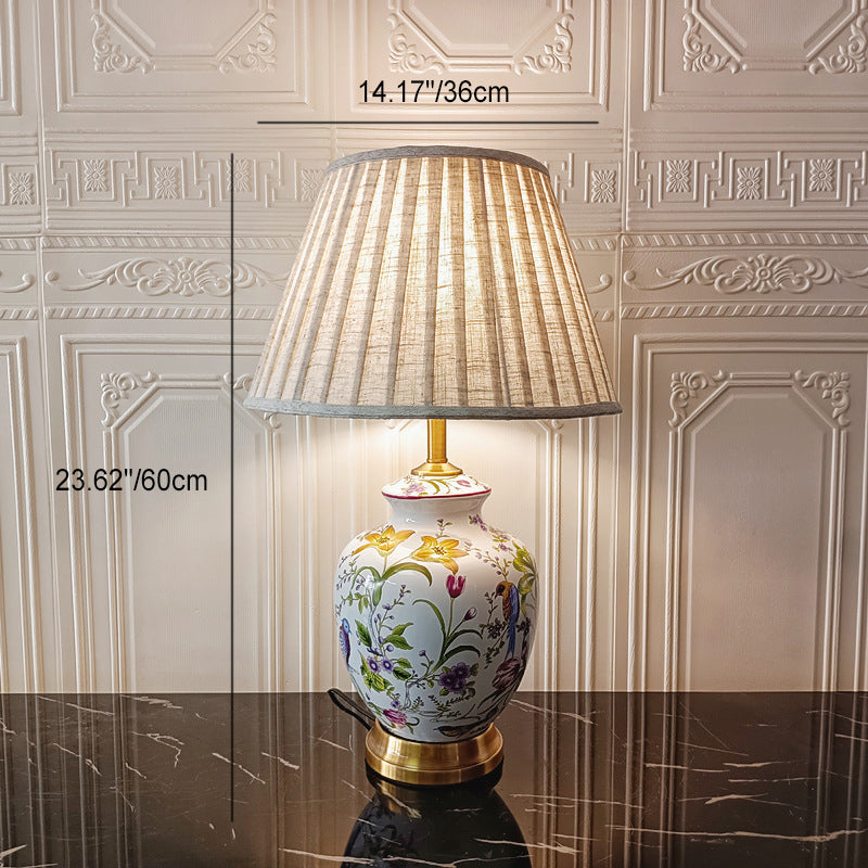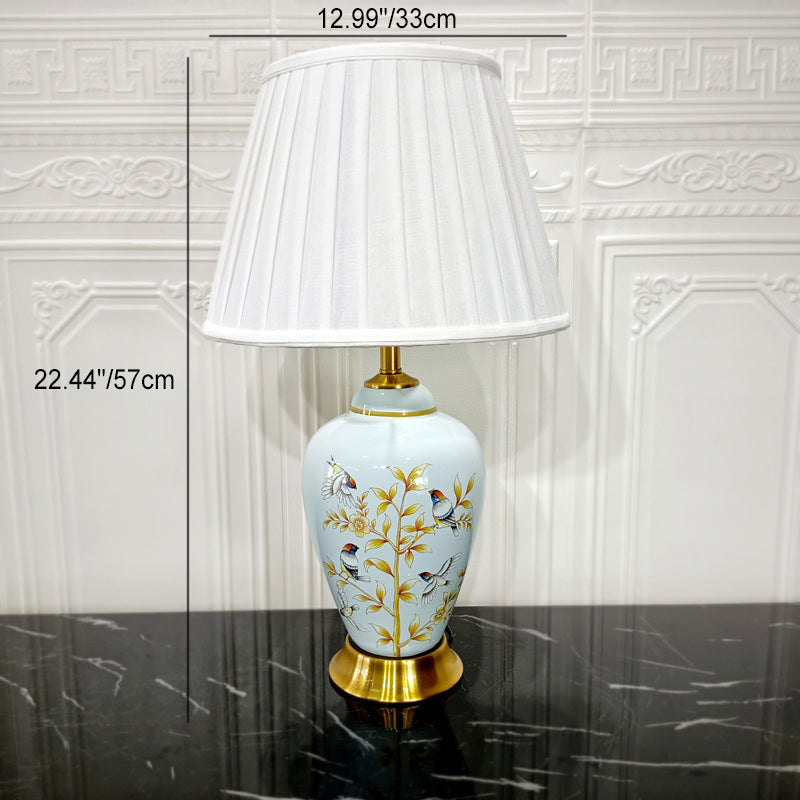 Traditional Chinese Cylinder Bird And Flower Ceramic Fabric 1-Light Table Lamp For Bedroom