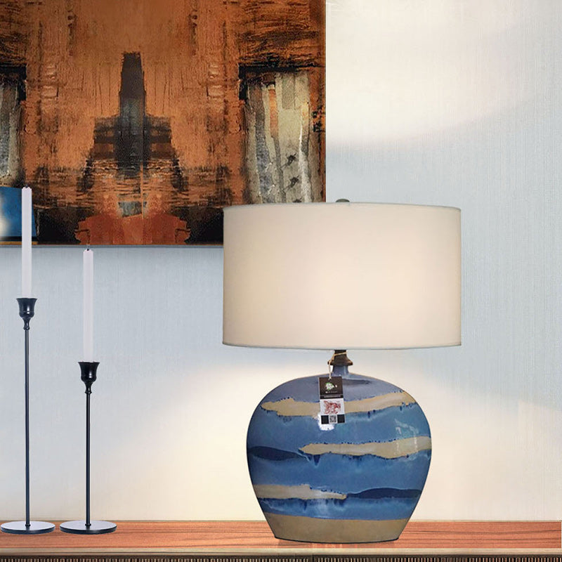 Traditional Chinese Cylinder Ceramic Metal Fabric 1-Light Table Lamp For Bedroom