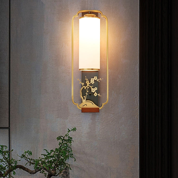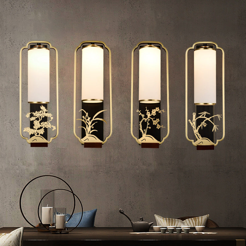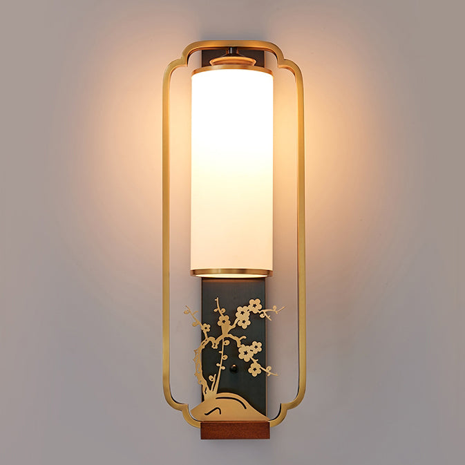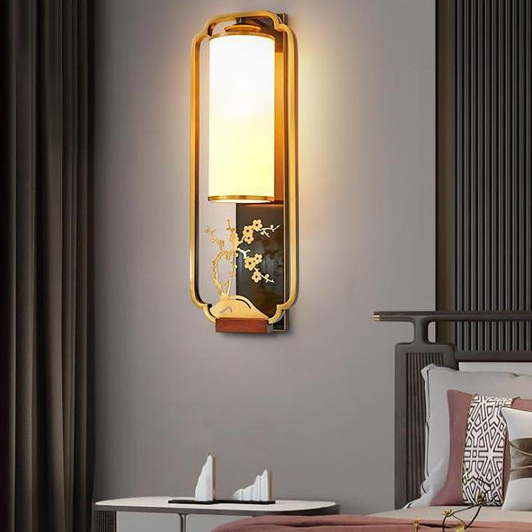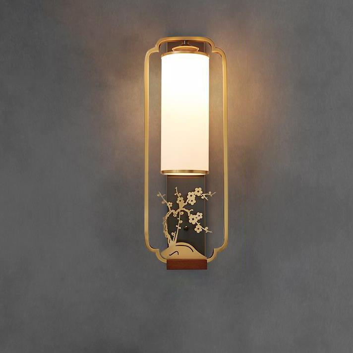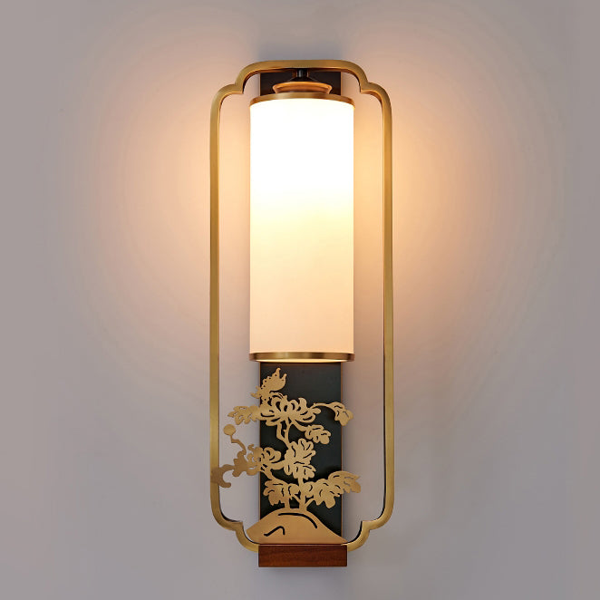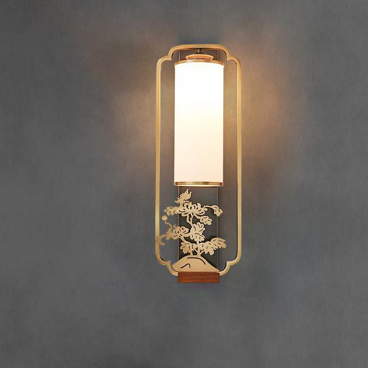 Traditional Chinese Cylinder Square Flower Deer Glass Iron 1-Light Wall Sconce Lamp For Living Room