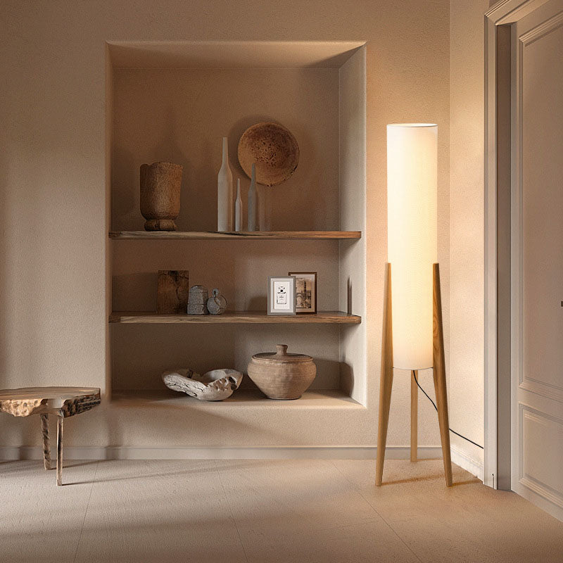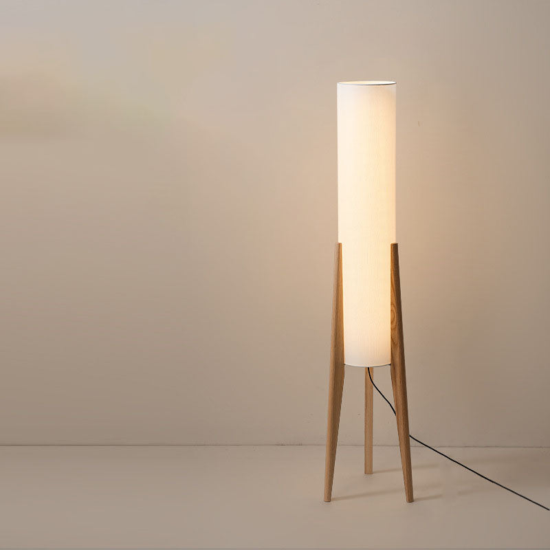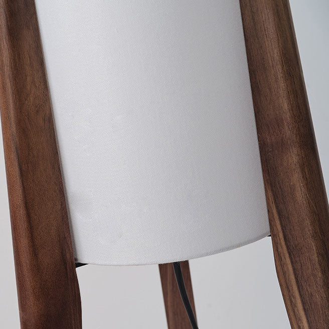 Traditional Chinese Fabric Cylinder Shade Wood Tripod 1-Light Standing Floor Lamp For Study