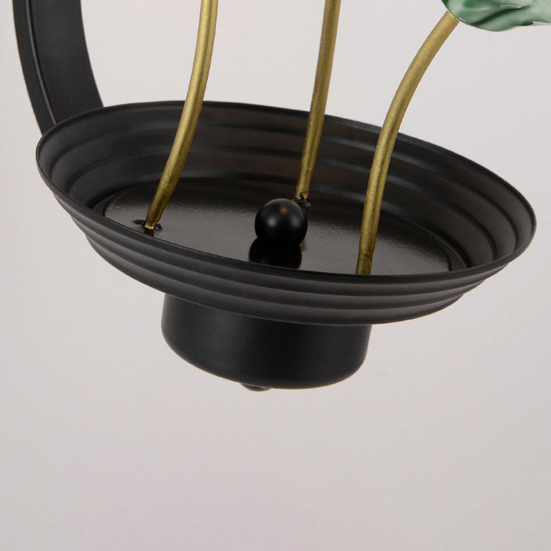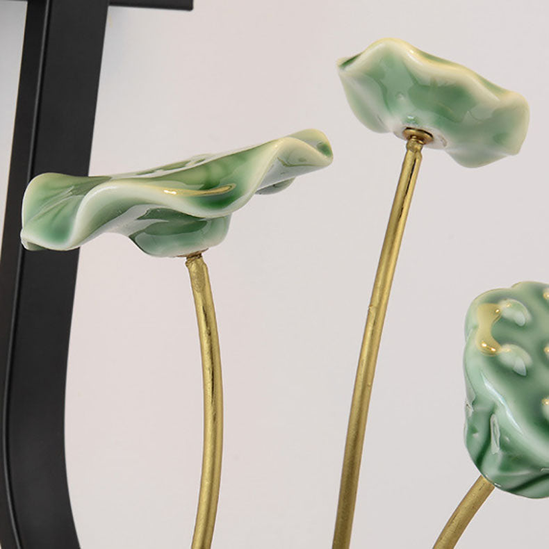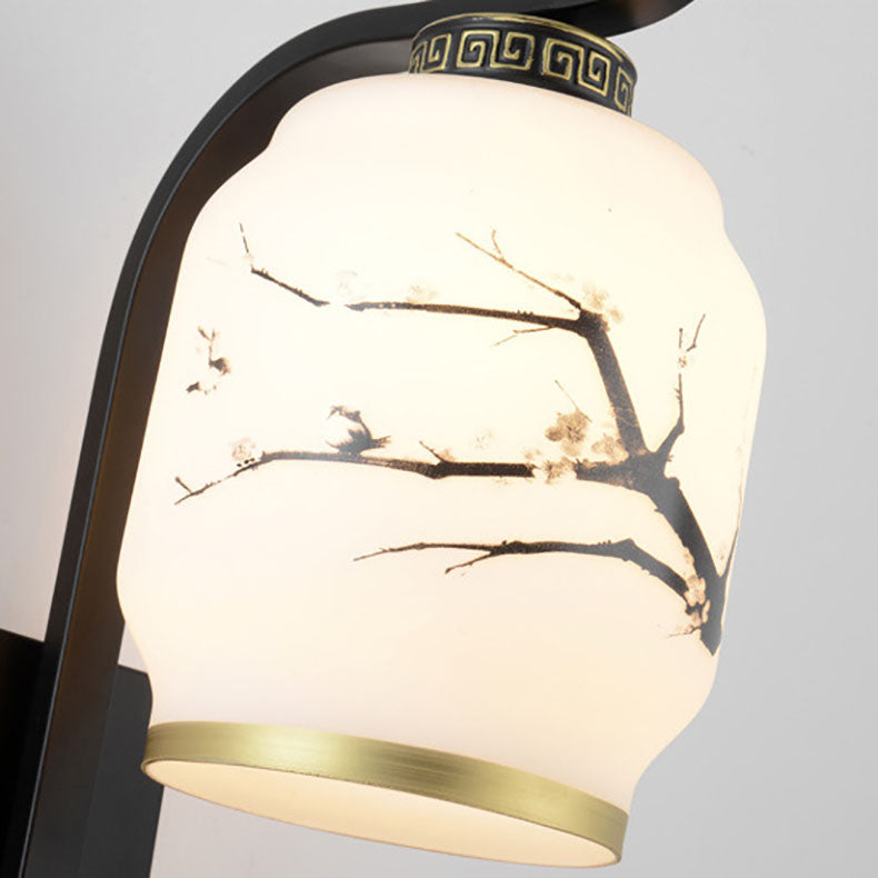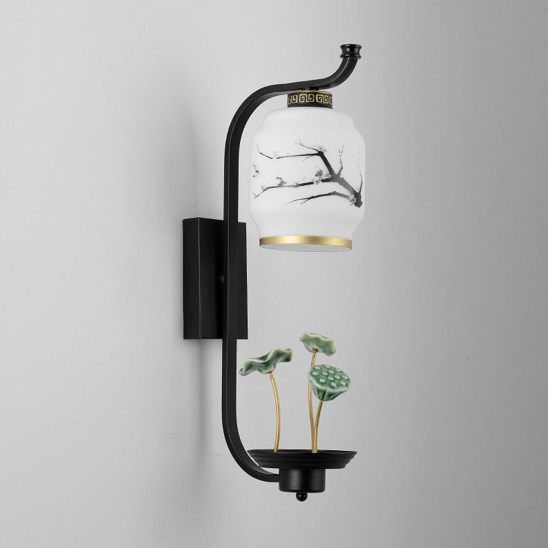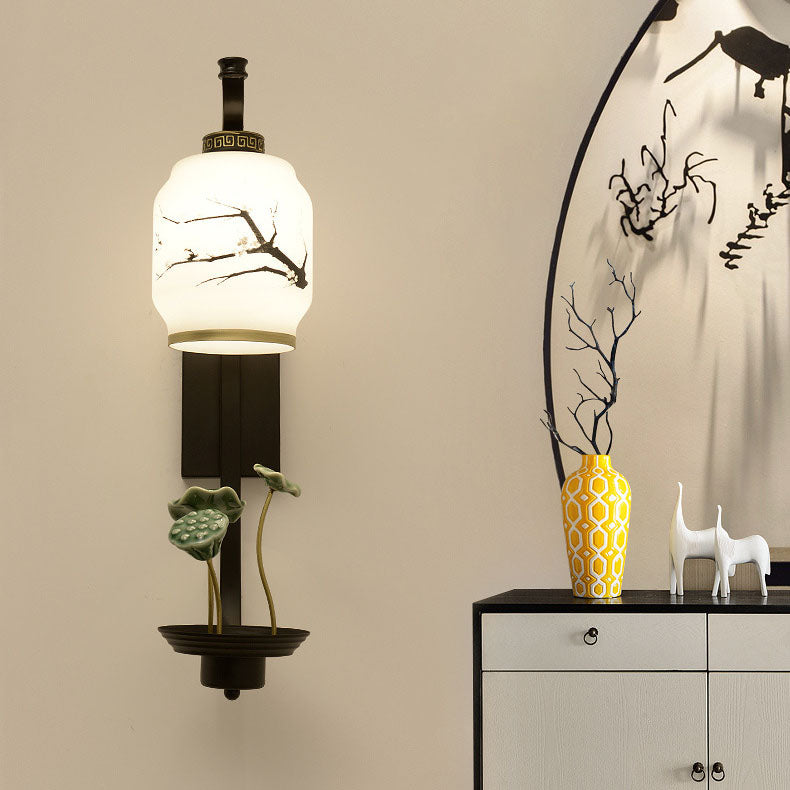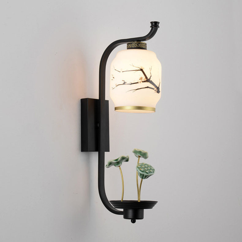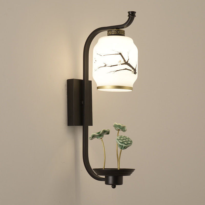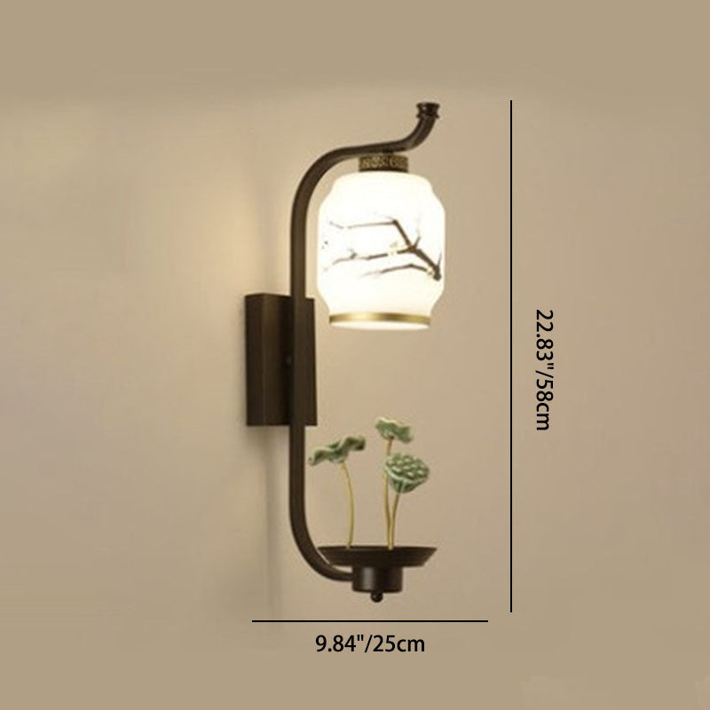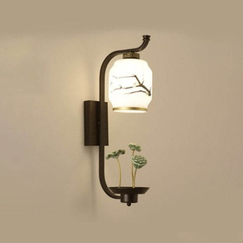 Traditional Chinese Iron Glass Ceramic Cylinder Lotus 1-Light Wall Sconce Lamp For Hallway
