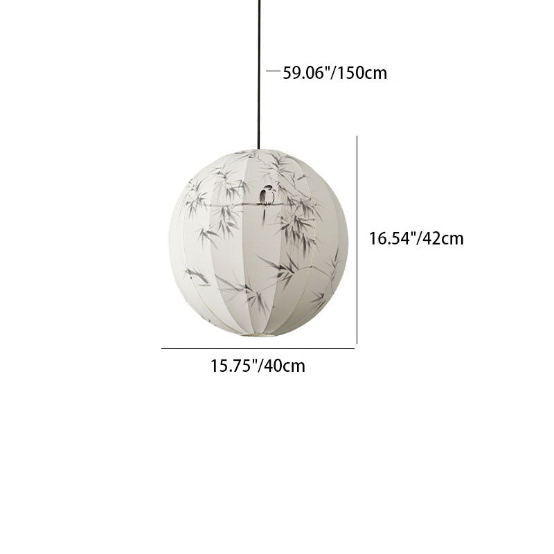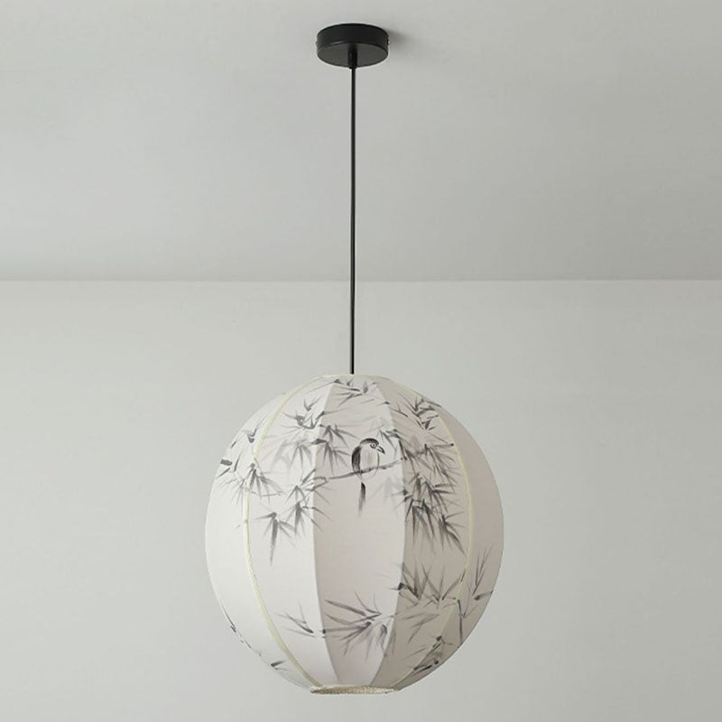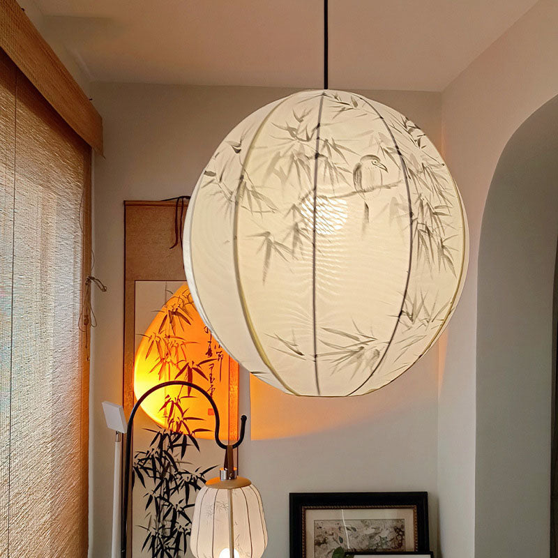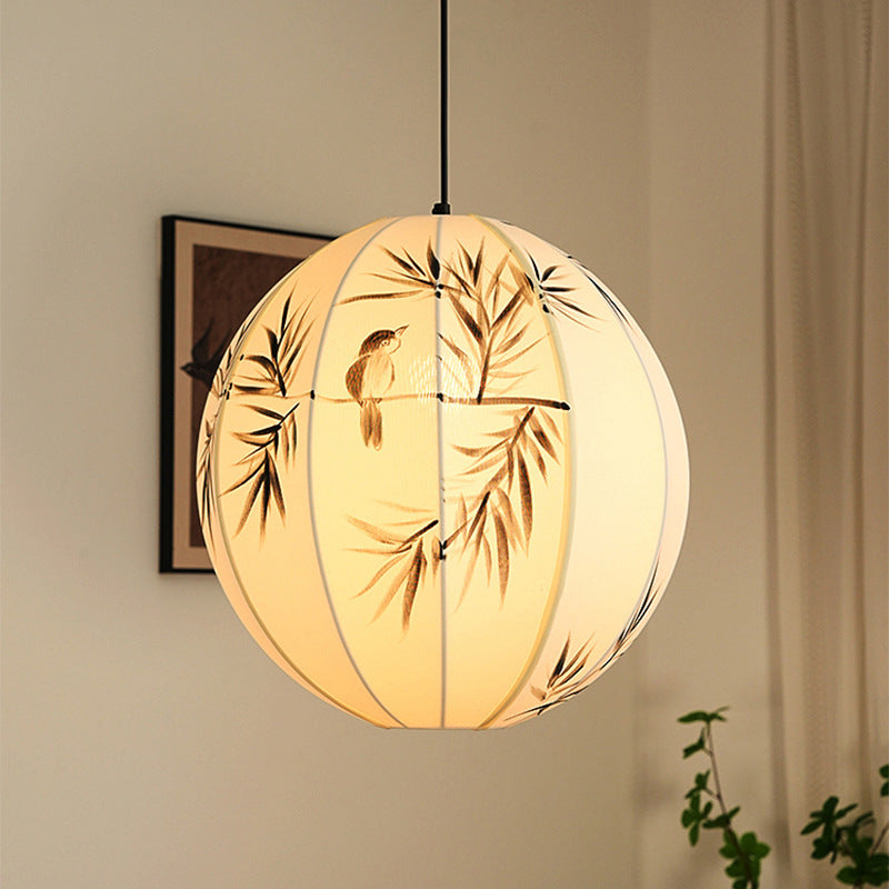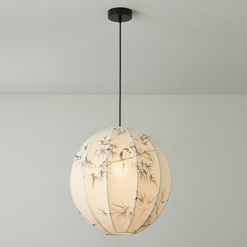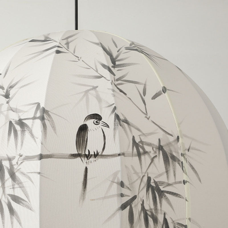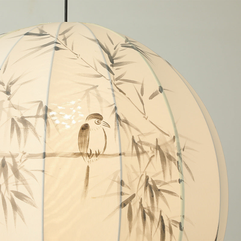 Traditional Chinese Metal Hand-Painted Bamboo Bird Pattern Fabric Round Shade 1-Light Pendant Light For Living Room