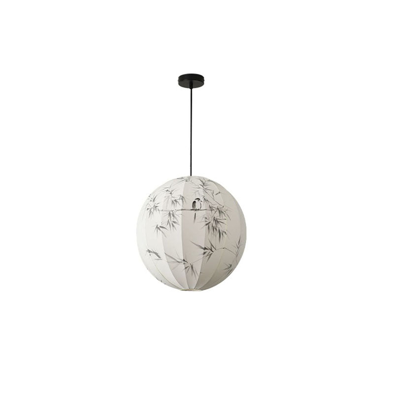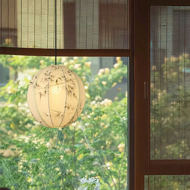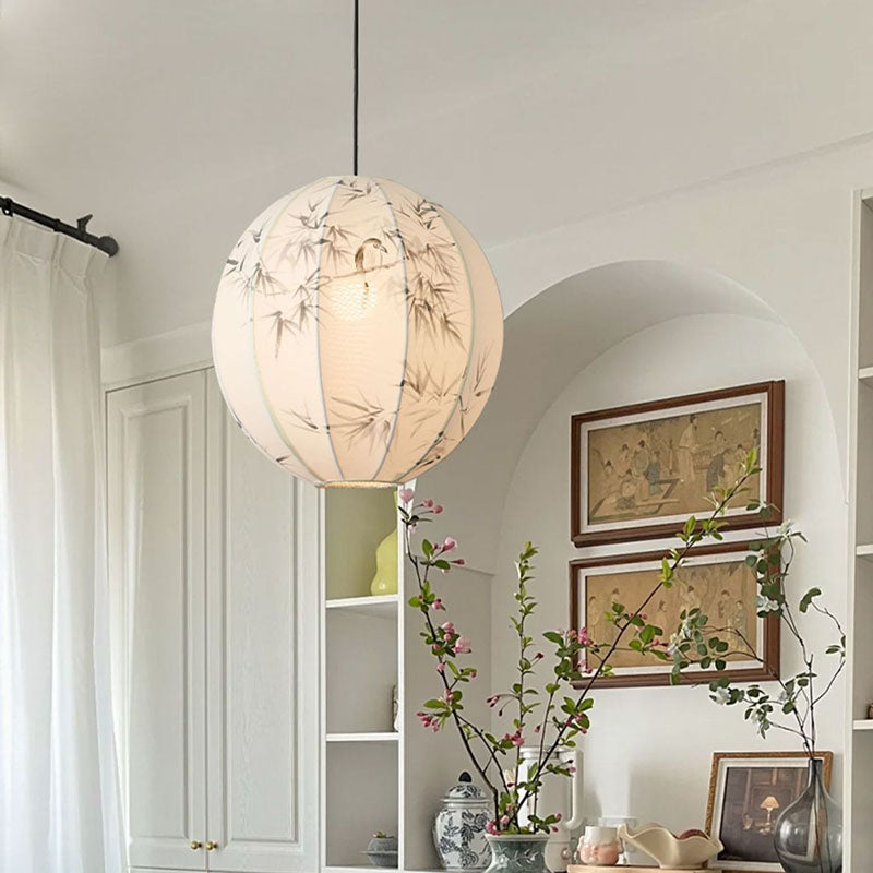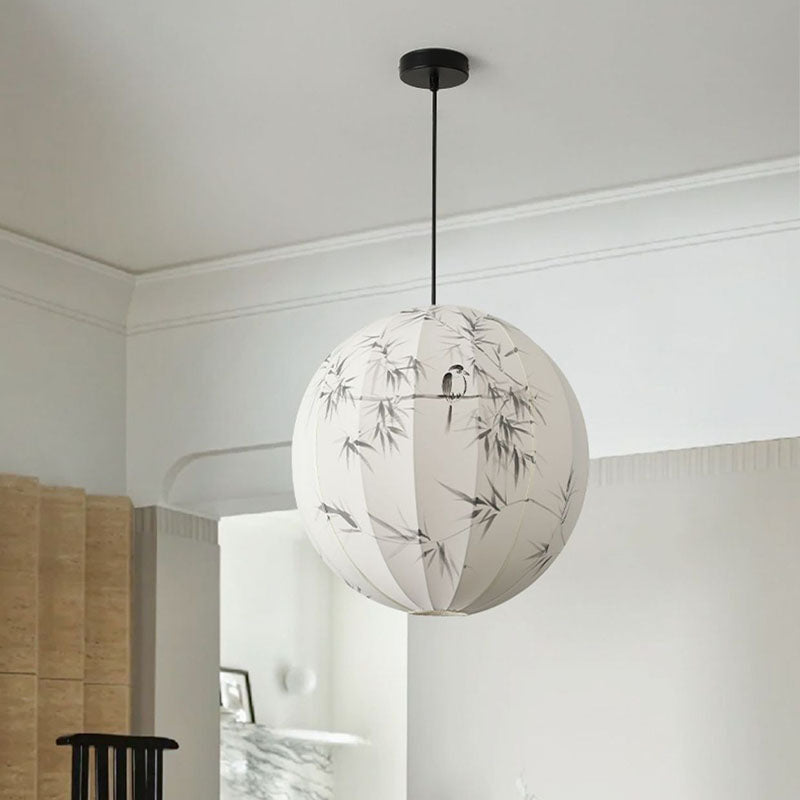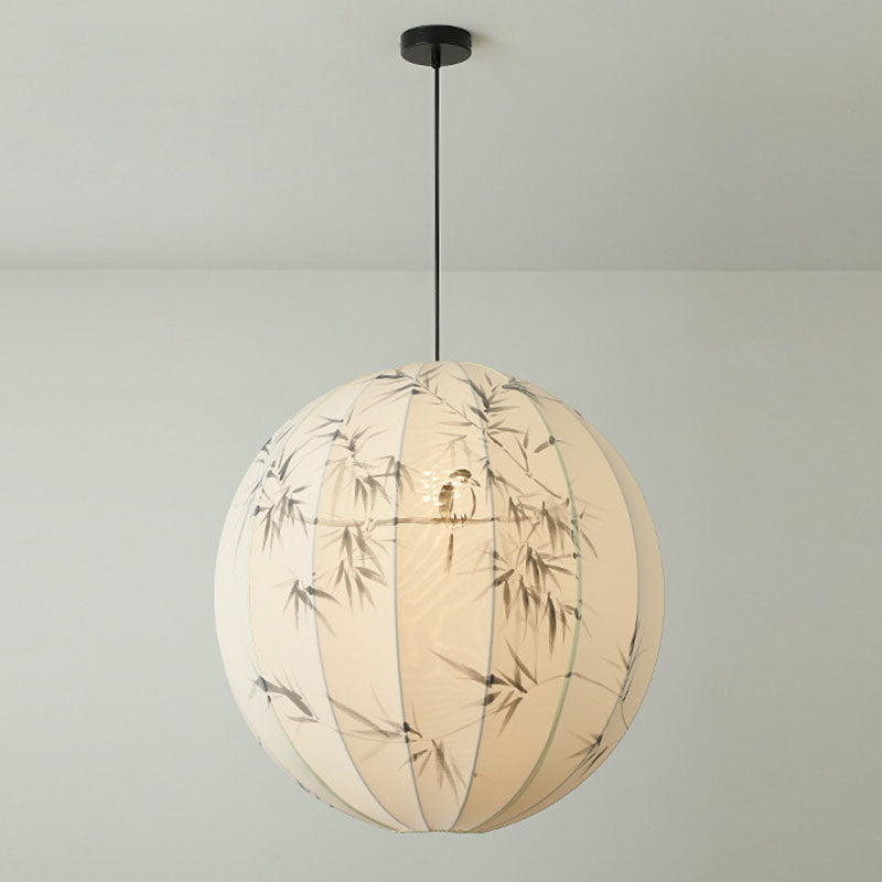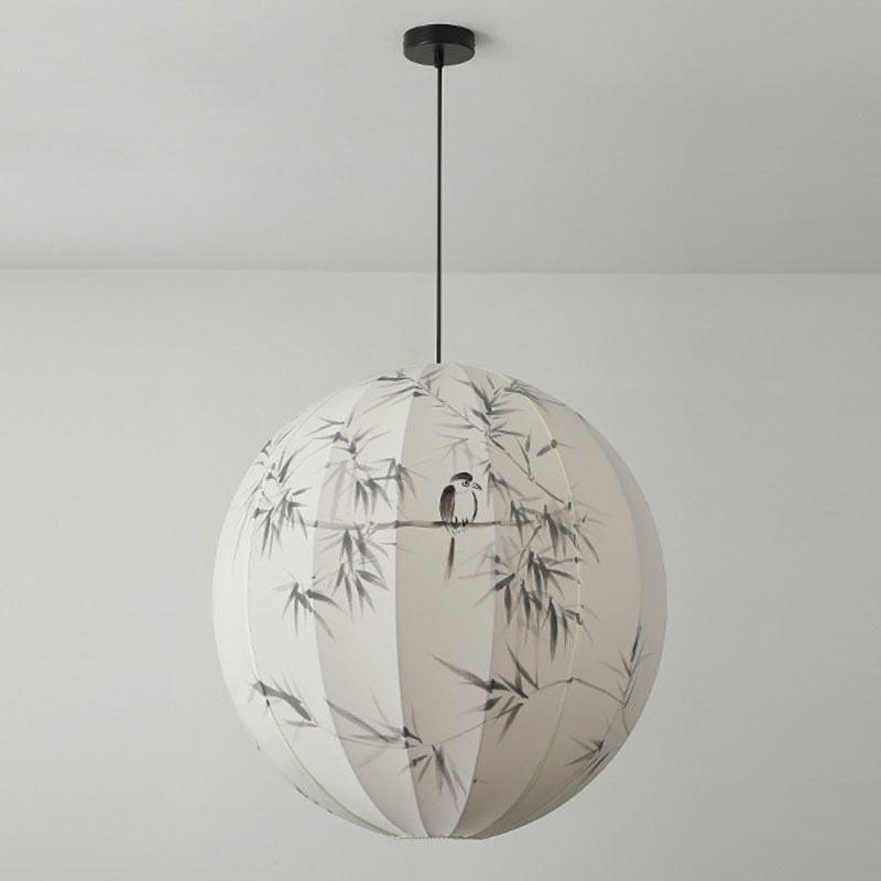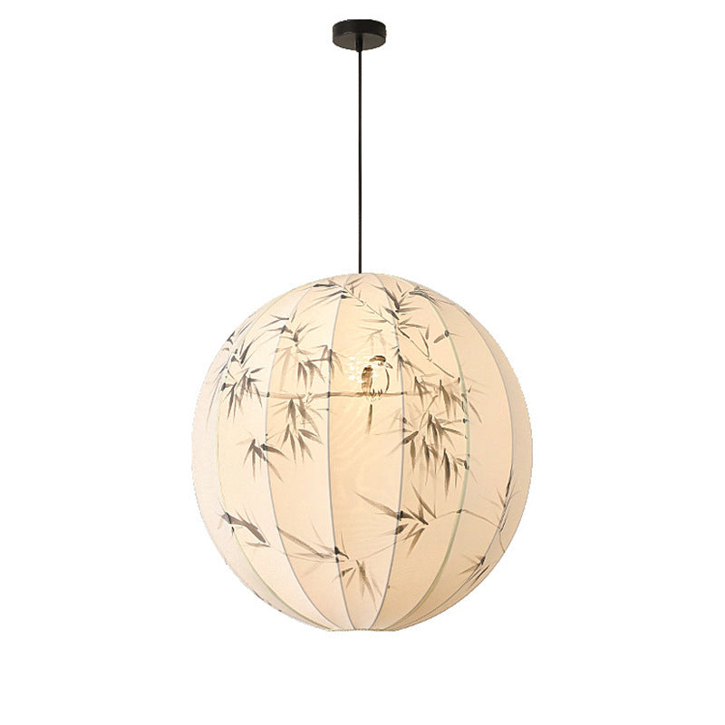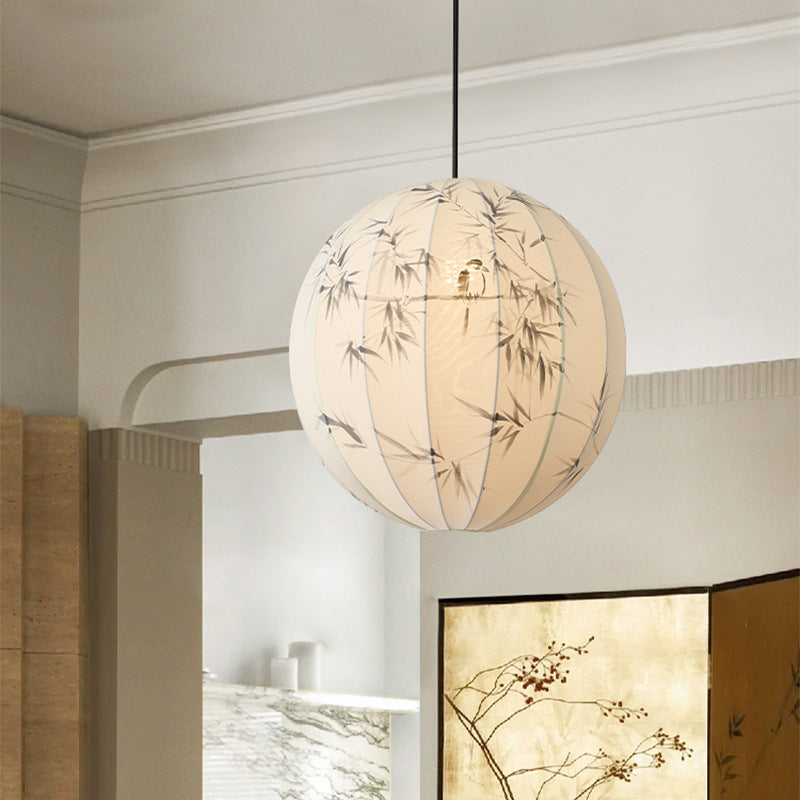 Traditional Chinese Metal Hand-Painted Bamboo Bird Pattern Fabric Round Shade 1-Light Pendant Light For Living Room