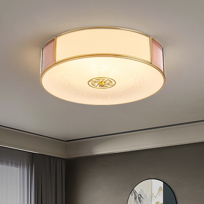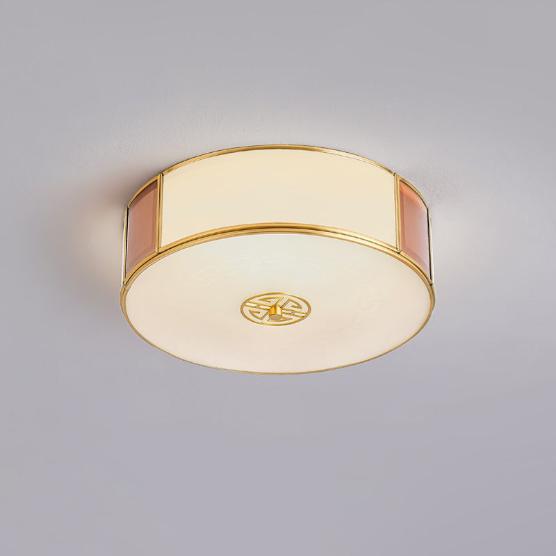 Traditional Chinese Round Glass Iron Copper LED Flush Mount Ceiling Light For Bedroom