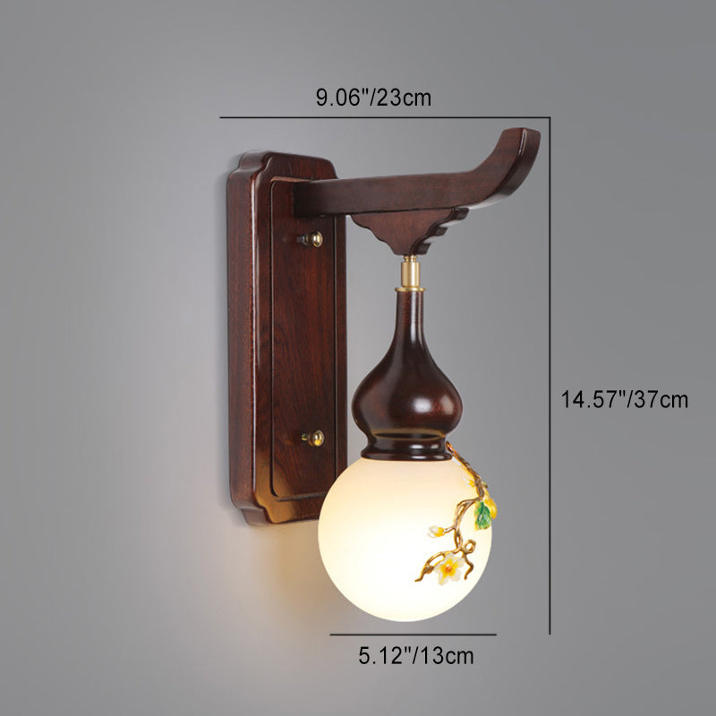 Traditional Chinese Round Gourd Wood Brass Enameled Glass Shade 1-Light Wall Sconce Lamp For Living Room
