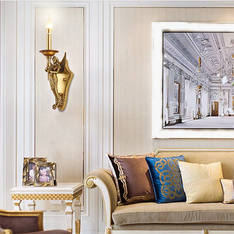 Crafted from solid copper in a romantic mermaid and candle design, this traditional European wall sconce brings a touch of vintage elegance to living rooms and bedrooms. Hand-carved with exquisite detail, it evokes luxurious palace-inspired charm with a warm brass finish and timeless artistry.