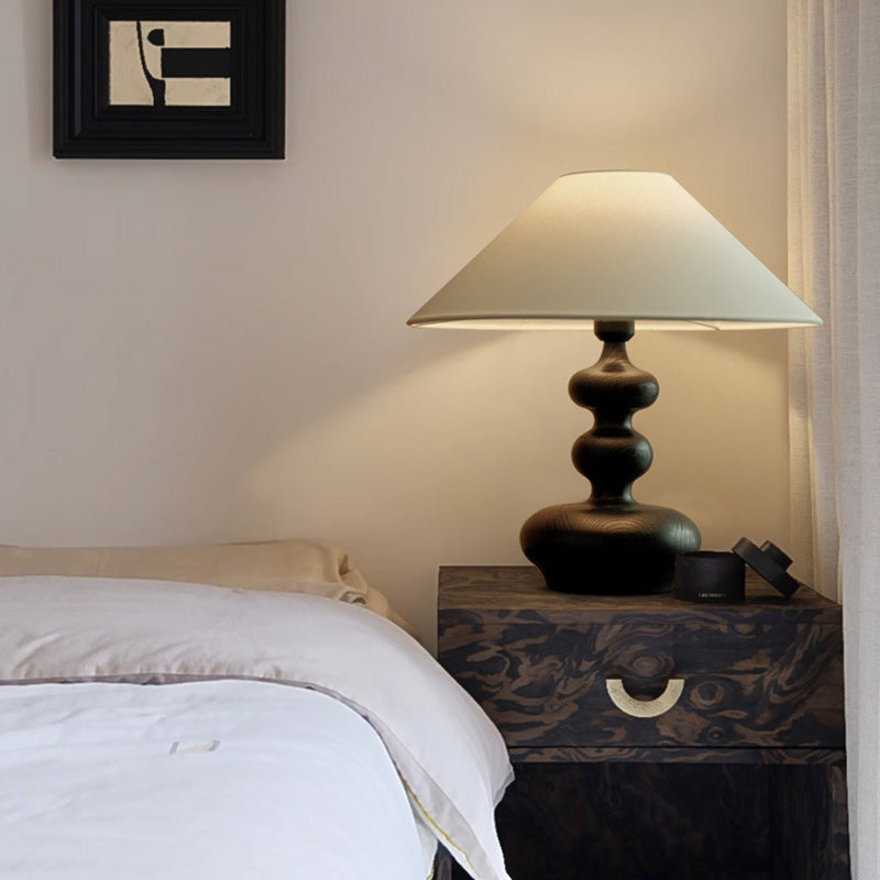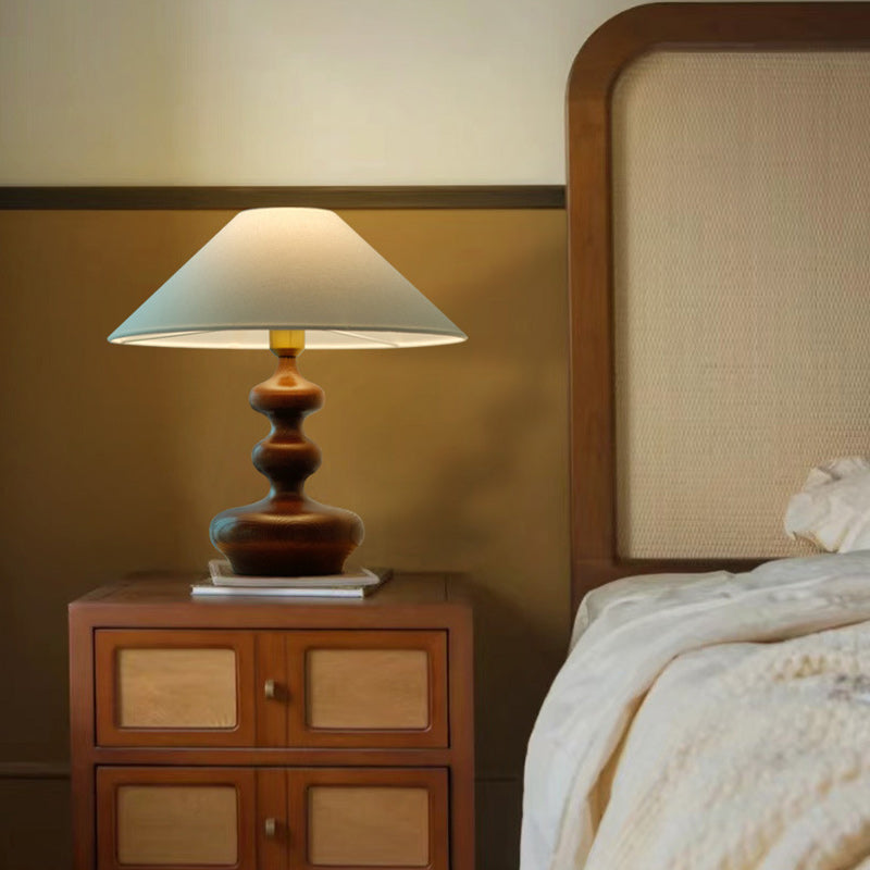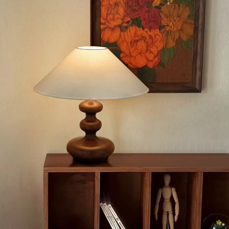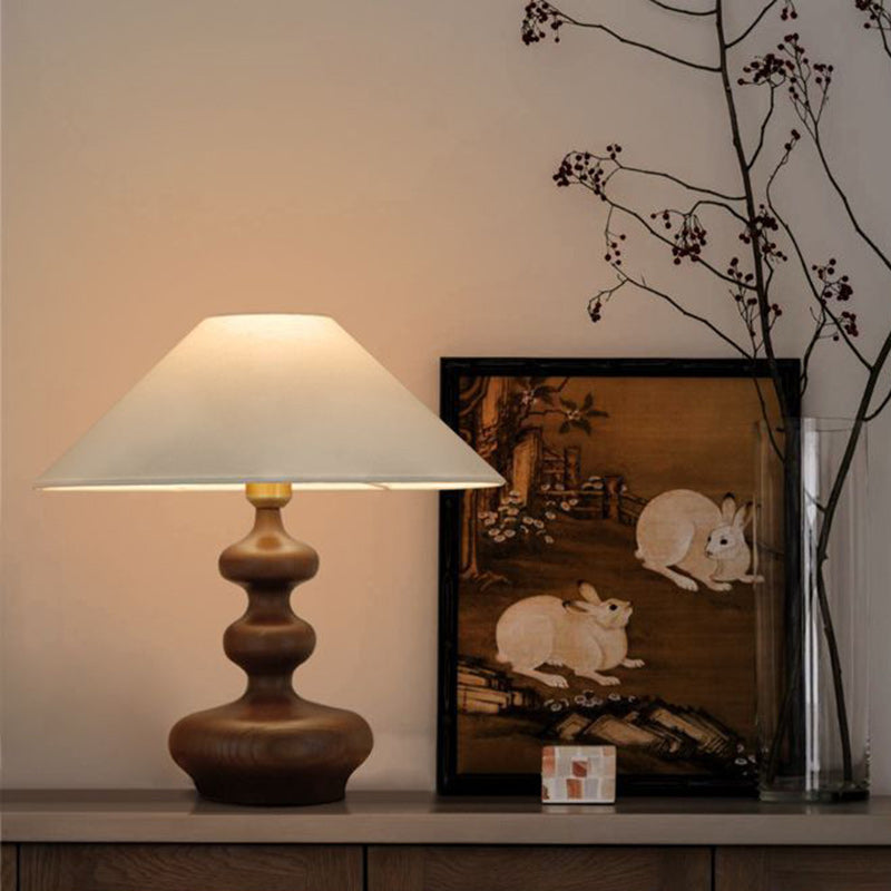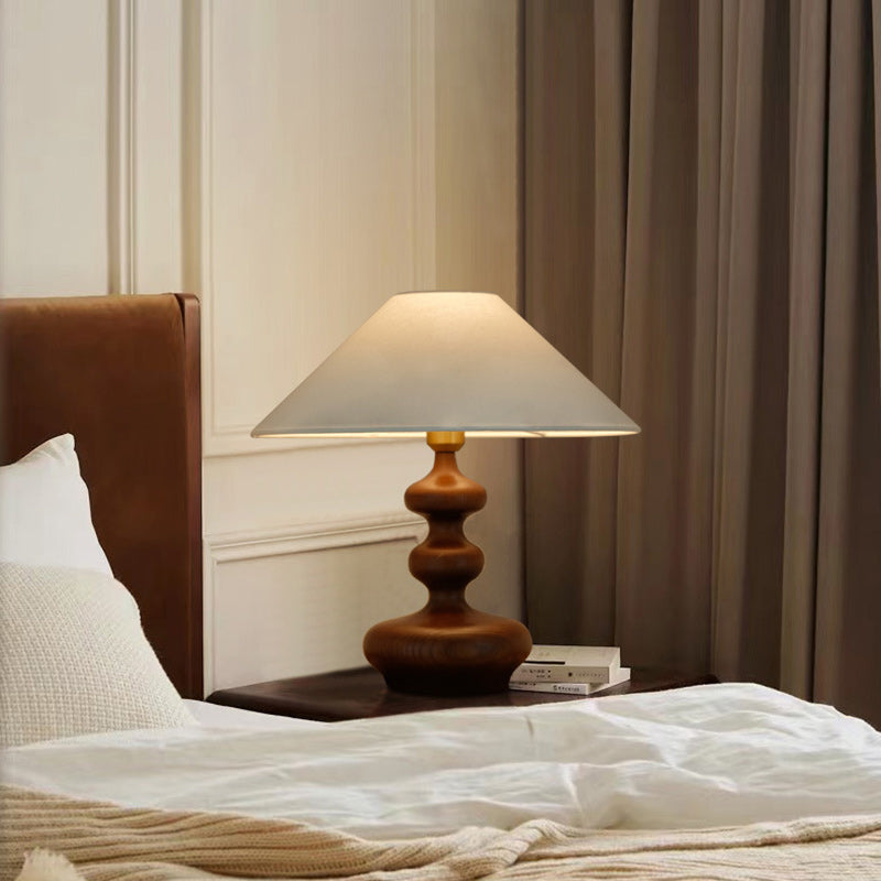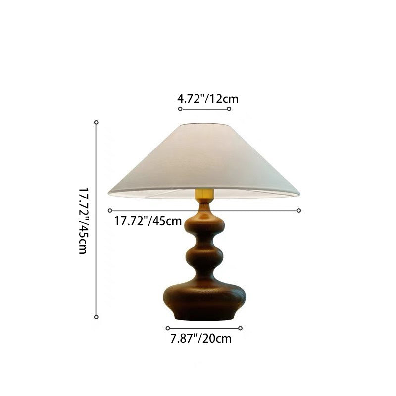 Traditional French Ash Wood & Fabric Gourd-Shaped 1-Light Table Lamp With Conical Shade For Bedroom & Living Room