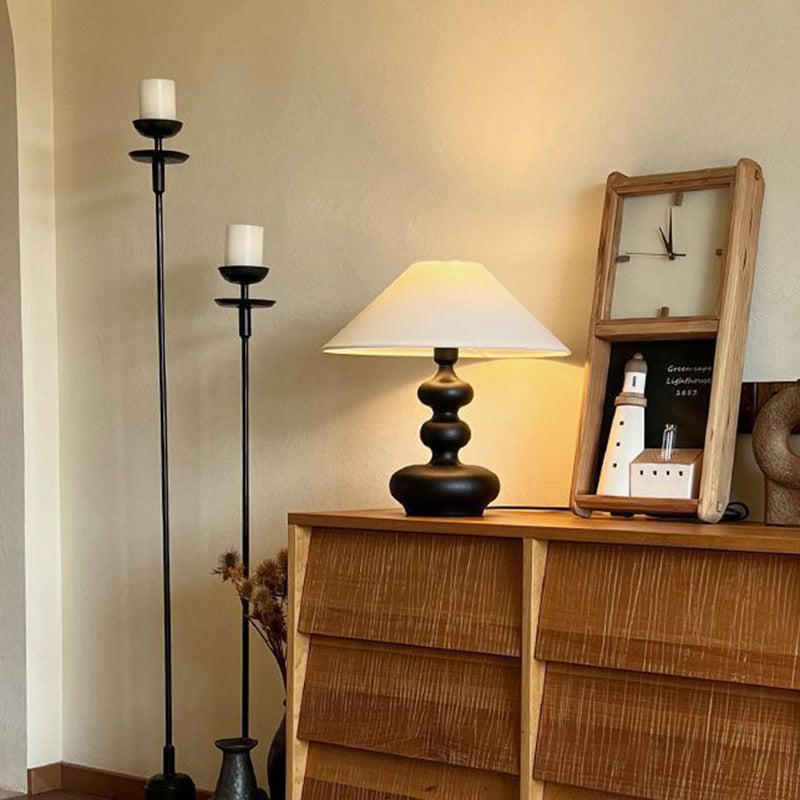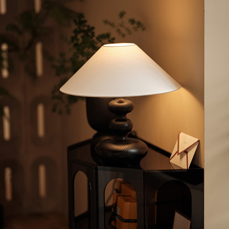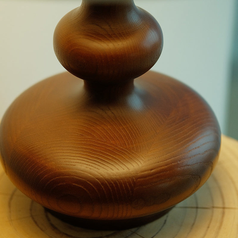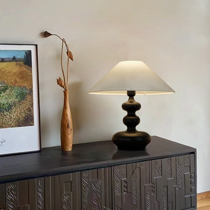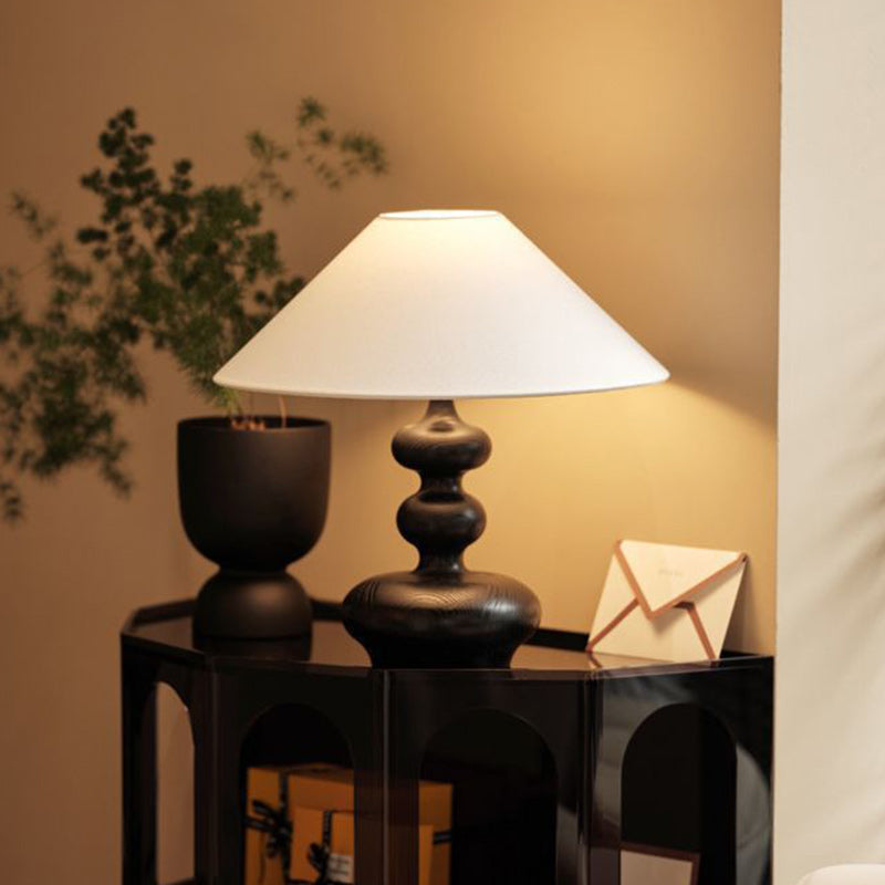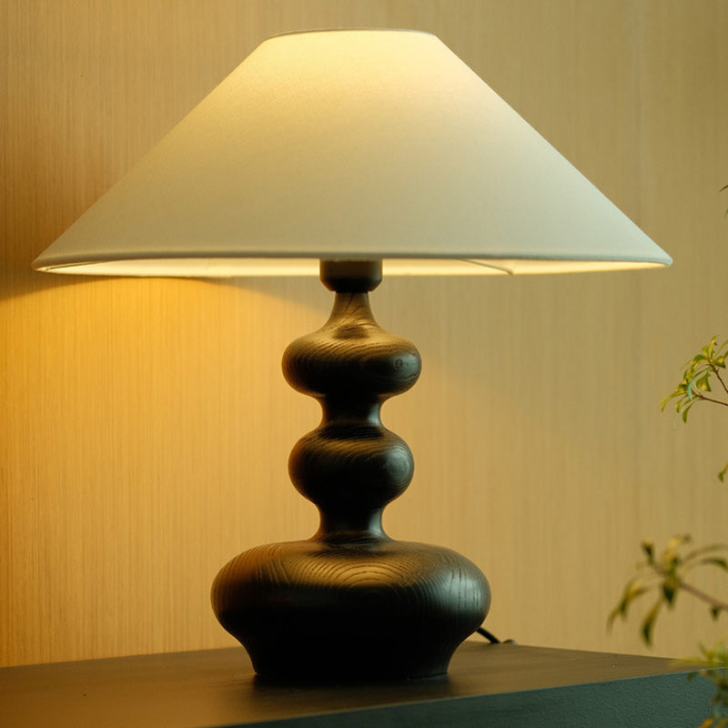 Traditional French Ash Wood & Fabric Gourd-Shaped 1-Light Table Lamp With Conical Shade For Bedroom & Living Room