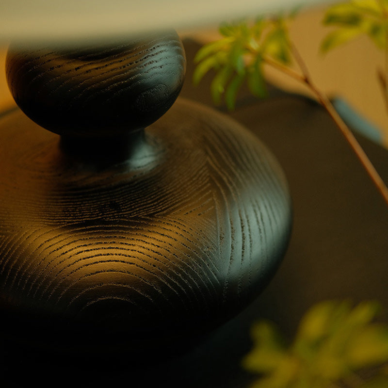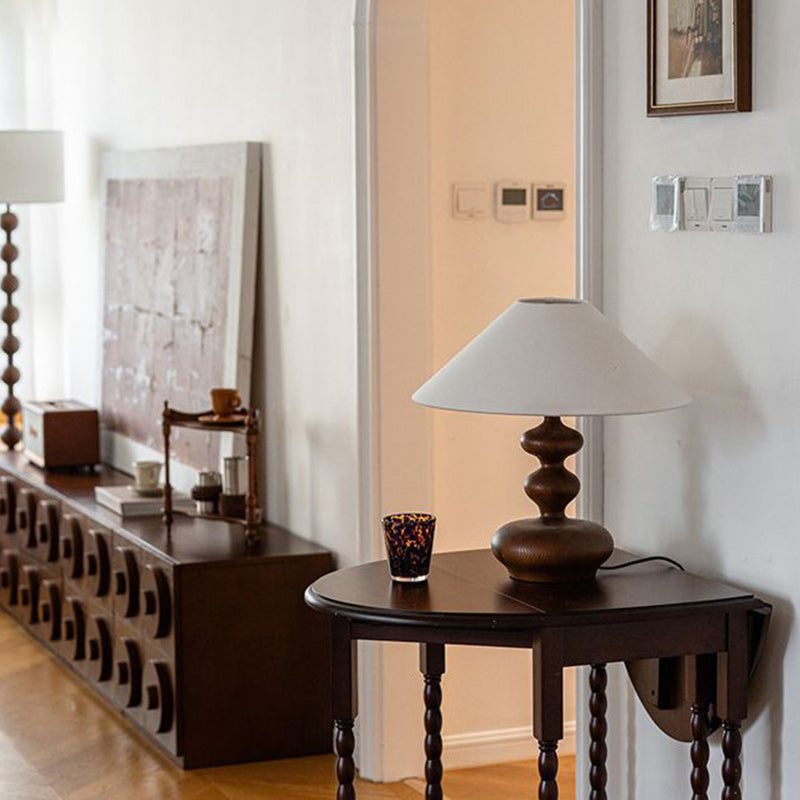 This traditional French-style table lamp features a gourd-shaped ash wood base and a conical fabric shade, showcasing natural walnut wood grain for a warm, vintage look. Perfect for bedrooms or living rooms, the 1-light design adds soft ambiance in classic black or walnut tones.