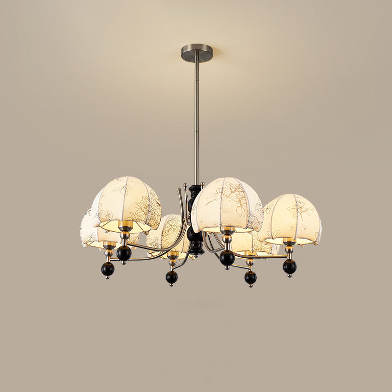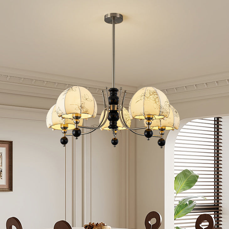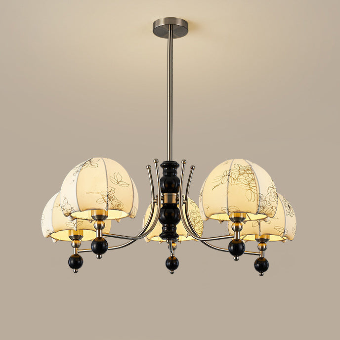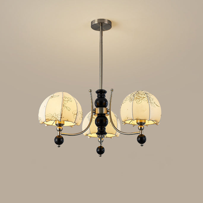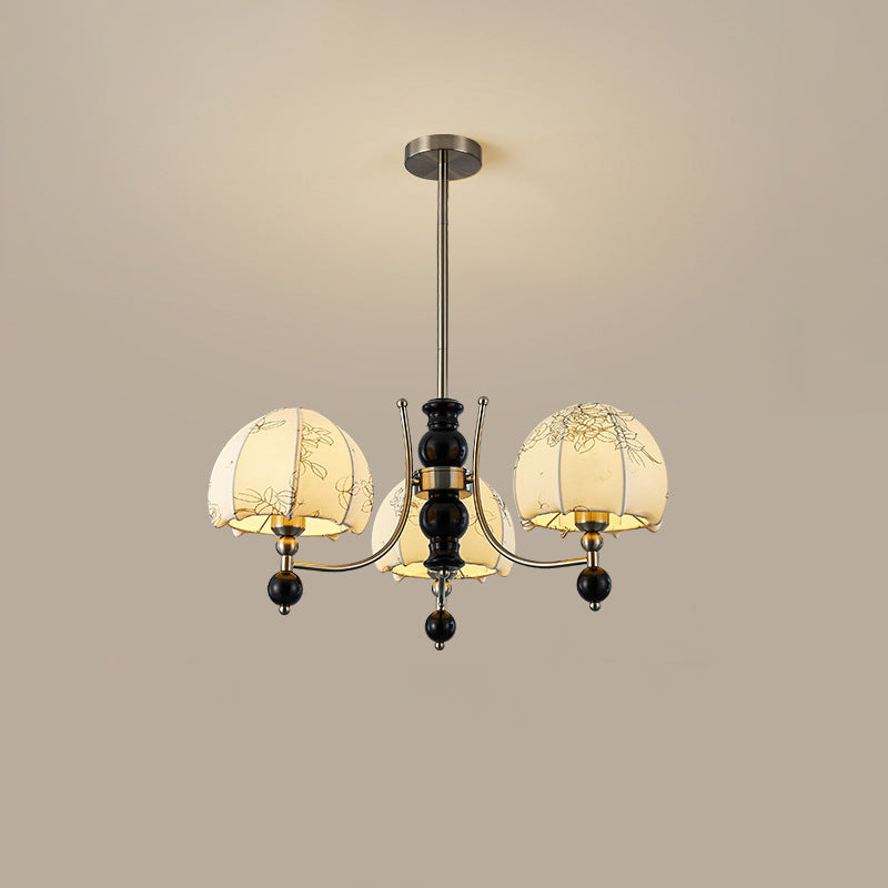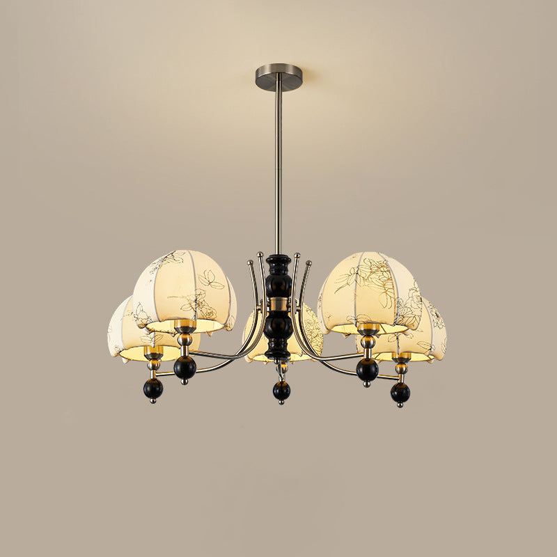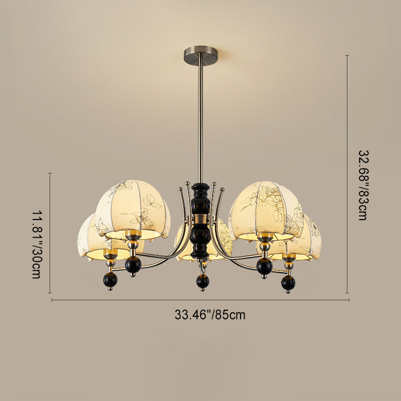 Traditional French Branch Curved Rod Dome Rubber Wood Iron Frame Fabric Shade 3/5/6/8 Light Chandelier For Living Room