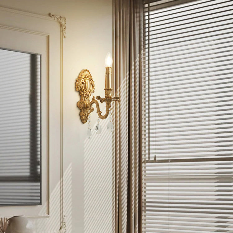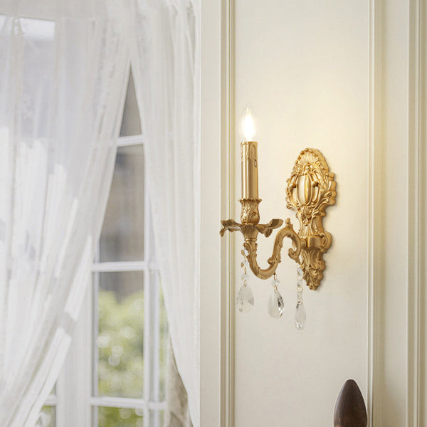 Elegant and timeless, this gold-finished French-style wall sconce features a candle-shaped branch design crafted from solid brass and sparkling K9 crystal. Perfect for bedrooms or living rooms, it adds a touch of vintage luxury to any interior space.