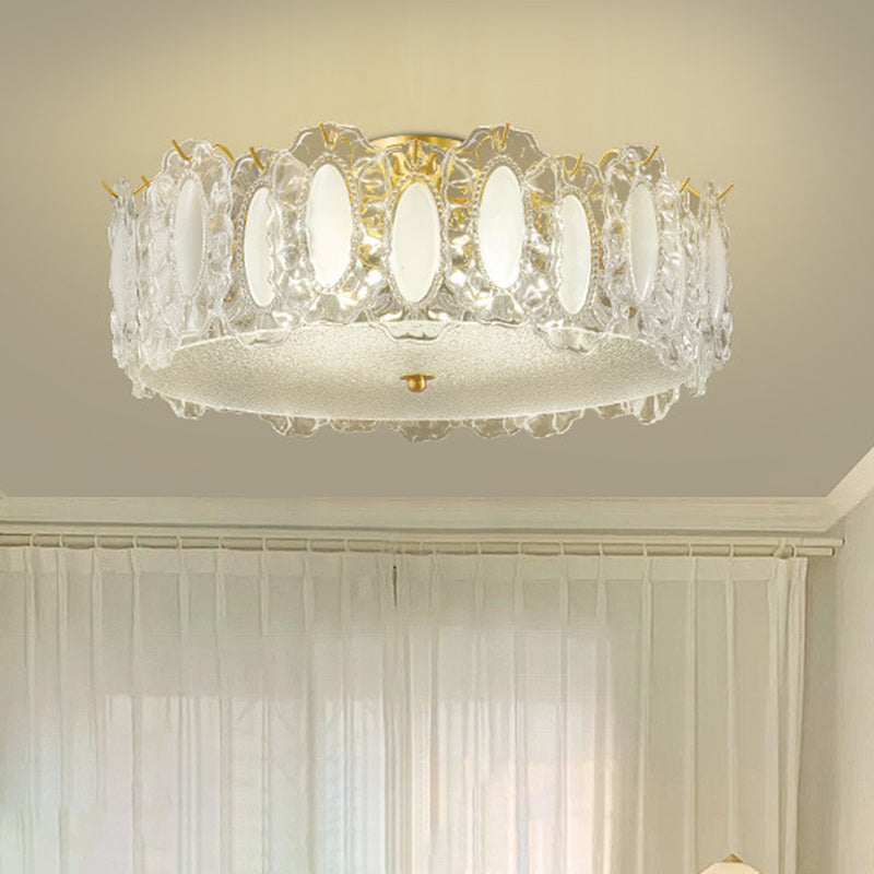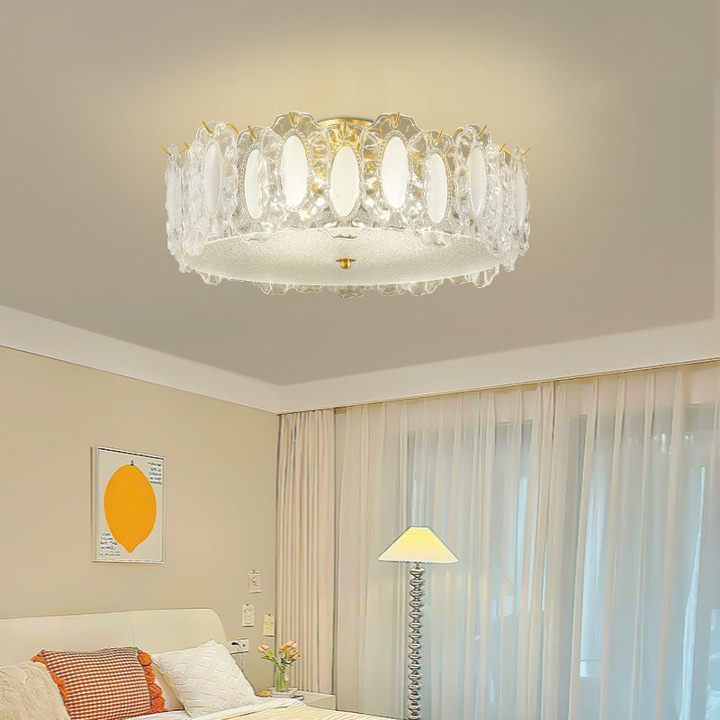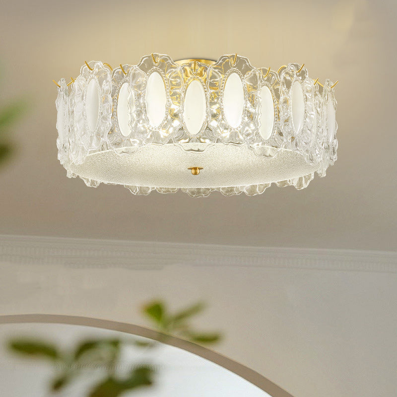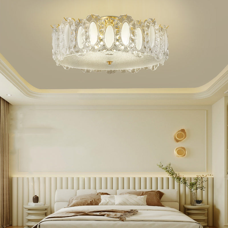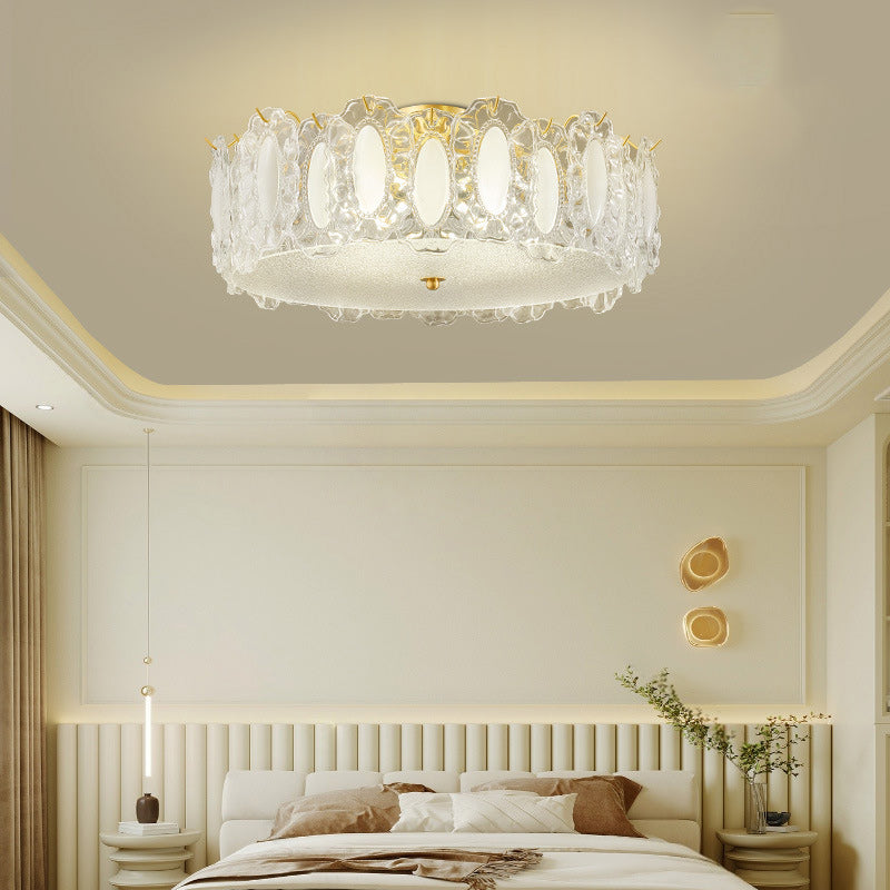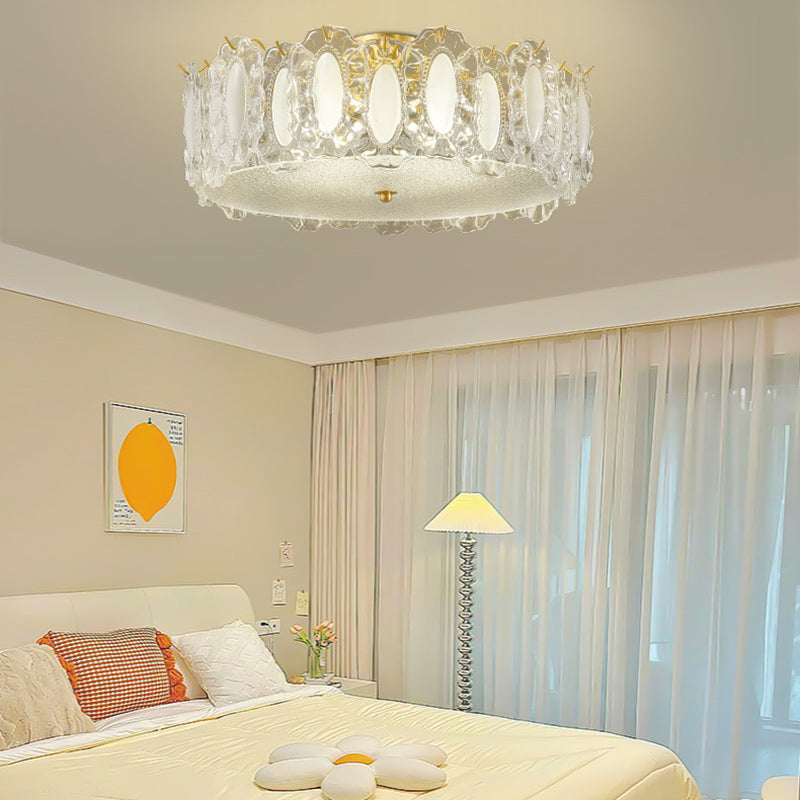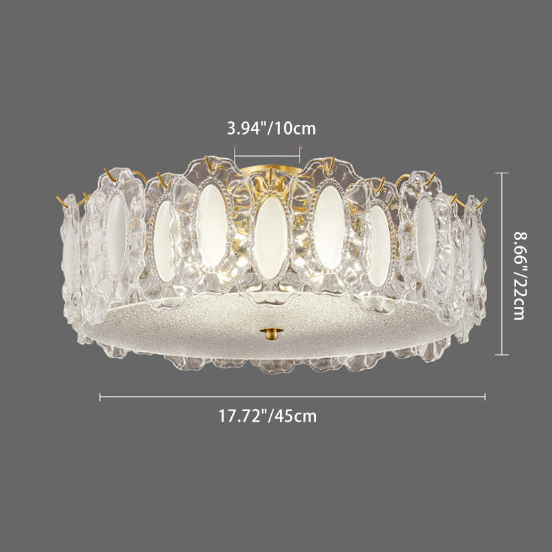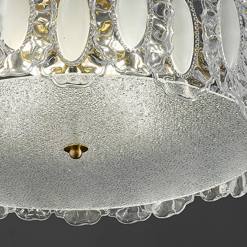 Traditional French Brass Glass Frosted Round Ripple 4/5 Light Semi-Flush Mount Ceiling Light For Bedroom