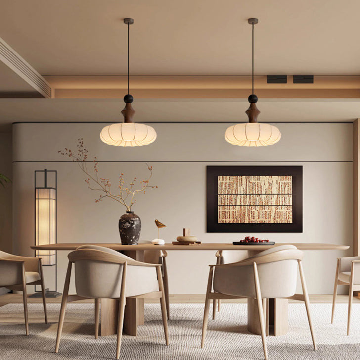 Traditional French Circle Iron Wood Frame Silk Shade 1-Light Pendant Light For Living Room