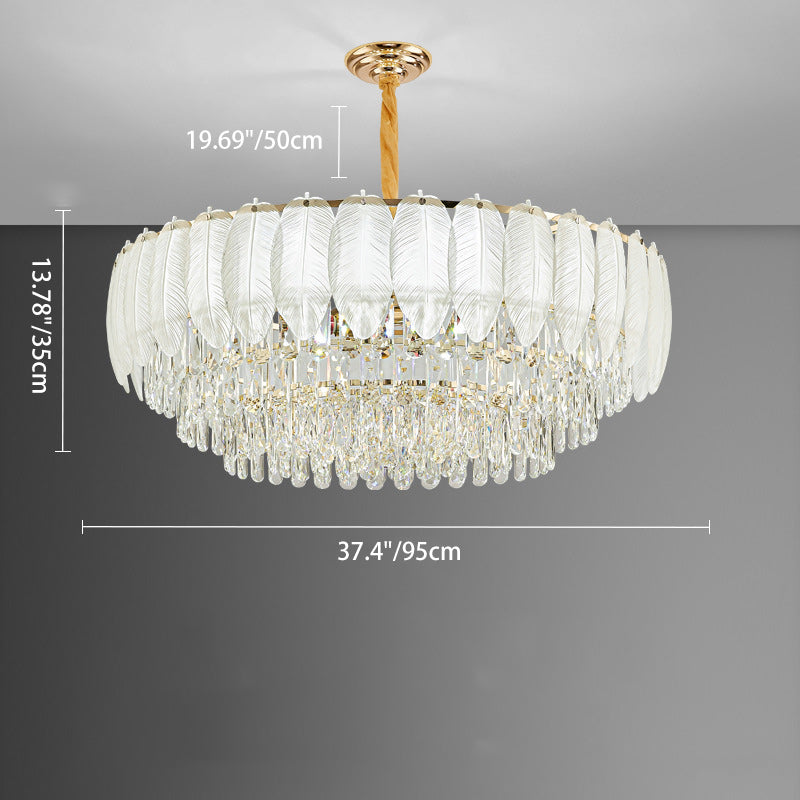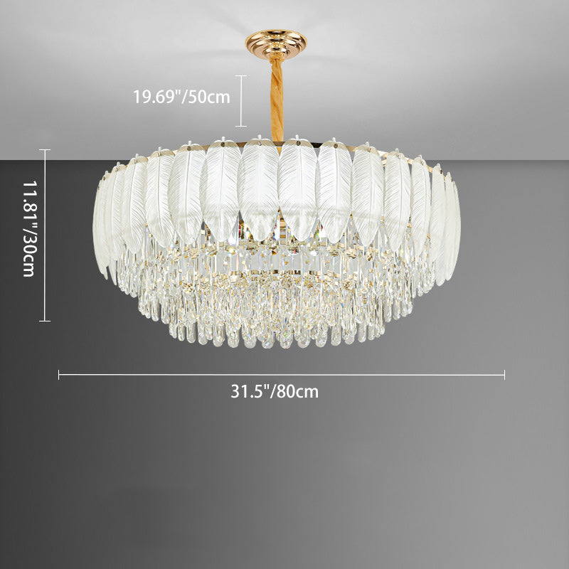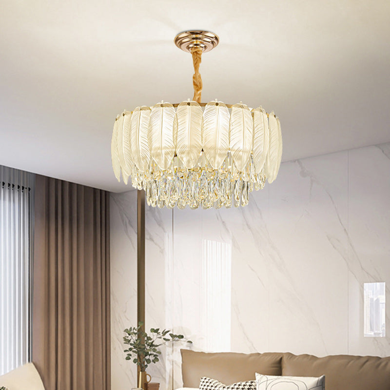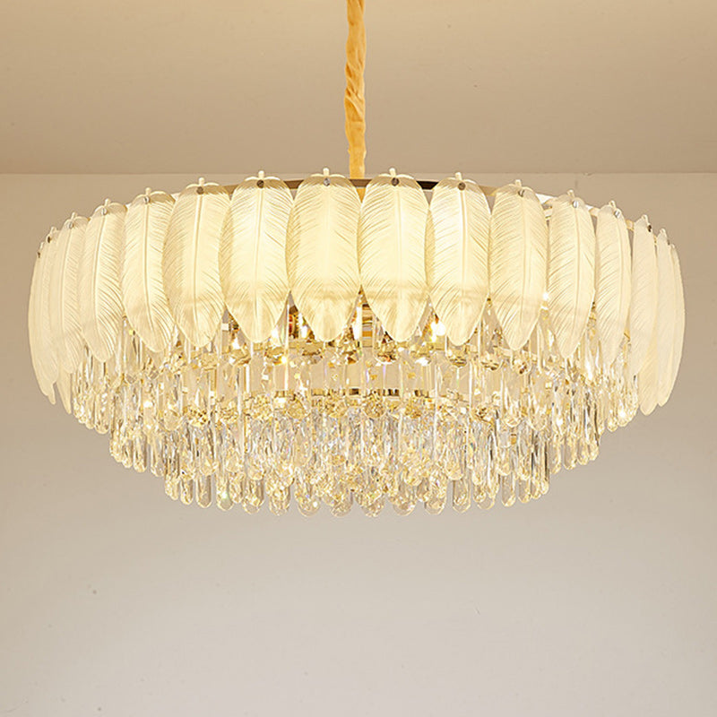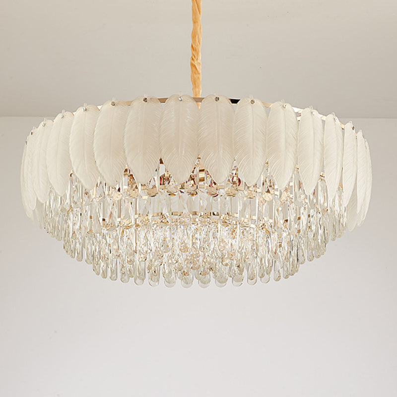 Traditional French Cream Feather Round Iron Crystal 5/8/11/15/21 Light Chandelier For Living Room