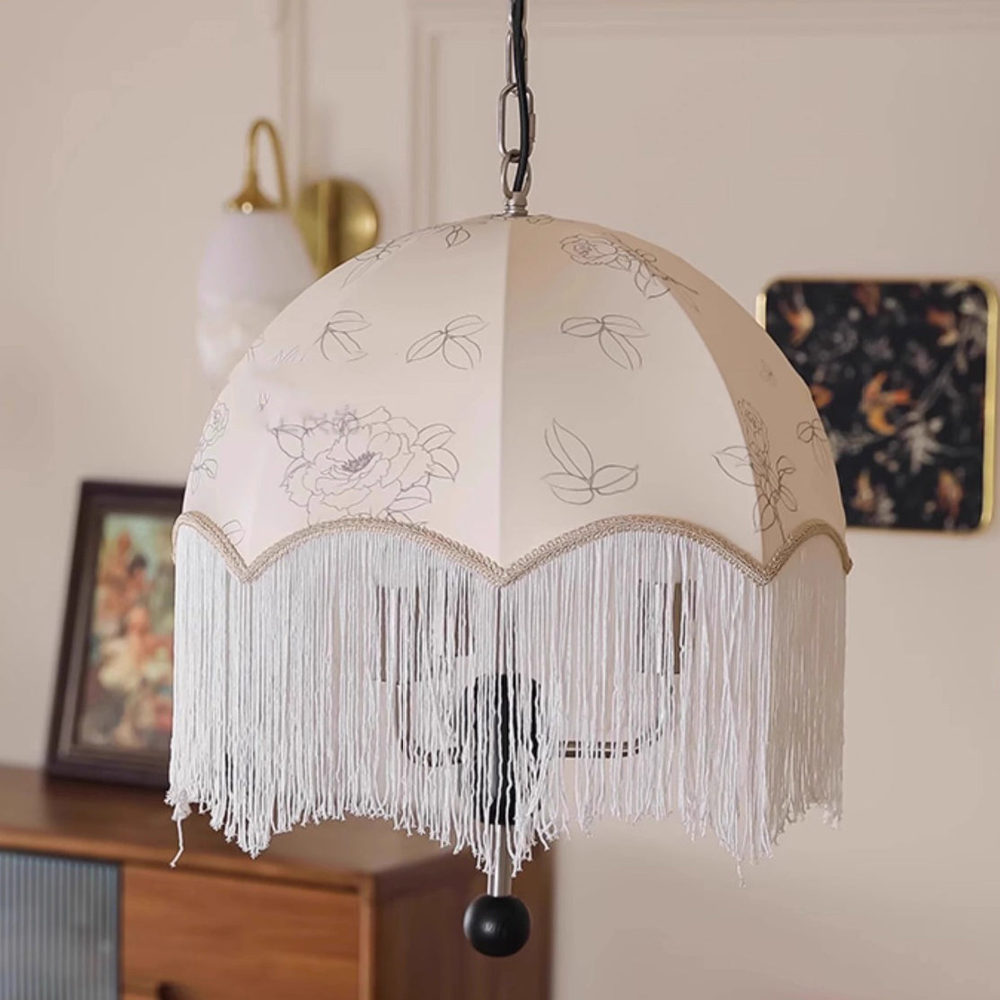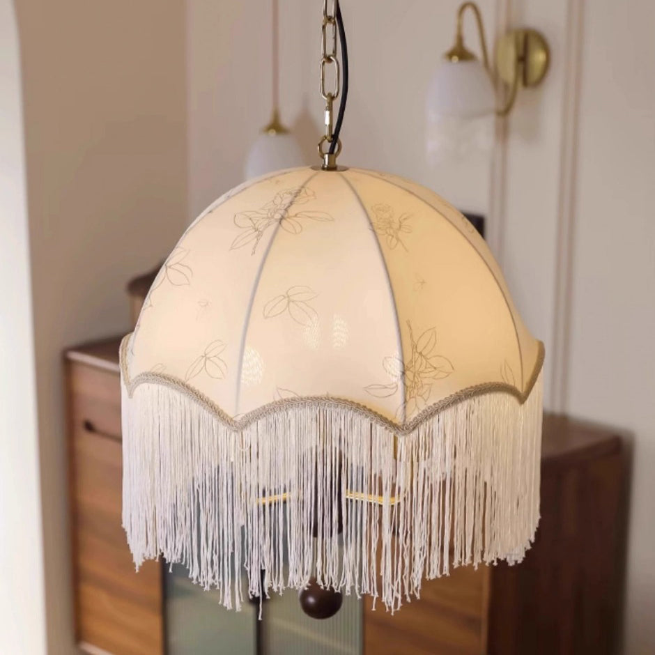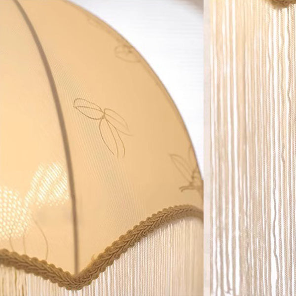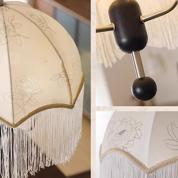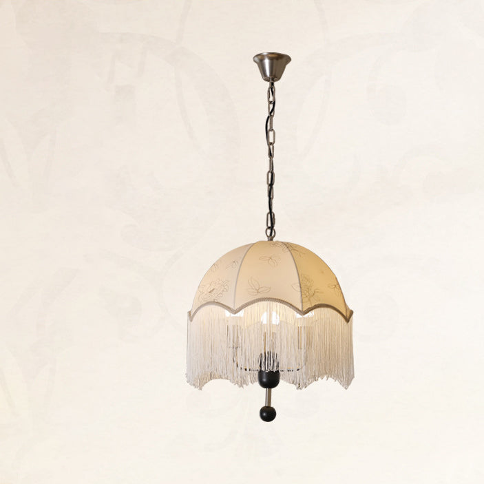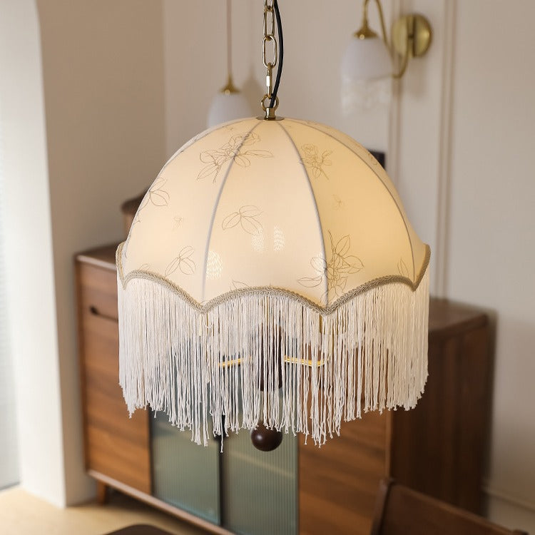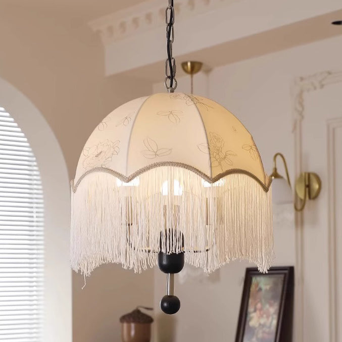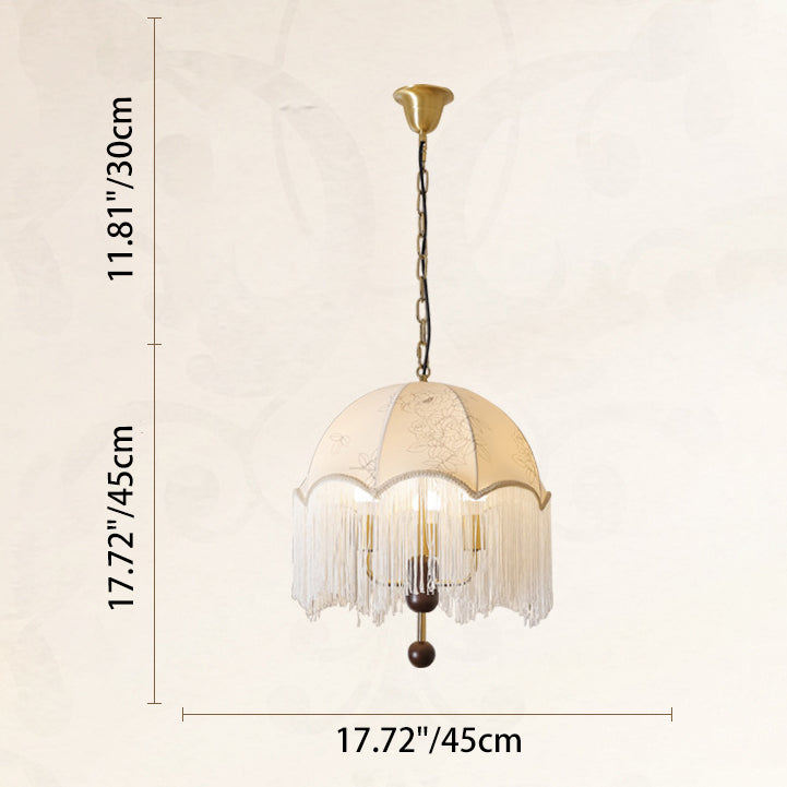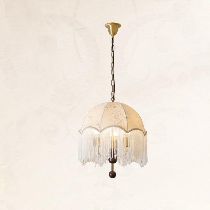 Traditional French Dome Floral Fabric Shade Tassel Wood Metal 3-Light Pendant Light For Living Room