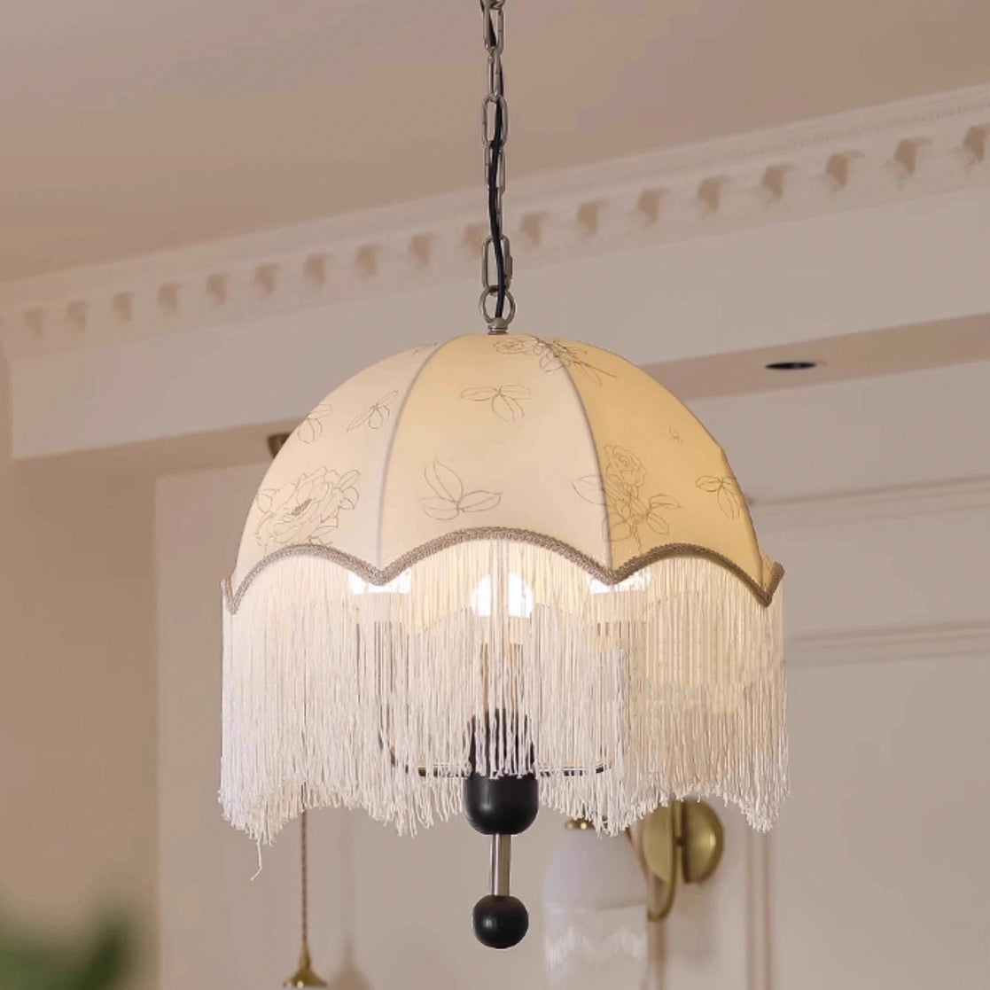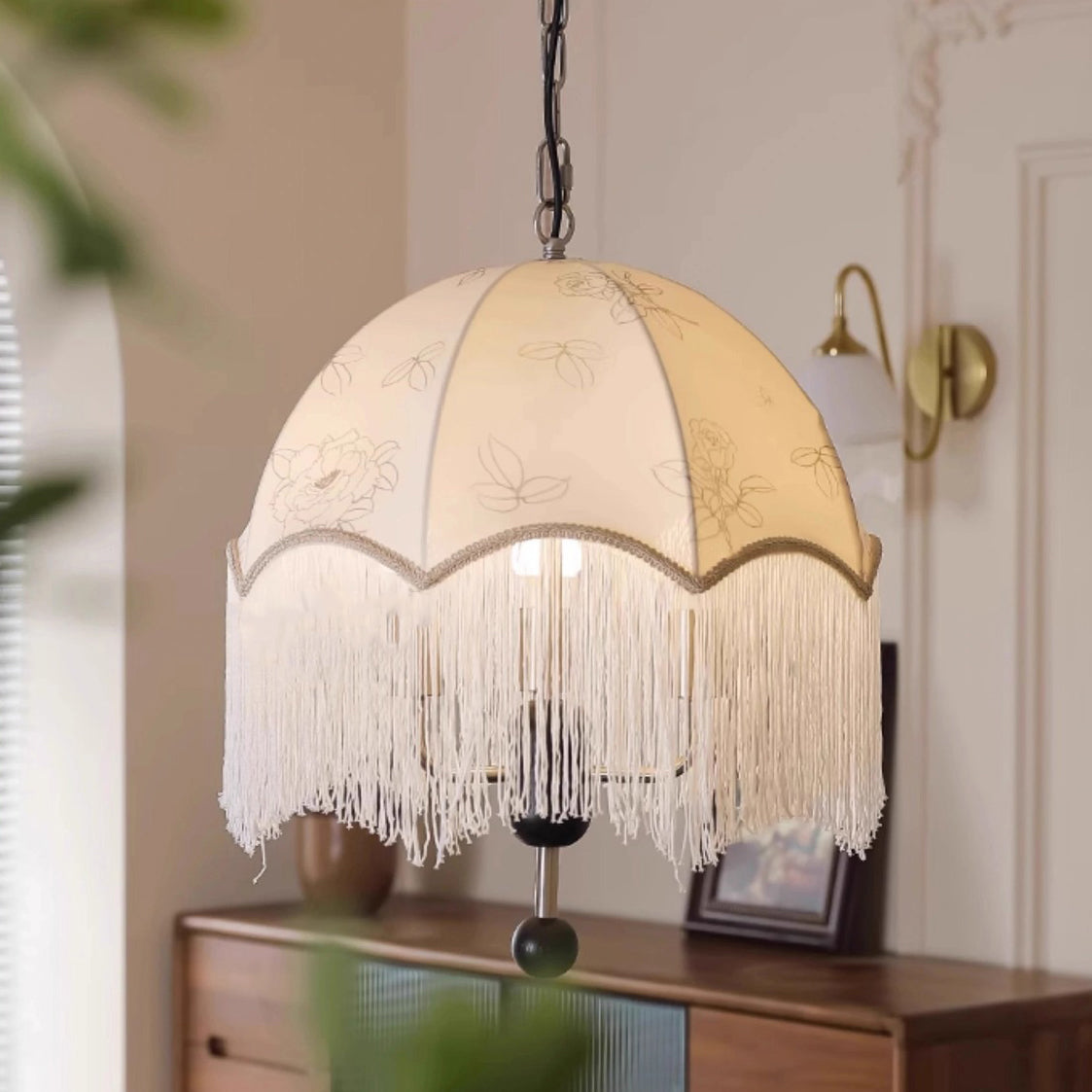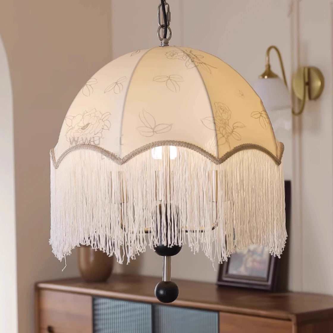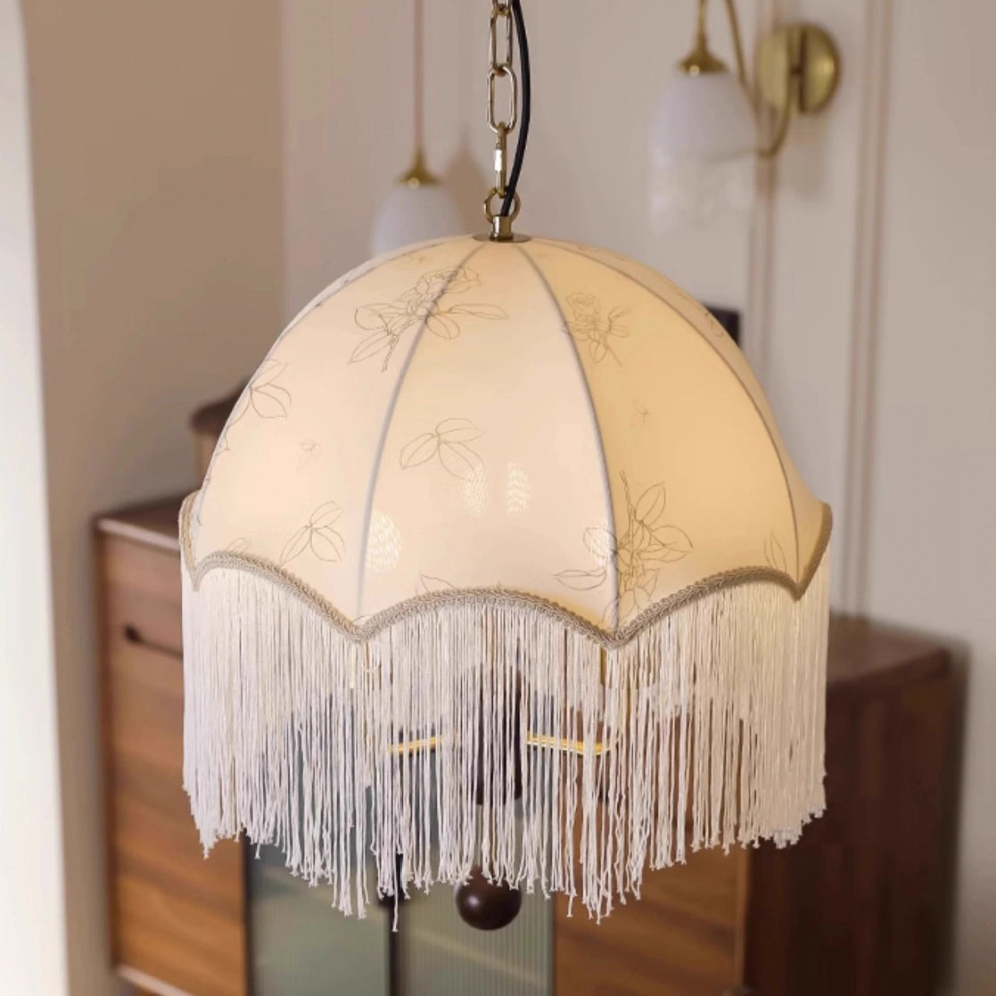 Traditional French Dome Floral Fabric Shade Tassel Wood Metal 3-Light Pendant Light For Living Room