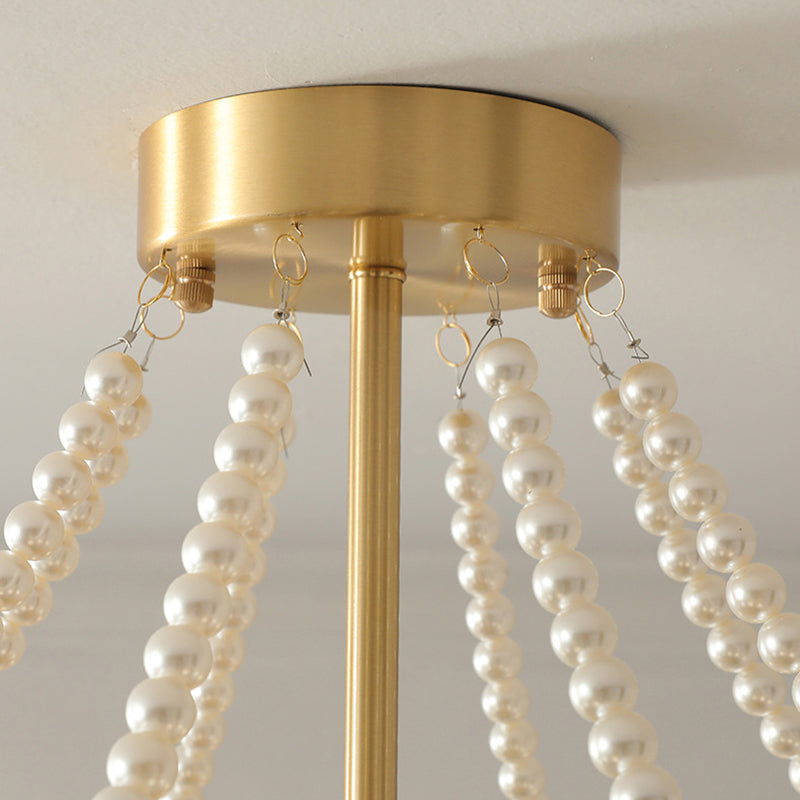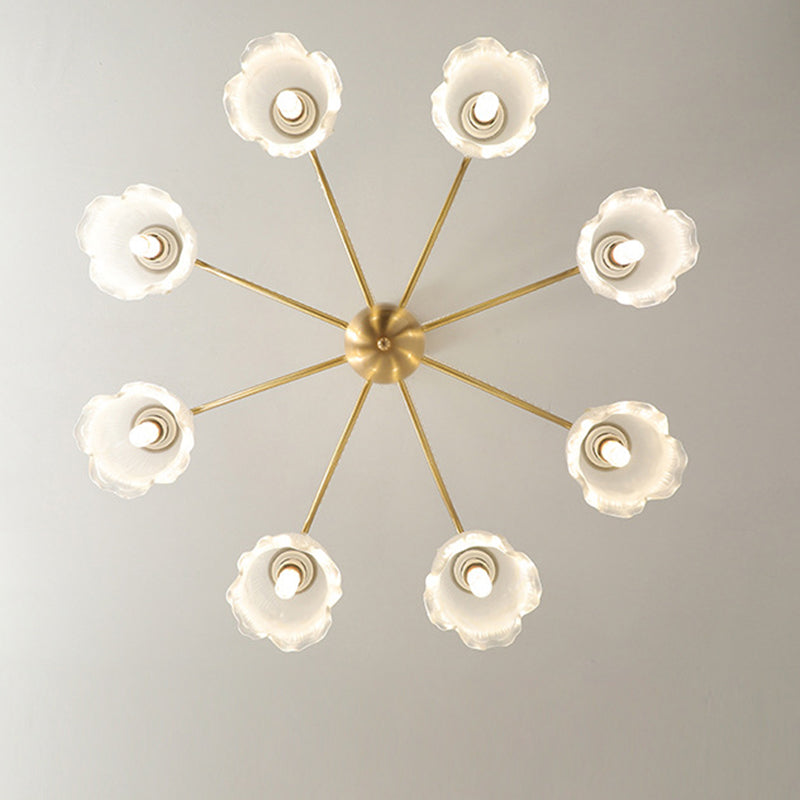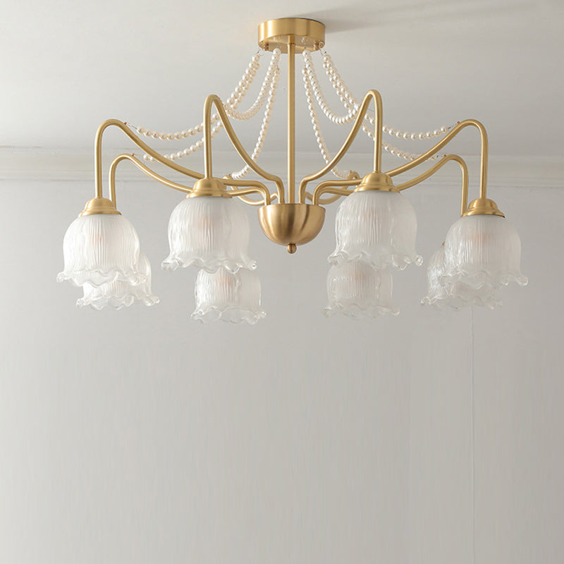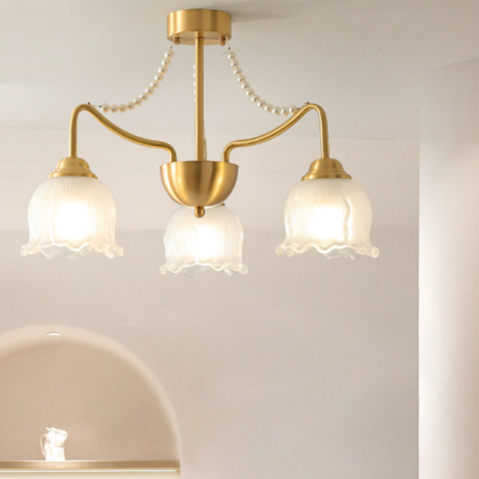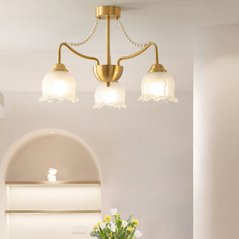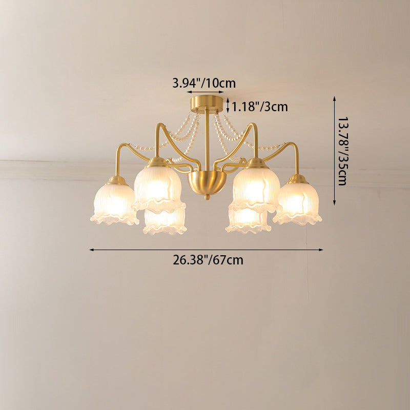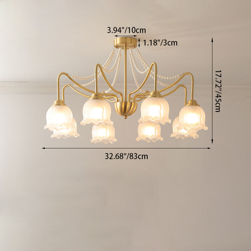 Traditional French Floral Branch Round Glass Pearl Brass 3/6/8 Light Semi-Flush Mount Ceiling Light For Living Room