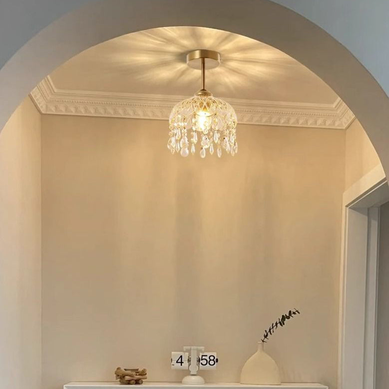 Illuminate your hallway with this elegant French-style ceiling light, featuring a golden dome-shaped crystal tassel shade and high-transparency glass. With its luxurious crystal accents and vintage charm, this 1-light semi-flush mount adds refined ambiance to any entryway or corridor.