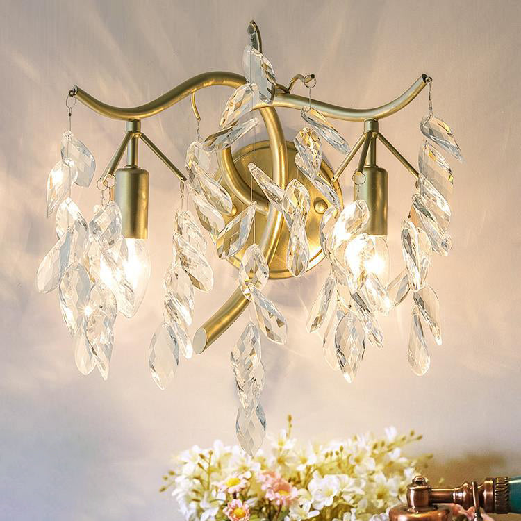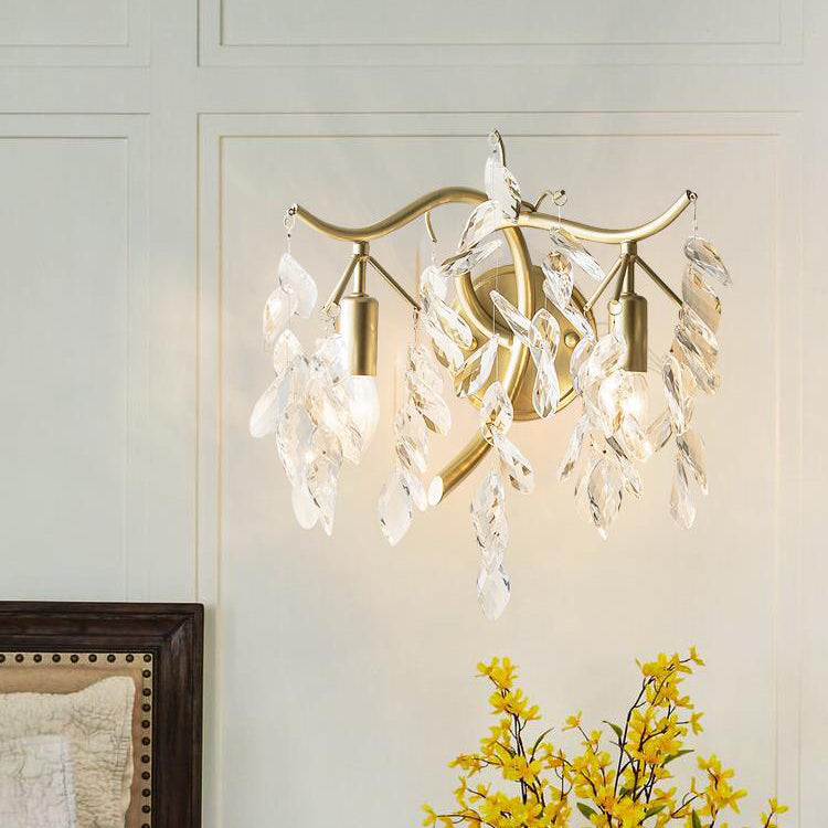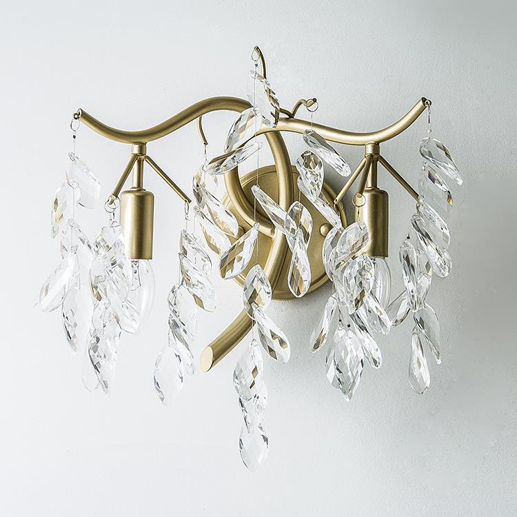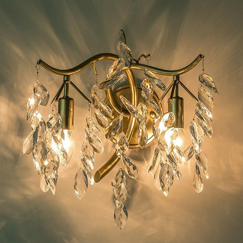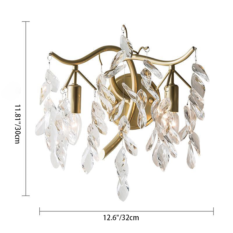 Traditional French Leaf Iron Copper Crystal 2-Light Wall Sconce Lamp For Living Room