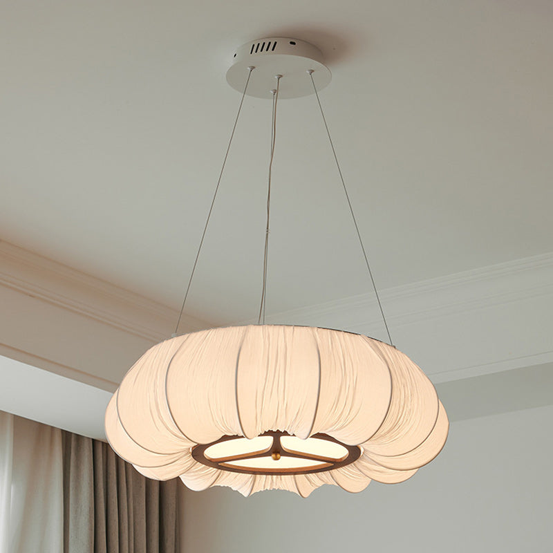 Traditional French Round Fabric Lampshade Iron Solid Wood LED Chandeliers For Living Room