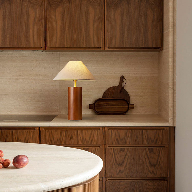 Traditional Japanese Cylindrical Trapezoidal Solid Wood Base Brass Frame Fabric Shade 1-Light Table Lamp For Bedroom