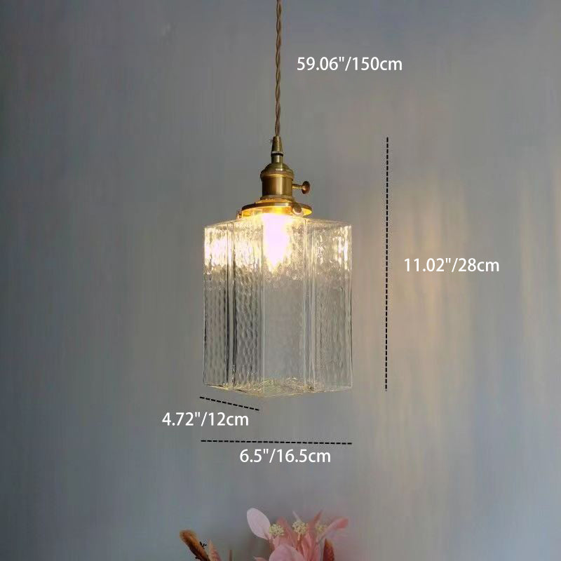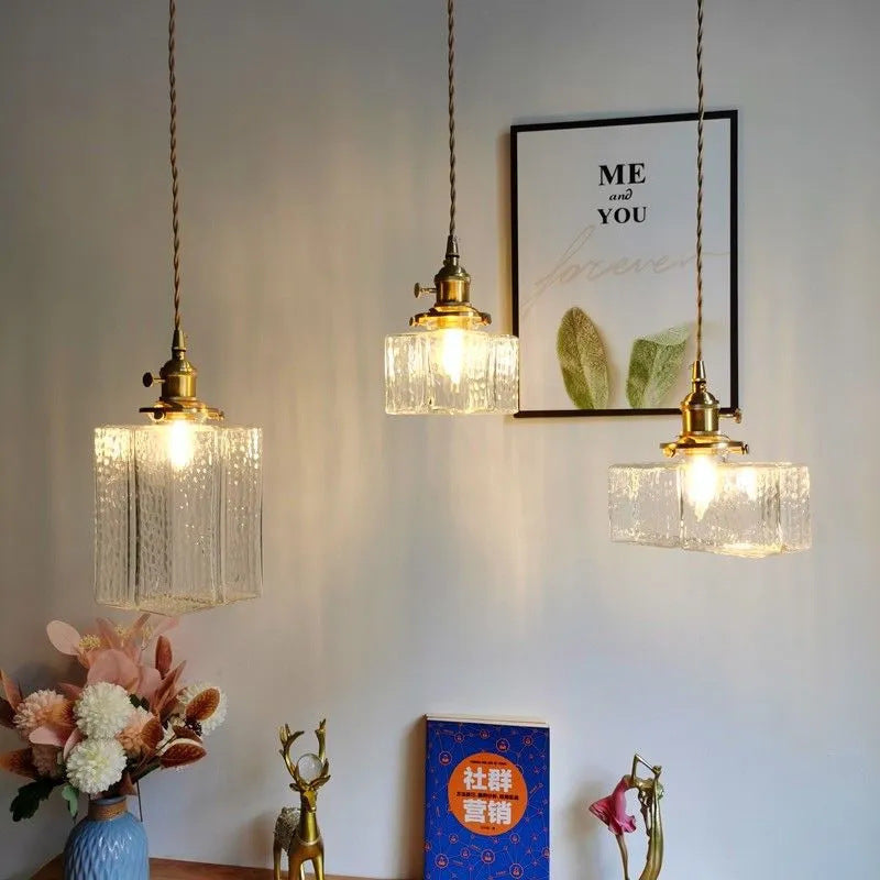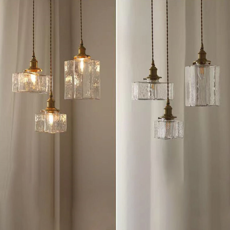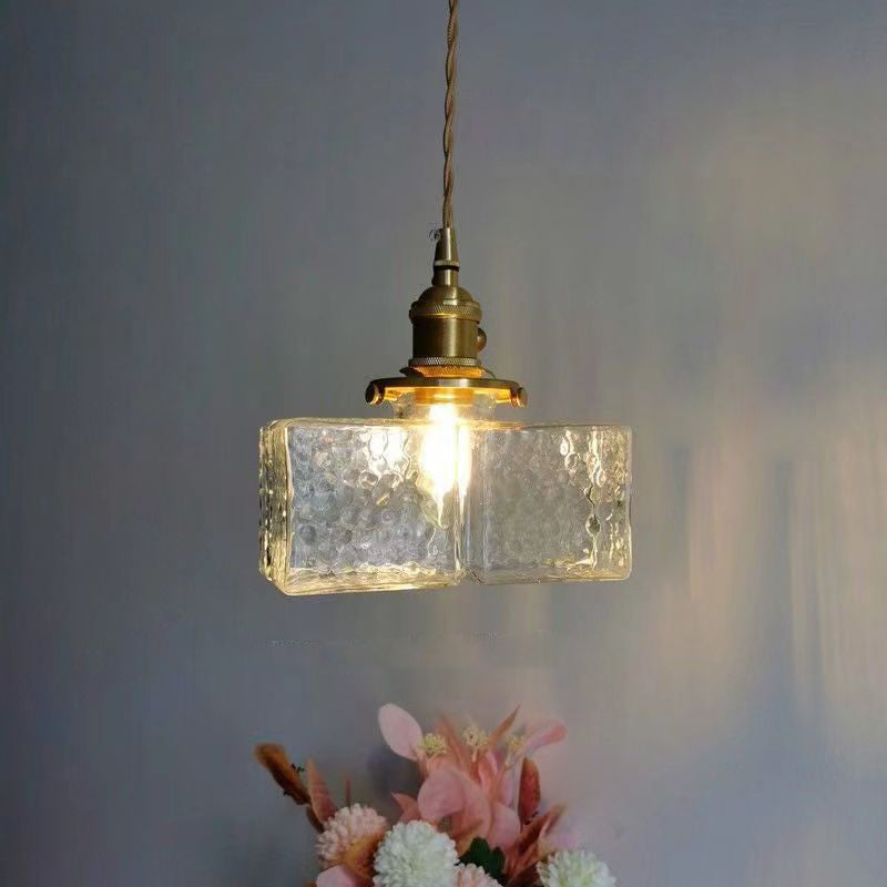 Traditional Japanese Glass Cube Shade Brass 1-Light Pendant Light For Living Room
