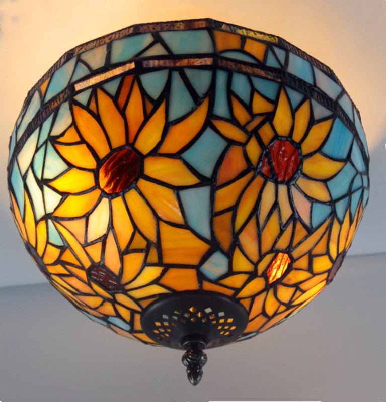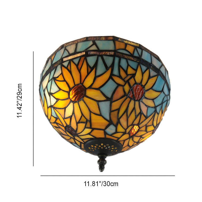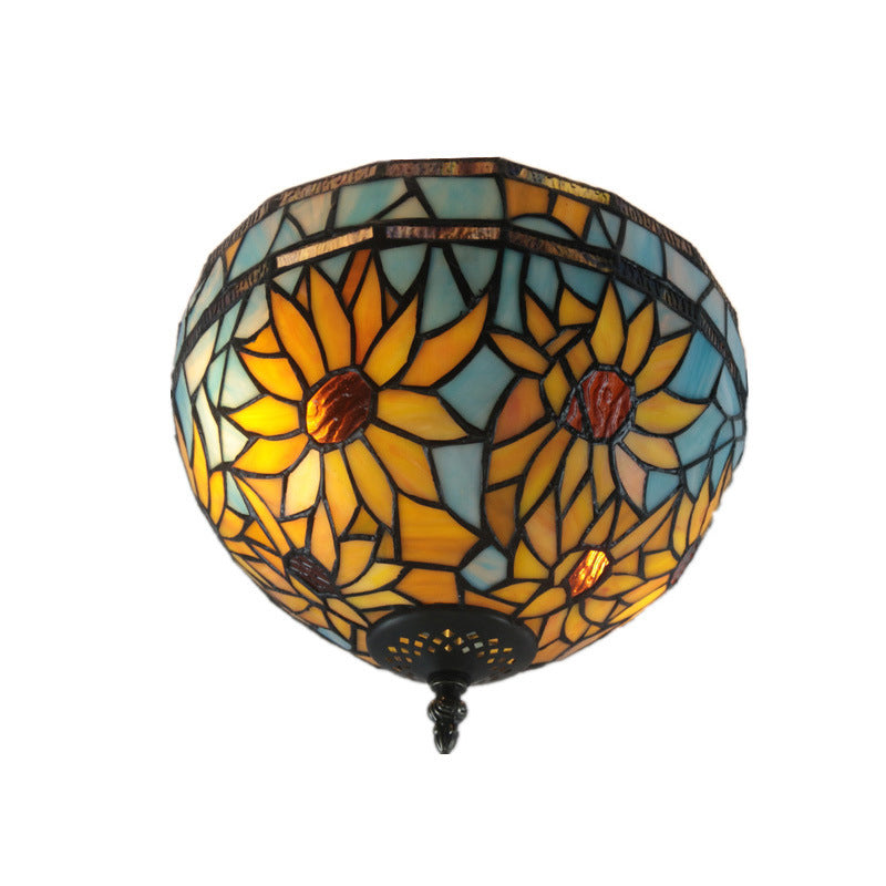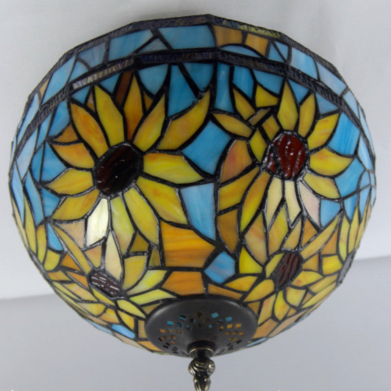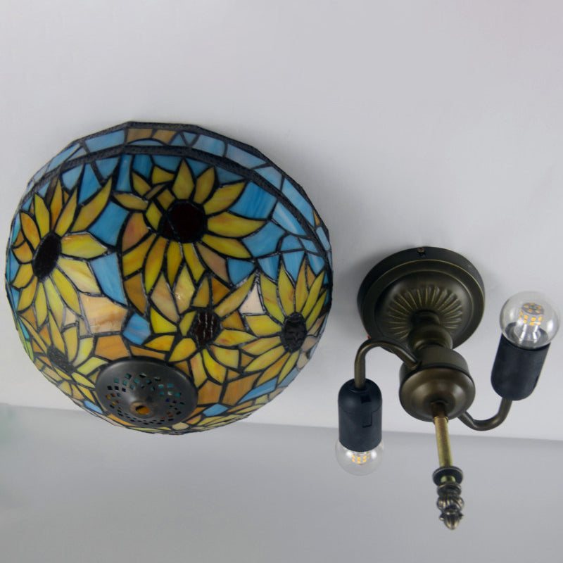 Traditional Tiffany Dome Sunflower Iron Glass 2-Light Semi-Flush Mount Ceiling Light For Hallway