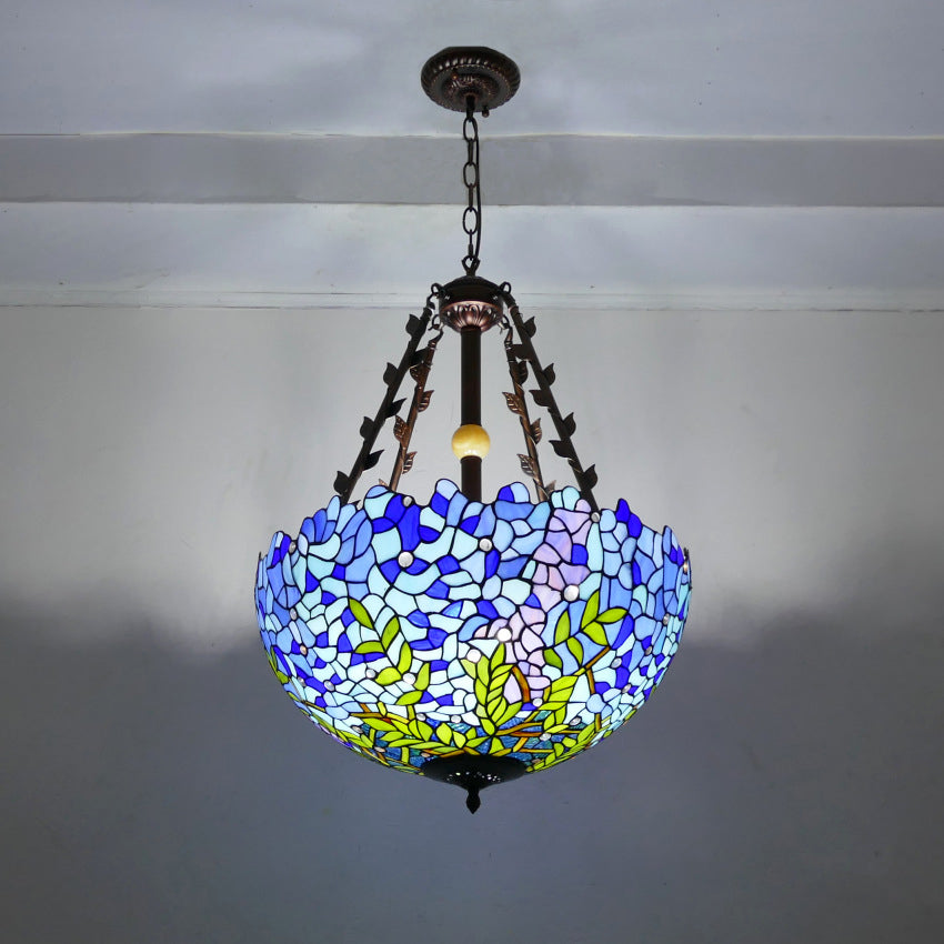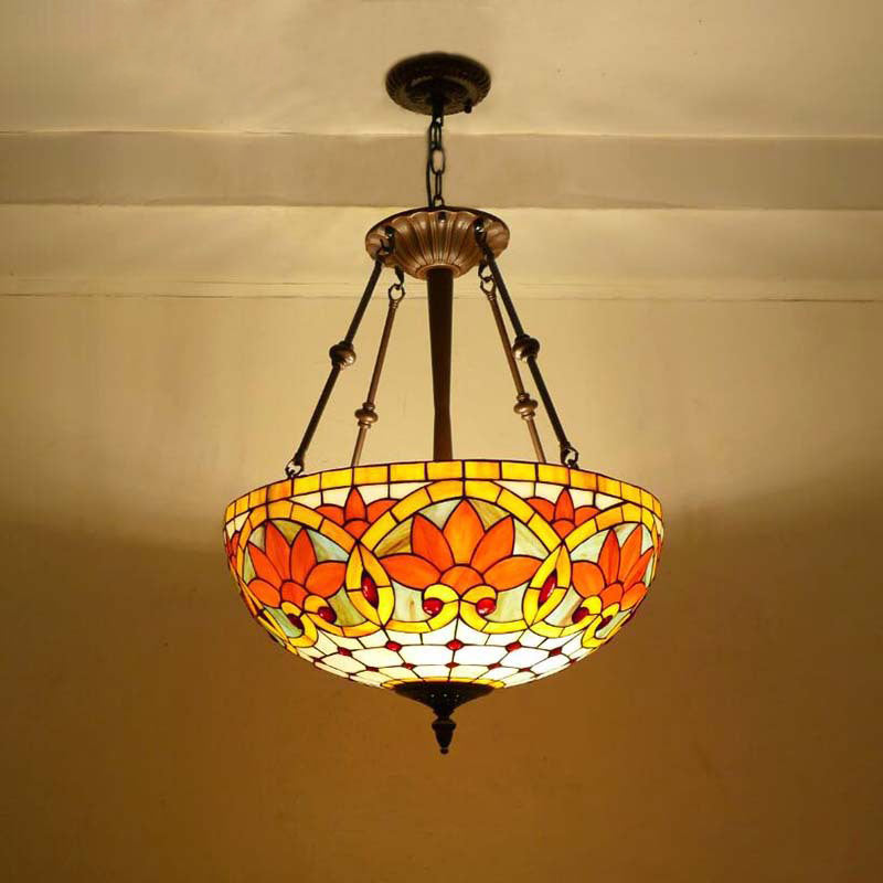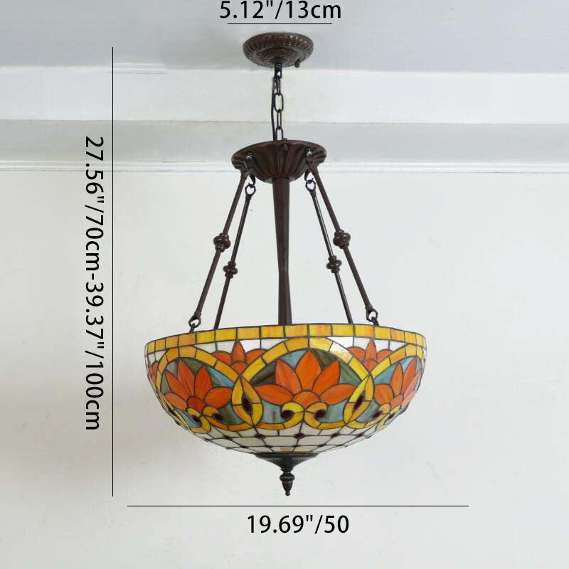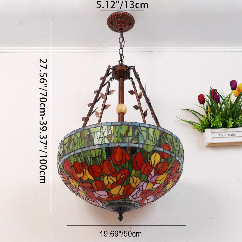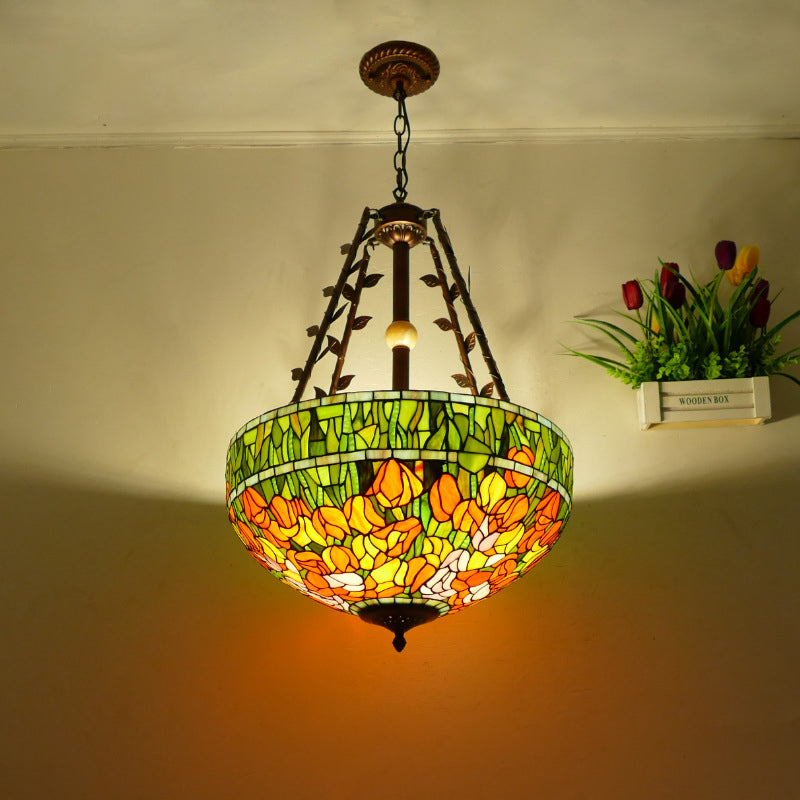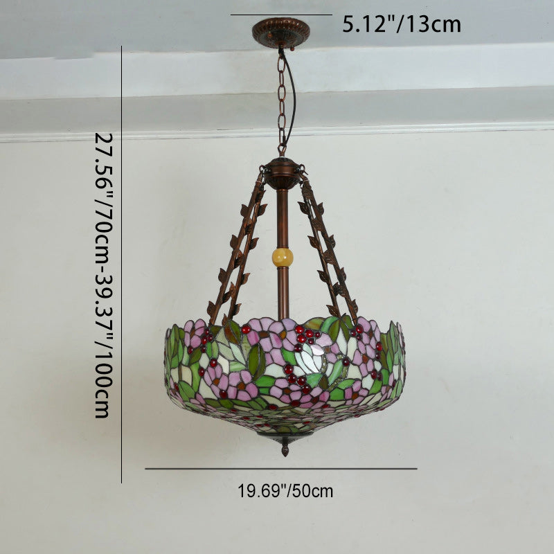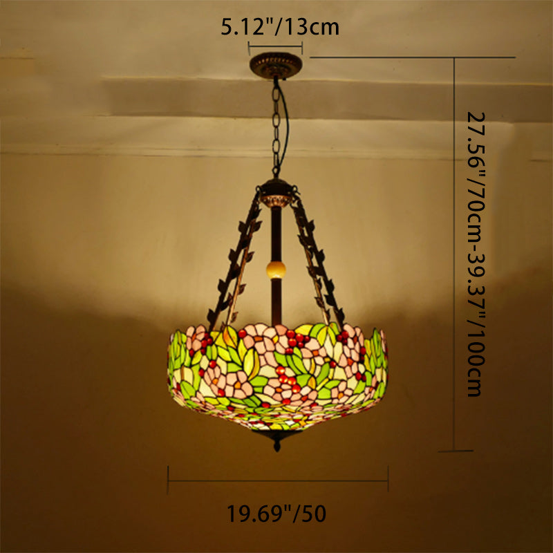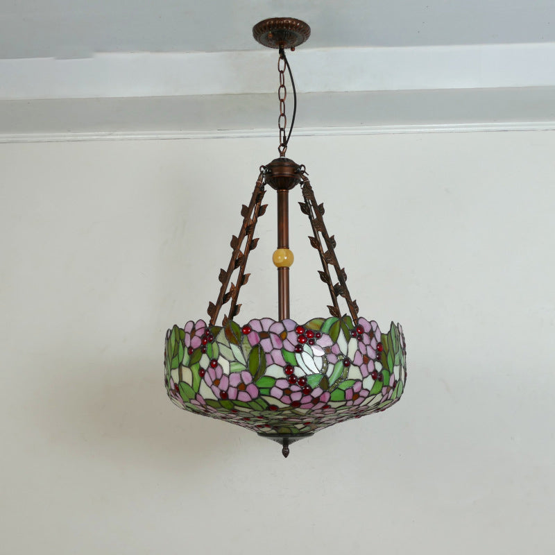 Traditional Tiffany Flower Round Basin Shape Metal Stained Glass 5-Light Pendant Light For Bedroom