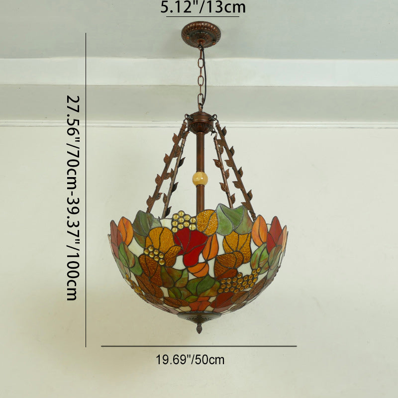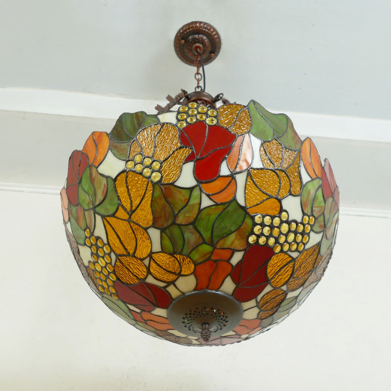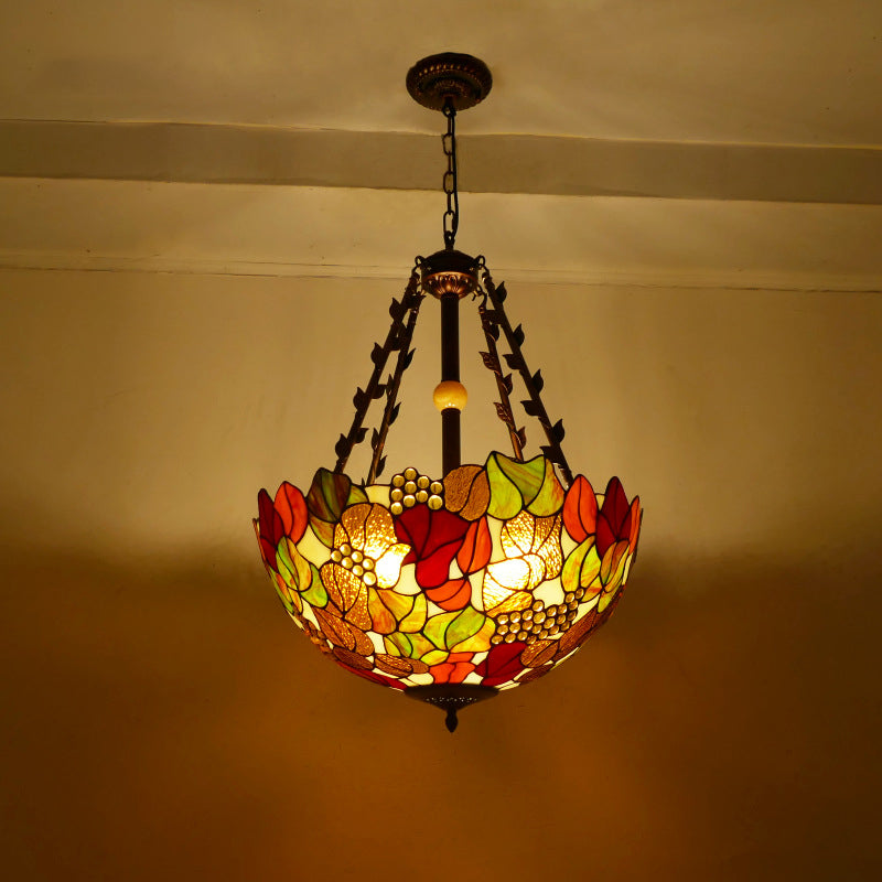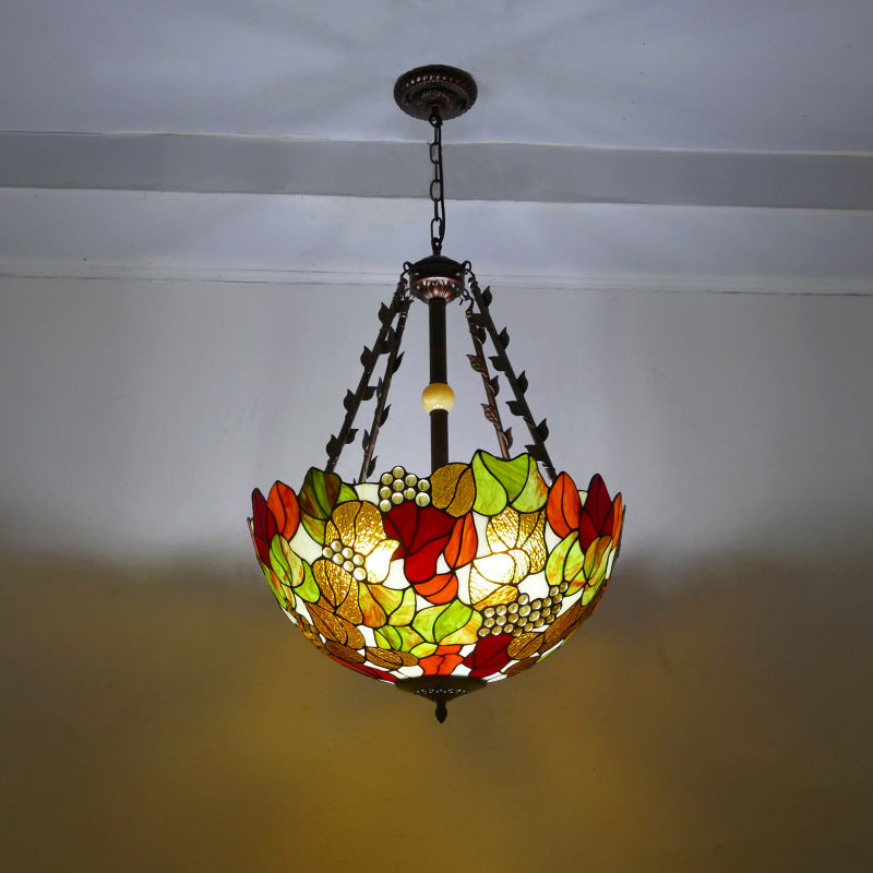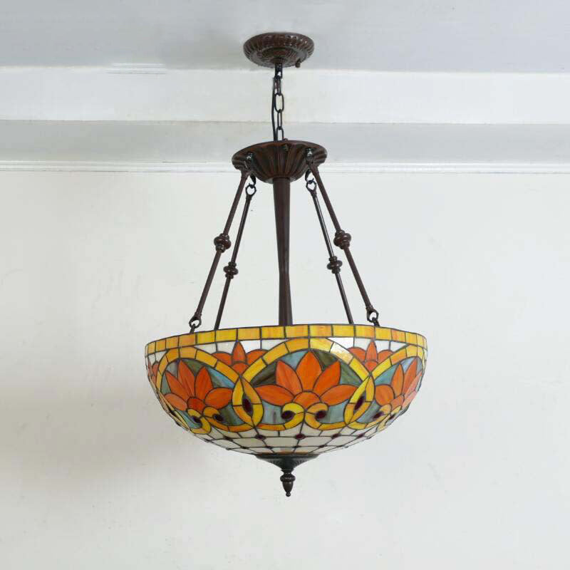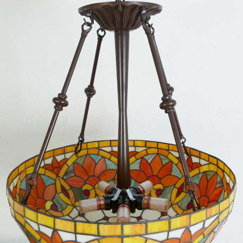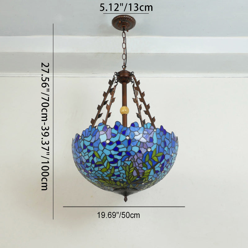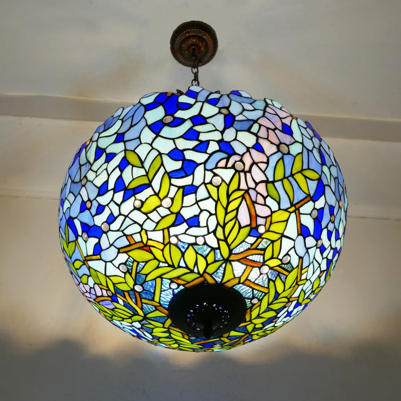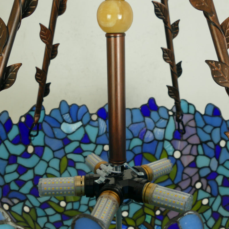 Traditional Tiffany Flower Round Basin Shape Metal Stained Glass 5-Light Pendant Light For Bedroom