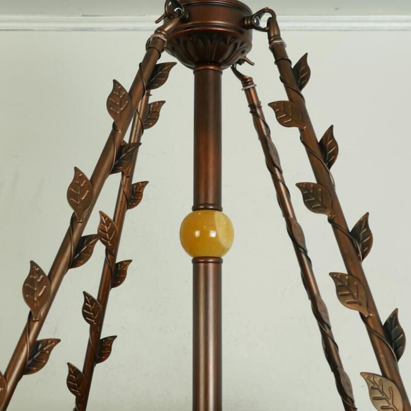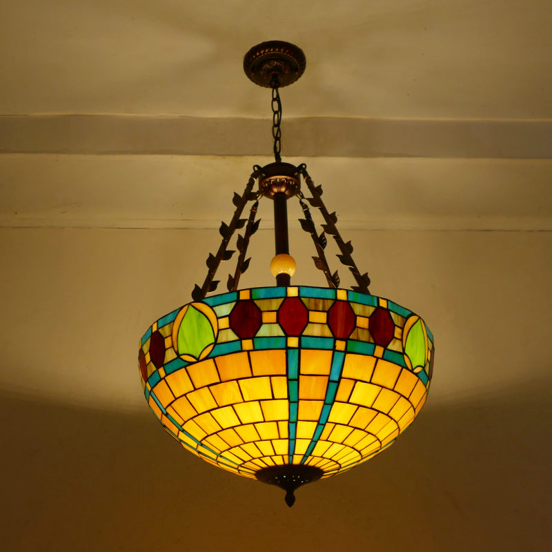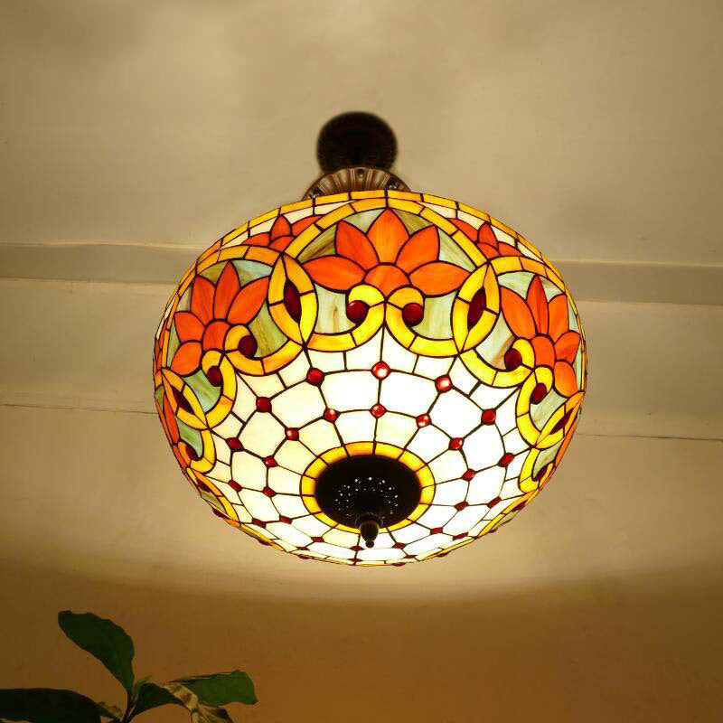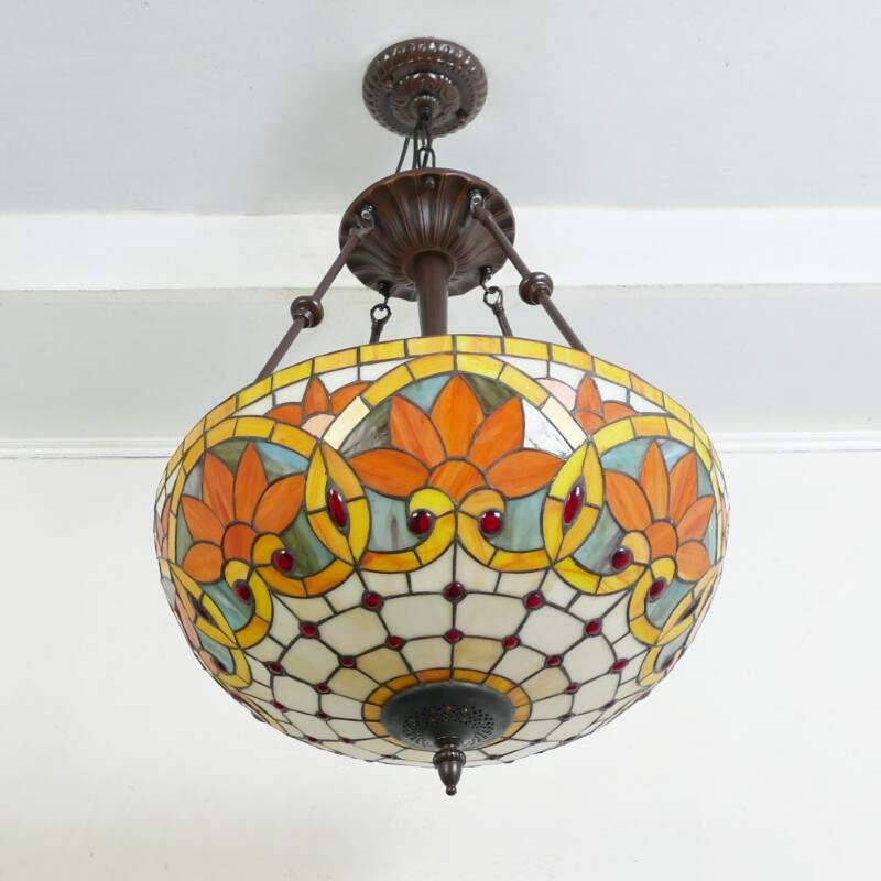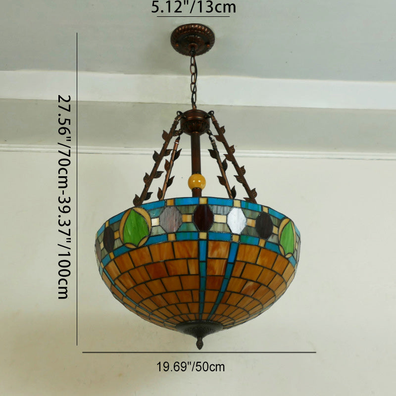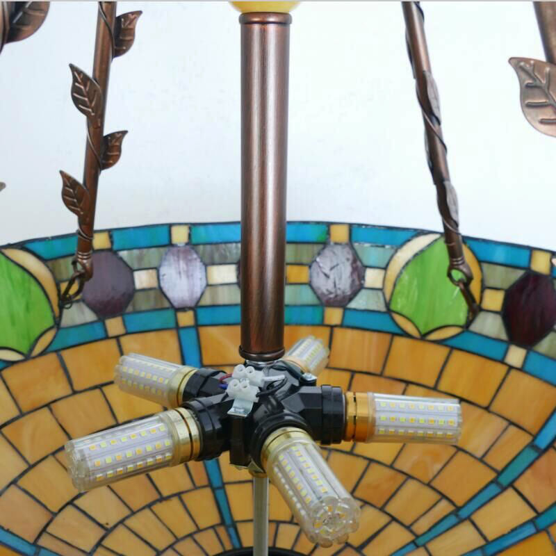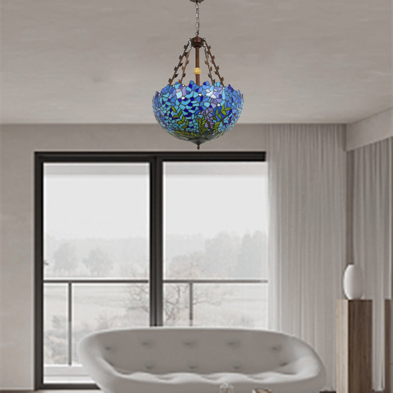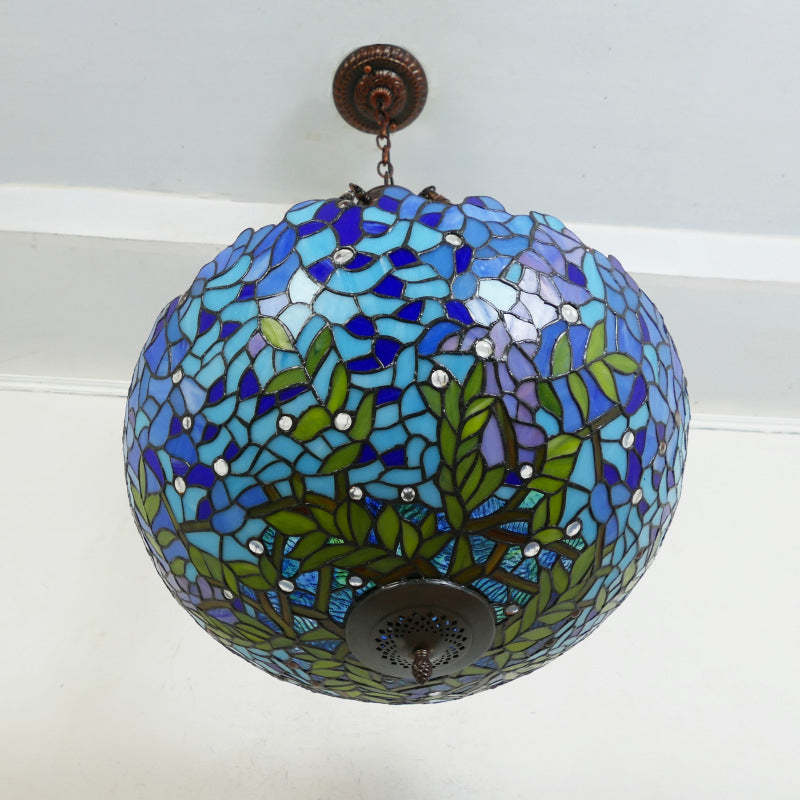 Traditional Tiffany Flower Round Basin Shape Metal Stained Glass 5-Light Pendant Light For Bedroom