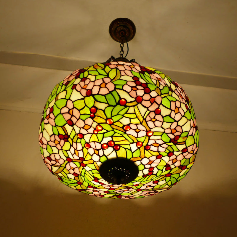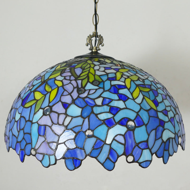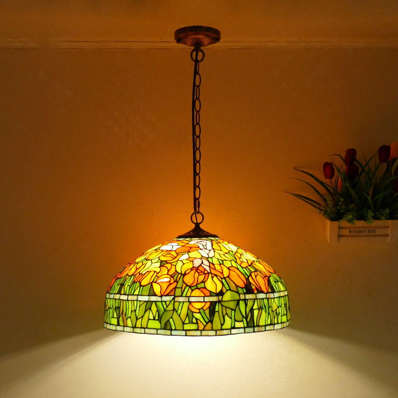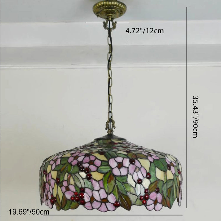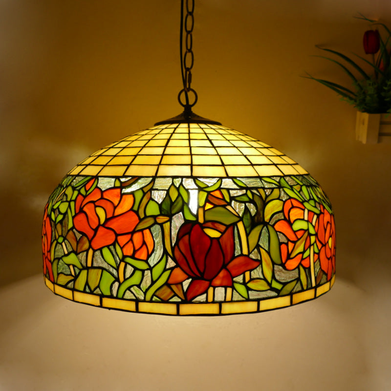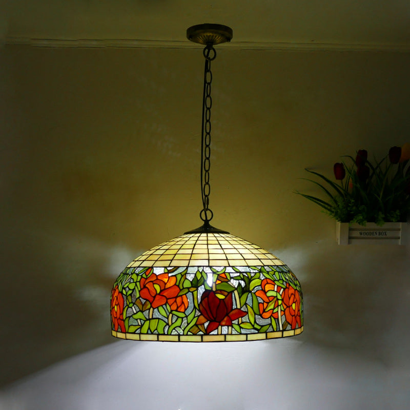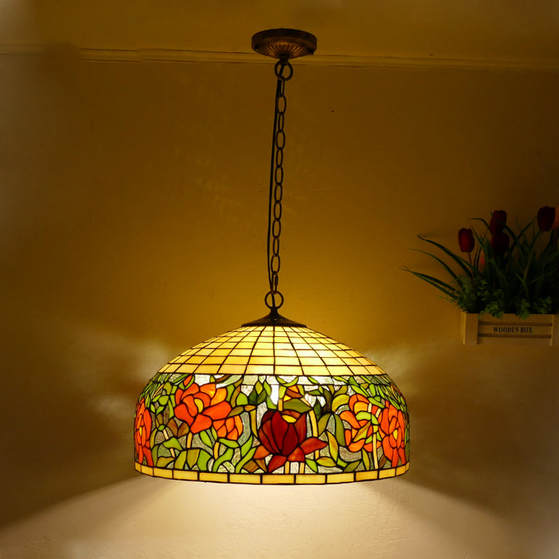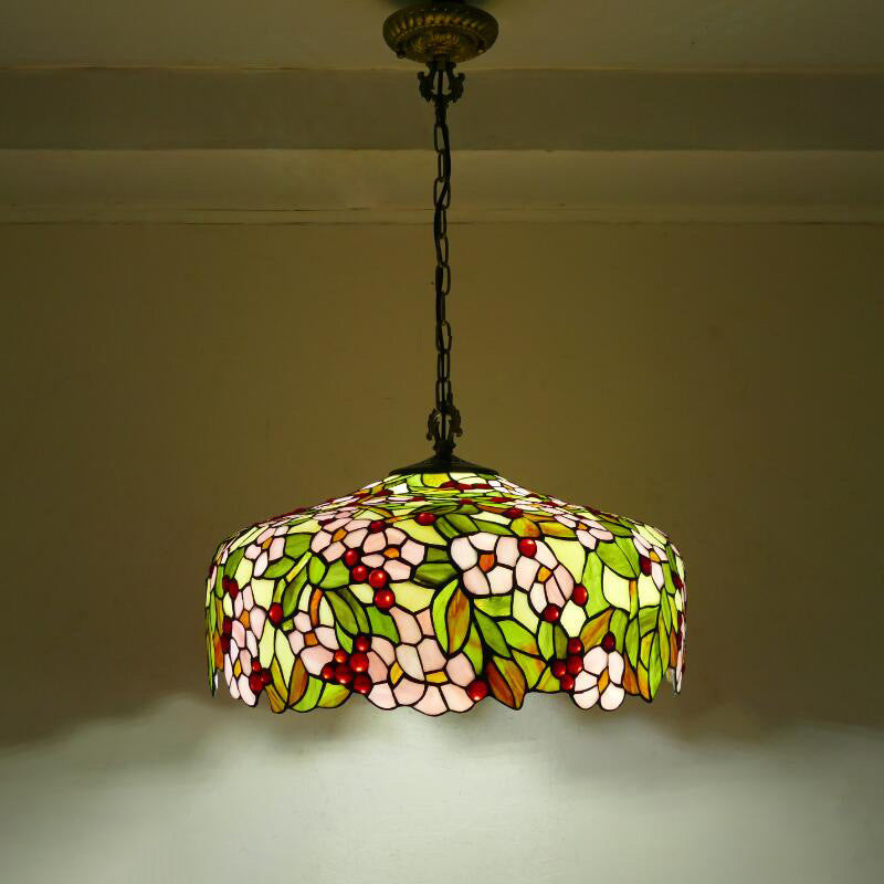 Traditional Tiffany Flower Round Cone Metal Stained Glass 3-Light Pendant Light For Bedroom