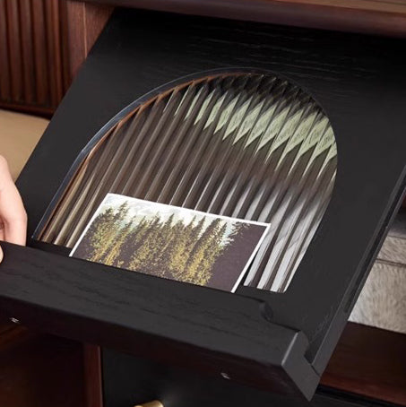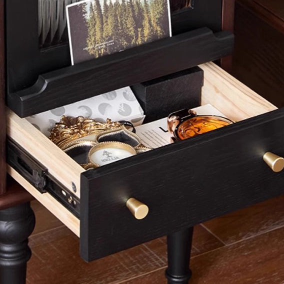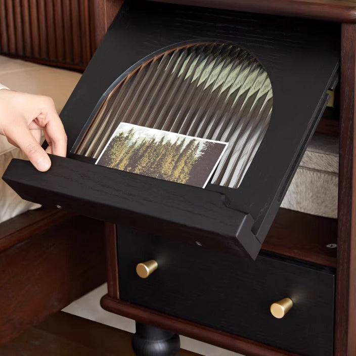 Crafted from ash wood and glass, this traditional vintage nightstand features a unique blend of round and square shapes with flowing natural textures. Finished in rich brown, it offers a single drawer and ample storage space—perfect for adding elegance and function to any bedroom.